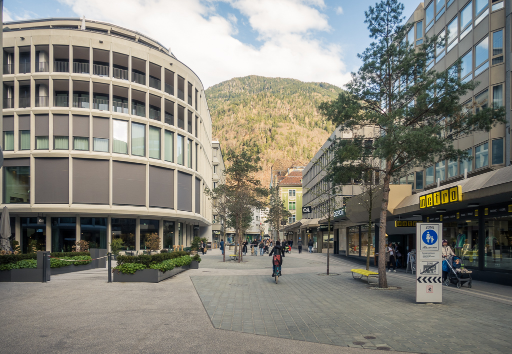 Hinter Trimmis dann eine schöne Passage über offene Weidehänge und durch den Fürstenwald. Begegnungen mit Joggern und Spaziergängern häuften sich, die zunehmende Annäherung an die Stadt Chur wurde deutlich spürbar. Ich erreichte das Stadtgebiet bei einem illustren Villenviertel am Nordrand. Dann ging es durch den Feierabendverkehr zügig hinab mitten ins Stadtzentrum und am Bahnhof vorbei wieder zum Ausgangspunkt am Rossboden.