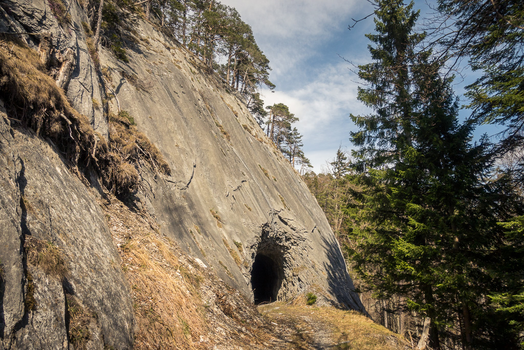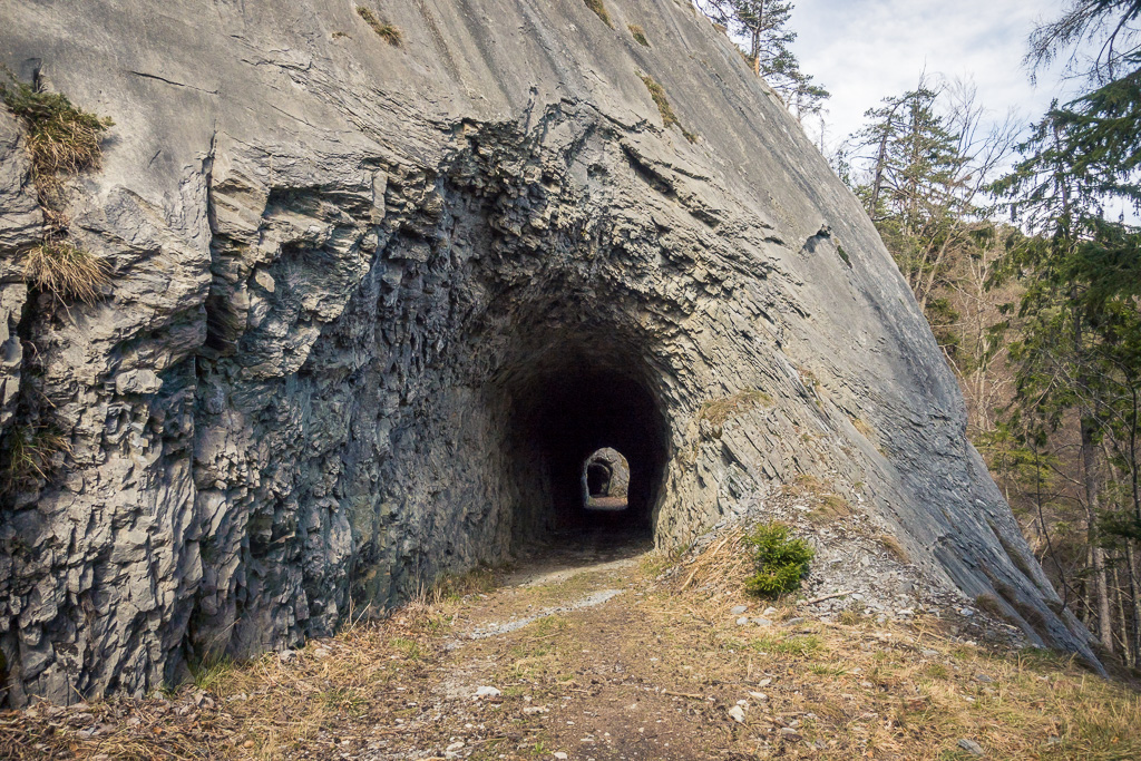 Jetzt wurde die Orientierung etwas unübersichtlich. Die geplante Route sah eigentlich einen weiteren Aufstieg westlich vom Gürstig Chopf mit einer nachfolgenden Abfahrt nach Prameisters vor; vor Ort geriet ich dann jedoch auf einen anderen Weg östlich vom Gürstig Chopf, der über Curtenätsch ebenfalls in die gleiche Richtung führte. Zuerst musste ich das Bike jedoch rund 100m bergab über einen steilen Wanderweg tragen, bis ich wieder auf den befahrbaren Weg stiess. Dieser entpuppte sich jedoch auch als sehr interessant, da er durch mehrere in die Felsen hineingehauene Tunnels führte. Bei Pramanengel erreichte ich dann offenes Gelände und von dort ging es in einer zügigen und teilweise ziemlich steilen Schotterfahrt, zuletzt dann über geteerte Alpstrassen hinunter zum Dorfrand von Untervaz. Hier kam ich schon einmal bei meinem Rückweg vom Kunkelspass über St. Margarethenberg vorbei. Heute fuhr ich das erste Stück also stattdessen in der Gegenrichtung hinauf.