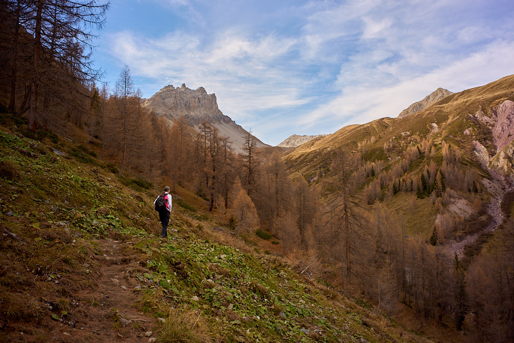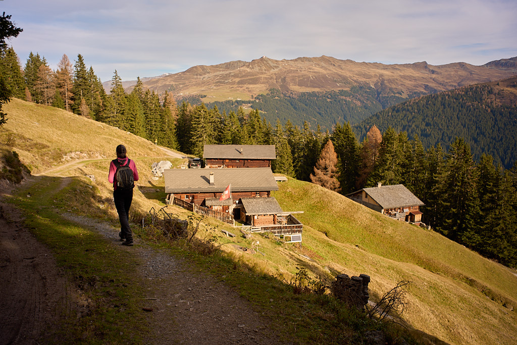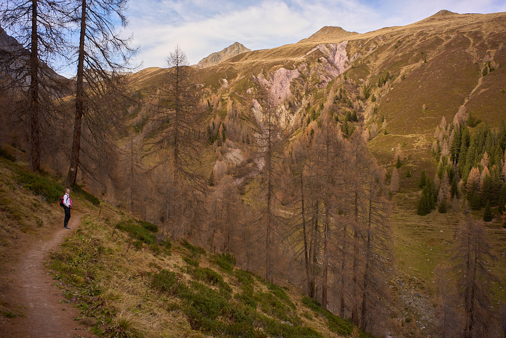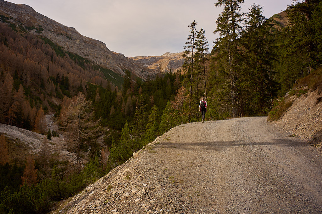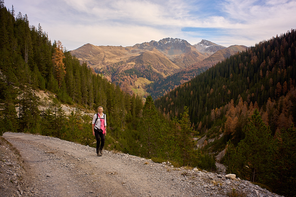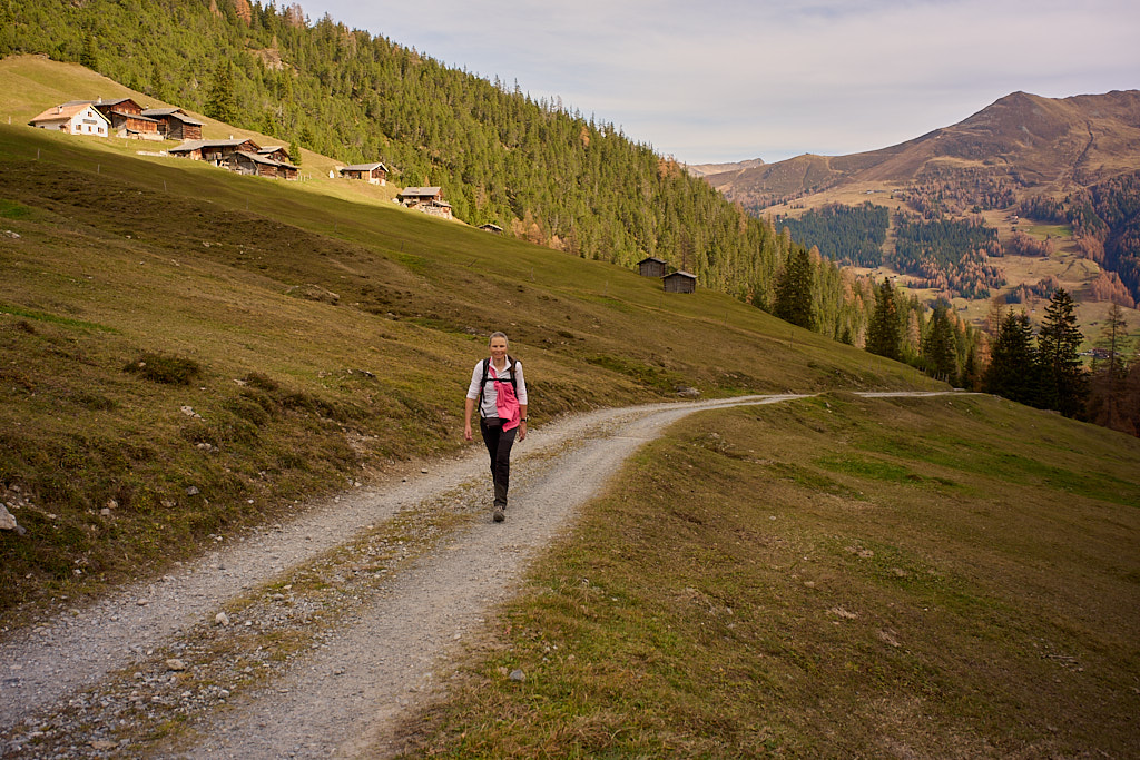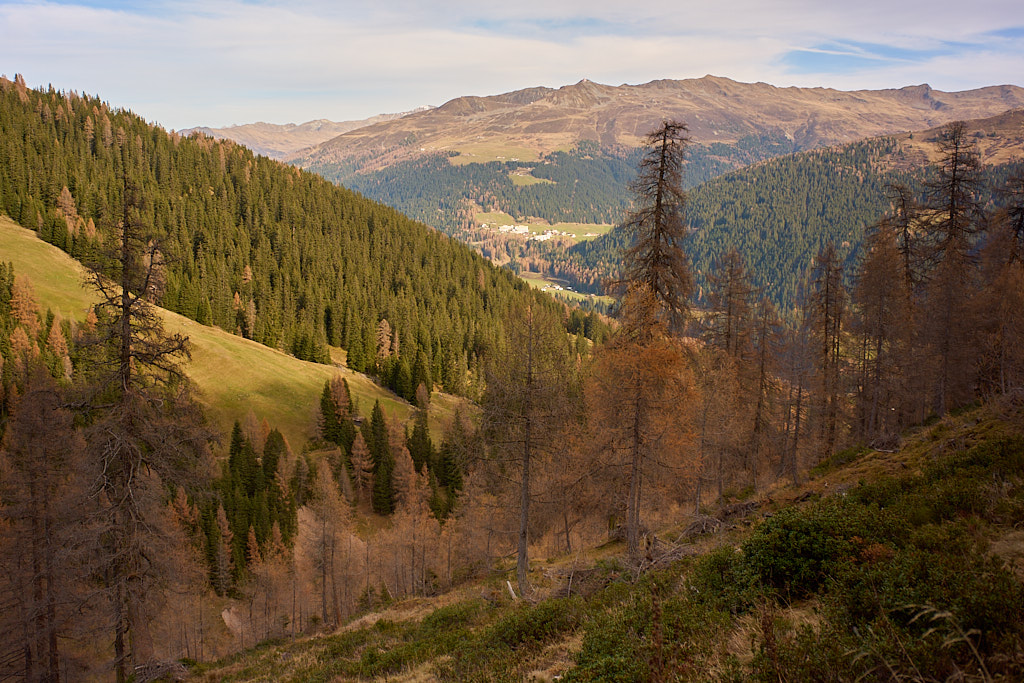 Nur dank des seit Tagen trockenen und sonnigen Herbstwetters liess ich mich heute dazu überreden, mich nochmals auf diesen Weg zu wagen. Wir starteten in Davos Ortolfi und stiegen auf der Alpstrasse zur Bärentaler Alp auf. Der parallel dazu und weiter unten entlangführende Wanderweg war wegen Bauarbeiten gesperrt und überdies bereits im Schatten.