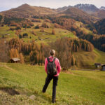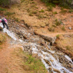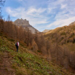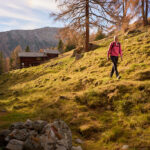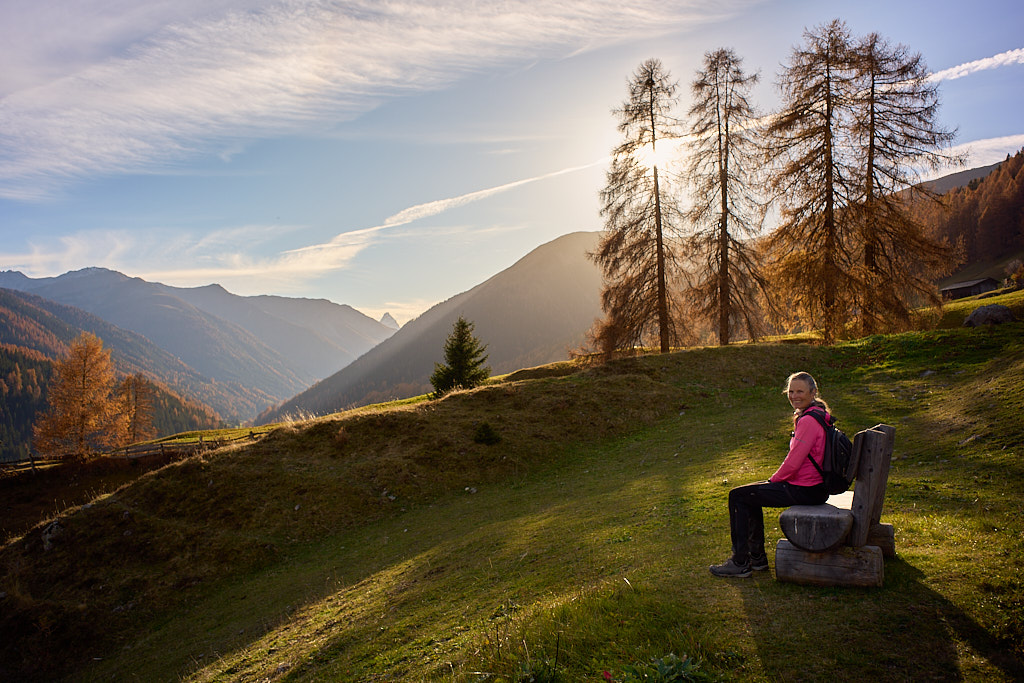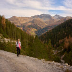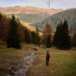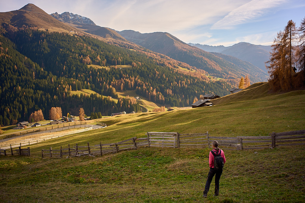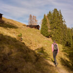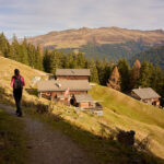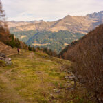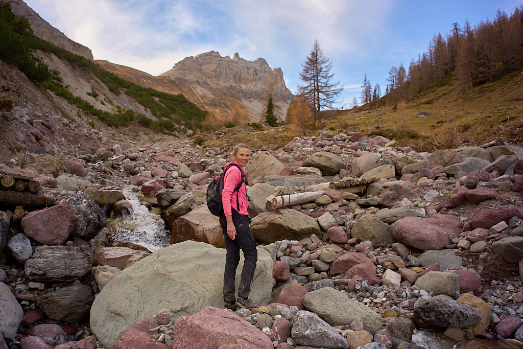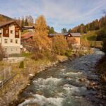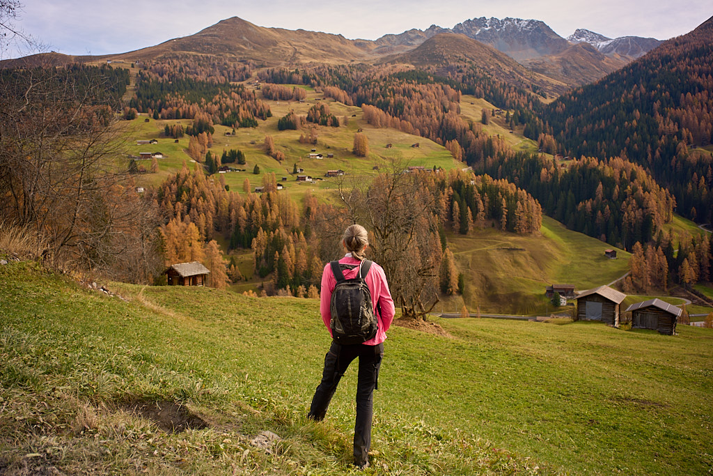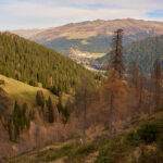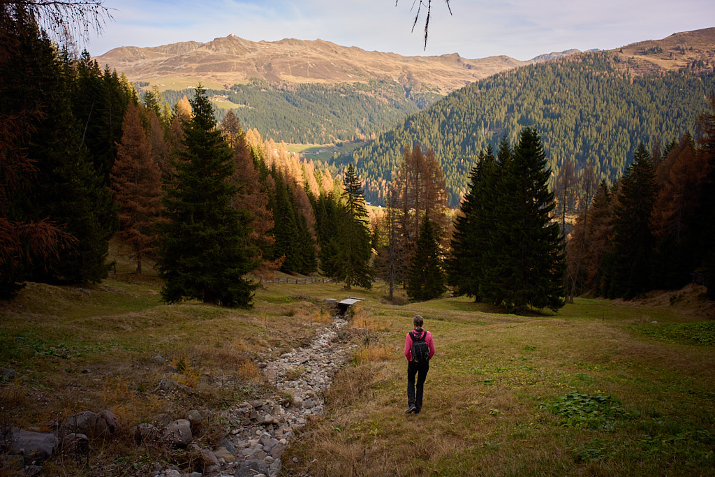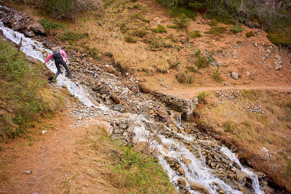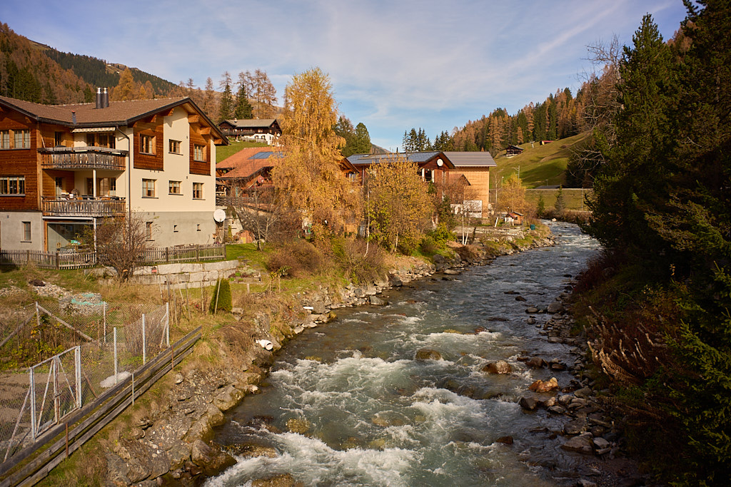 Nachdem wir das Schlimmste überstanden wähnten, kamen wir zum breiten Geröllbett des Chummerbachs und mussten feststellen, dass die Brücken über den Bach für den Winter schon abgebaut waren. Ein paar weitere Turn- und Sprungübungen von Stein zu Stein über das rauschende Wasser waren erforderlich, um hier ohne nasse Füsse weiterzukommen. Danach setzten wir den Spaziergang bis zu den Hütten der Chummeralp fort und stiegen von hier auf dem Alpweg zur Bushaltestelle in Davos Frauenkirch ab, bevor die Sonne hinter dem Augstberg verschwand.