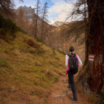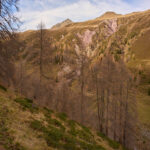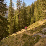 Bei der Bärentaler Alp stiegen wir weiter auf dem Forstweg zum Augstberg auf, bis wir zur Abzweigung des Wanderwegs zur Chummeralp gelangten. Zunächst ging es durch den Wald und dann um eine Ecke herum ins Chummertälli. Auf dem von einer weichen Schicht rostbrauner Lärchennadeln verdeckten Weg federten wir bergab, bis wir zur einstigen Sumpf des Schreckens kamen. Auch bei der aktuellen Trockenheit war es hier tatsächlich immer noch nass und schlammig, die zu überwindende Hindernisstrecke war zum Glück aber nicht mehr so lang wie damals. Hingegen hatte sich jetzt bereits Bodenfrost gebildet und einige der Tümpel waren schon oberflächlich zugefroren – ein Zeichen, dass die Temperaturen besonders in den Nord- und Osthängen trotz schönem Wetter nachts offenbar schon den Gefrierpunkt erreichen.