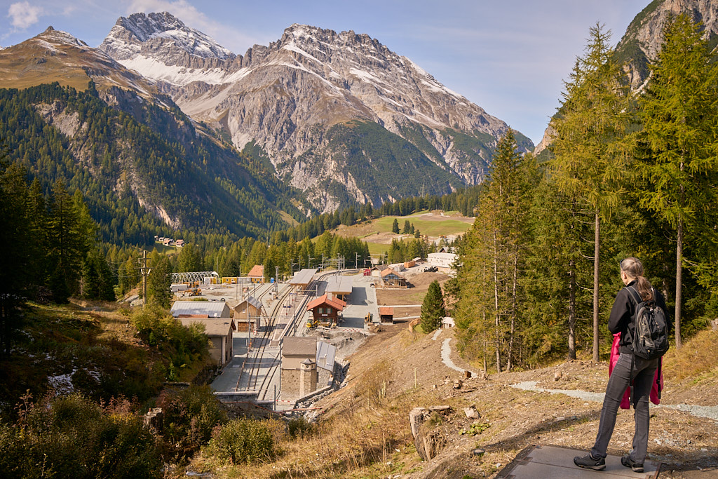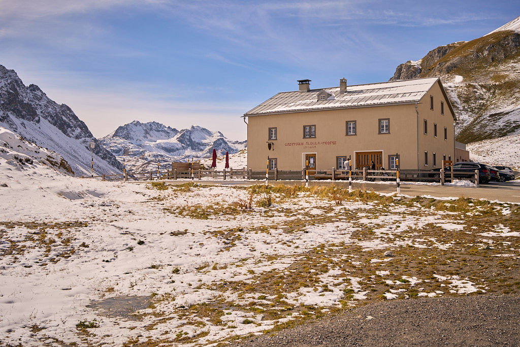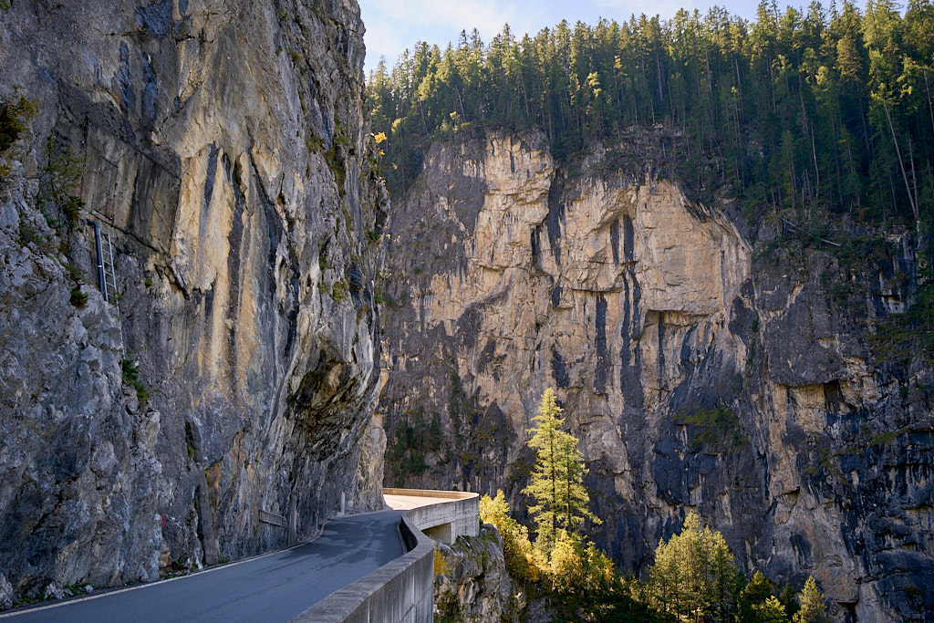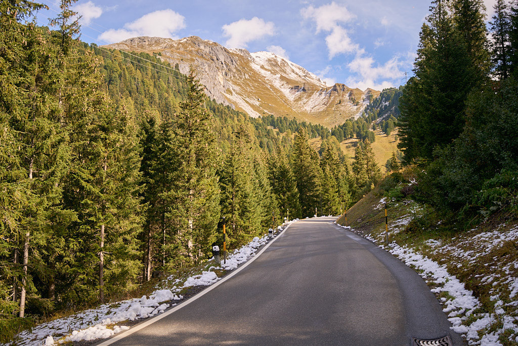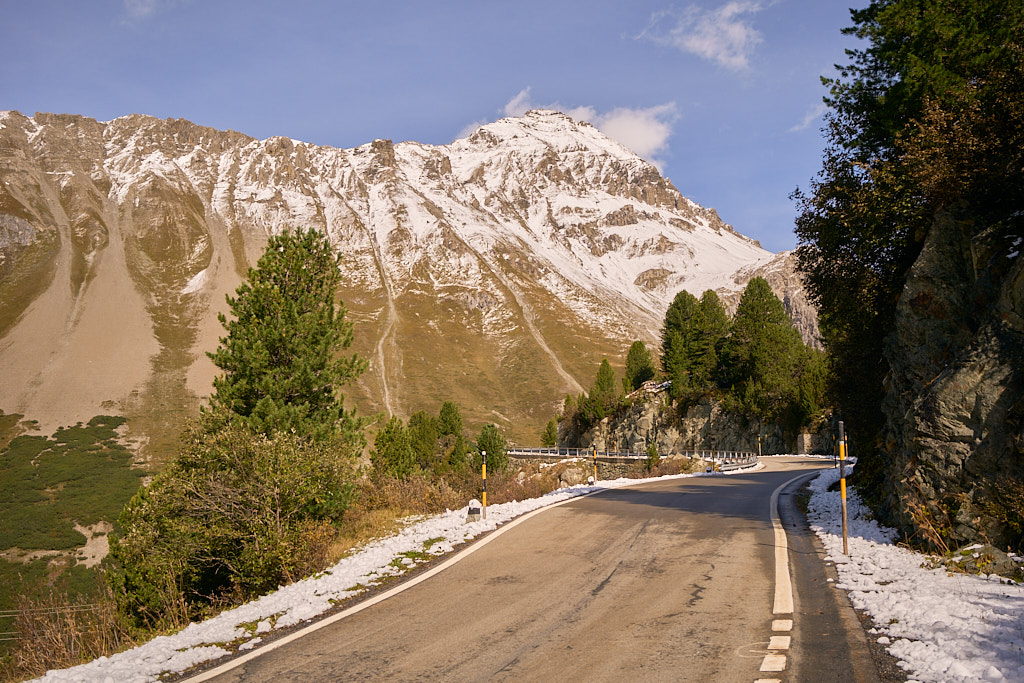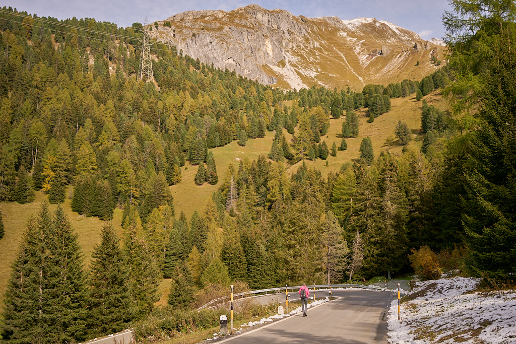 Die Abfahrt von der Passhöhe zum Lai da Palpuogna und weiter nach **Filisur** war grenzwertig. Ich weiss nicht, ob es an den «neuen» schmalen Rennradreifen, am geringeren Gewicht der Räder oder an der Kälte lag: das Fahrverhalten bei höherer Geschwindigkeit war jedenfalls im Vergleich zu meinen zahlreichen bisherigen Abfahrten auf der gleichen Strecke erstaunlich empfindlich und nervös, was mich angesichts der vielen Kurven und Autos zunehmend stresste. Ich war jedenfalls froh, als es nach Filisur wieder bergauf ging (und dies fiel mir mit diesen Reifen umgekehrt wesentlich leichter). Nach heutigem Stand werde ich für zukünftige Passfahrten wohl eher wieder zu meinen breiteren Gravelbikereifen greifen. Abgesehen davon aber: herrlicher, sonniger Herbsttag mit wunderbaren Landschaftseindrücken!