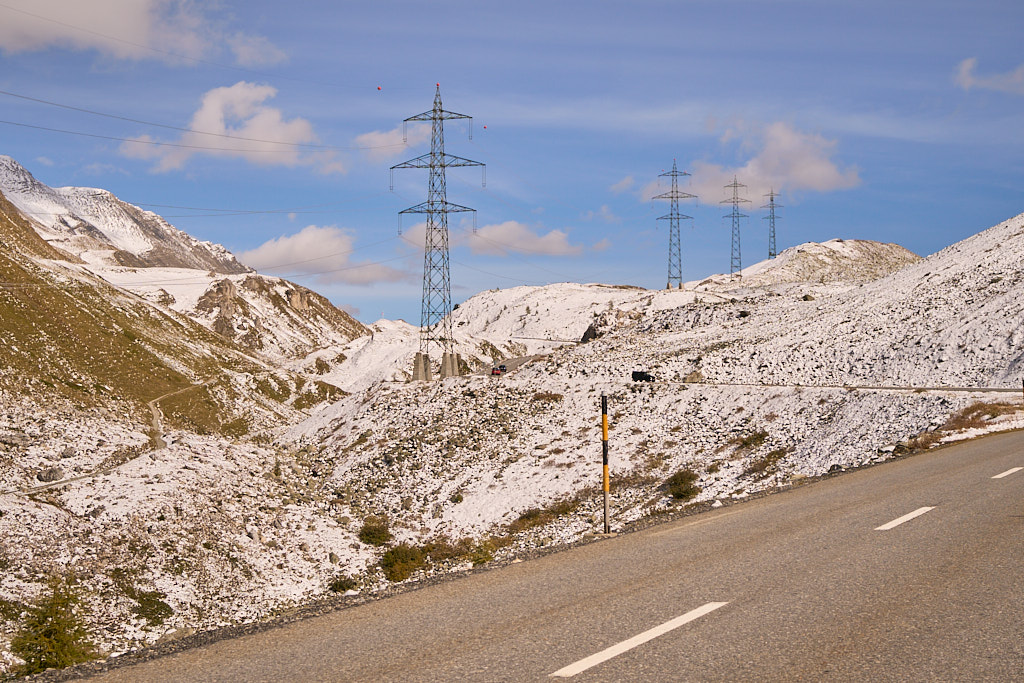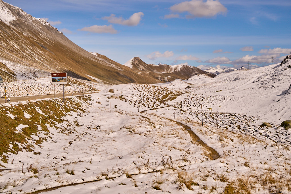Im Gegensatz zu unserem letztjährigen Ausflug (der damals erst Mitte Oktober stattfand) waren die Berge diesmal nach kürzlichen Herbststürmen bereits leuchtend weiss verschneit. Zufälligerweise stand ich fast genau vor einem Jahr schon etwas früher mit dem Gravelbike auf der Passhöhe; auch dort hatte es damals (noch) keinen Schnee.