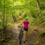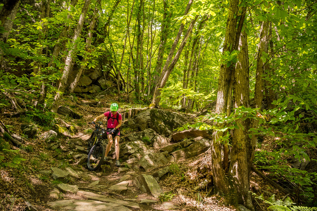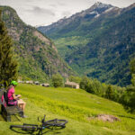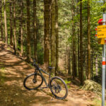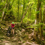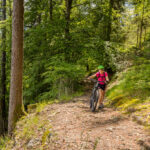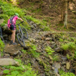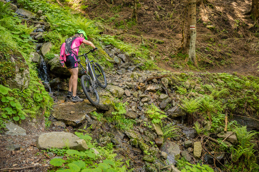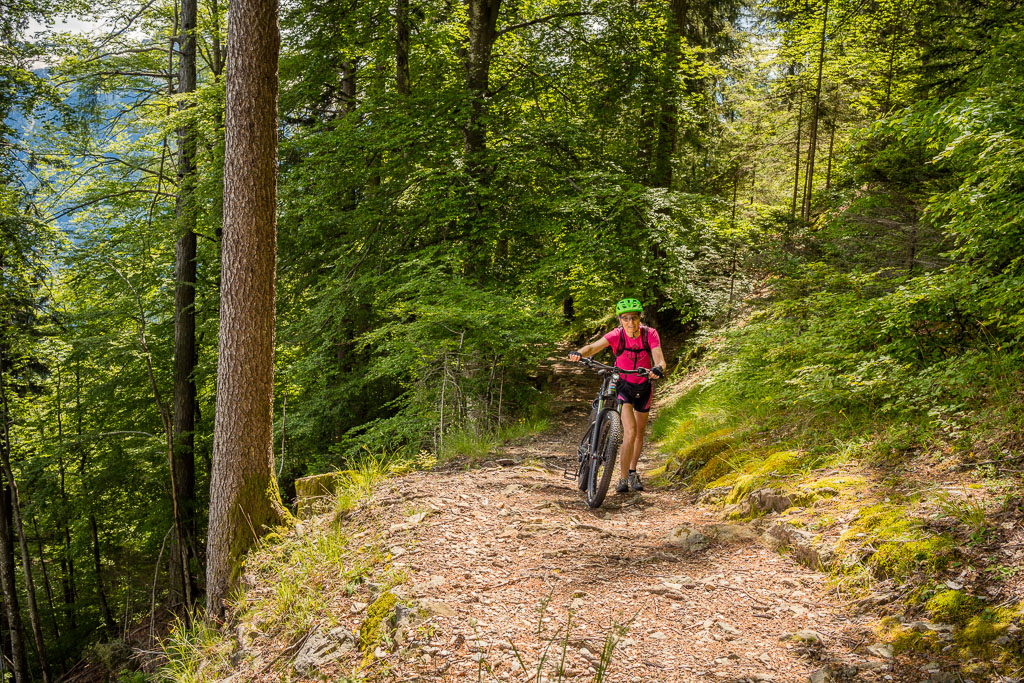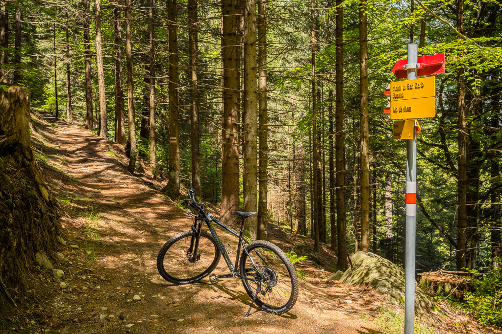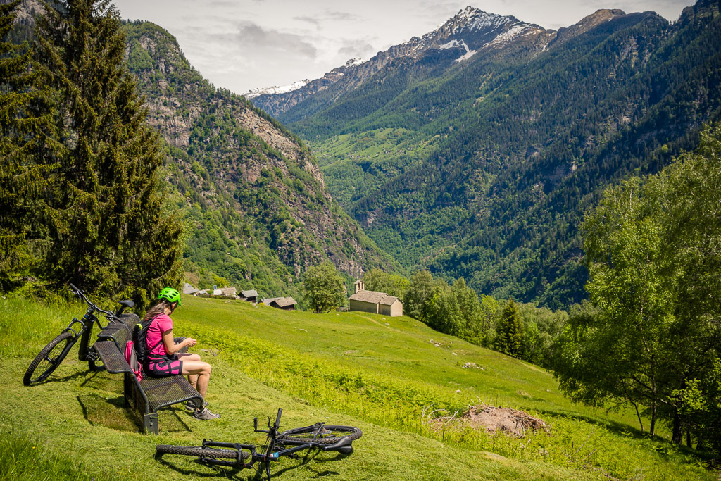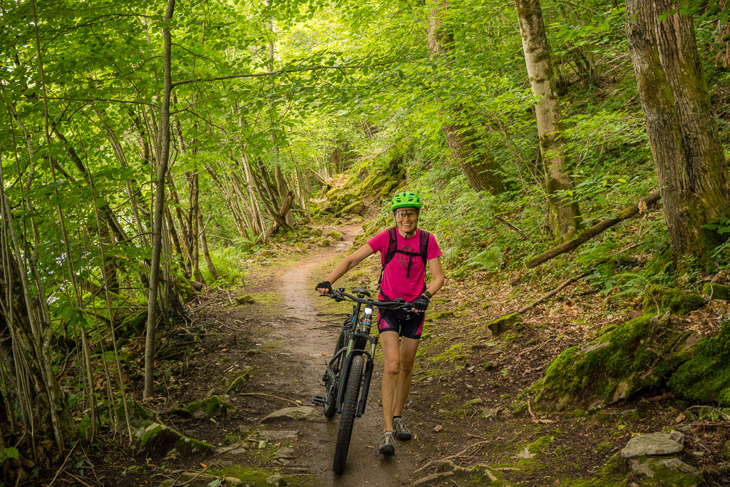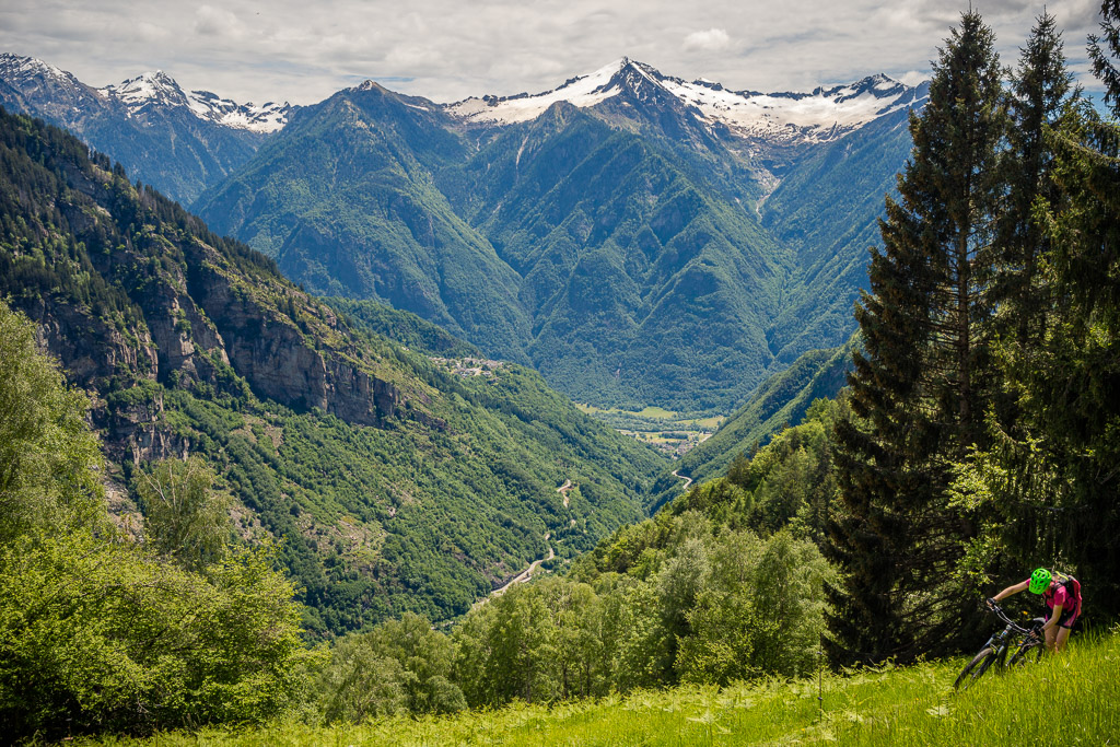 War der bisherige Aufstieg zwar steil, aber auf einer asphaltierten Alpstrasse, wurde es jetzt nochmal anstrengender, da uns nun eine lange Traverse auf einem Wanderweg durch den Wald zum nächsten Weiler von Monti di San Carlo weiter hinten im Calancatal bevorstand. Anfangs war der Weg noch fahrbar, wenn auch wegen groben Wurzeln und vielen unregelmässigen Steinblöcken mit meinem Hardtail sehr mühsam. Im weiteren Verlauf wurde es aber mehrheitlich eng, nass, von steilen und blockigen Zwischensteigungen und -absätzen unterbrochen, sodass wir die zweite Hälfte dieses Abschnitts mehrheitlich schiebend zurücklegten. Bei Monti di San Carlo kamen wir auf eine Lichtung mit schöner Aussicht und Sitzbänken heraus und legten dort eine Essenspause ein.