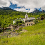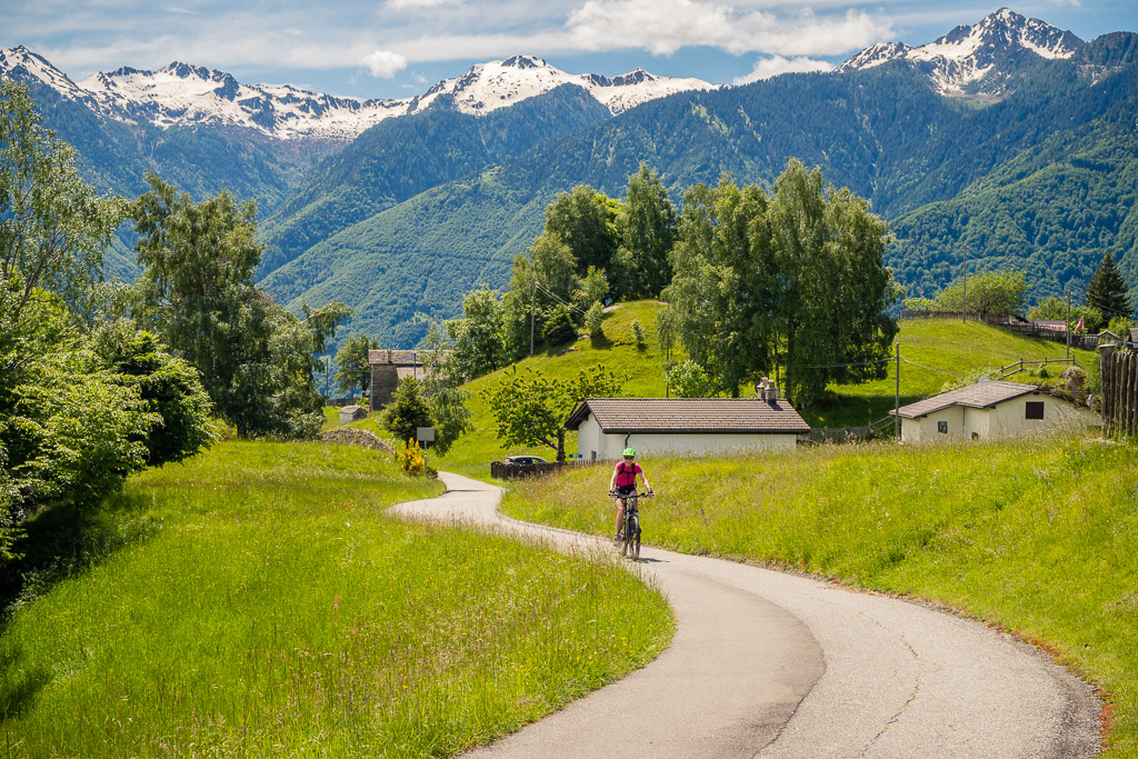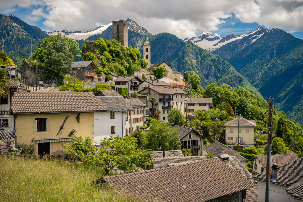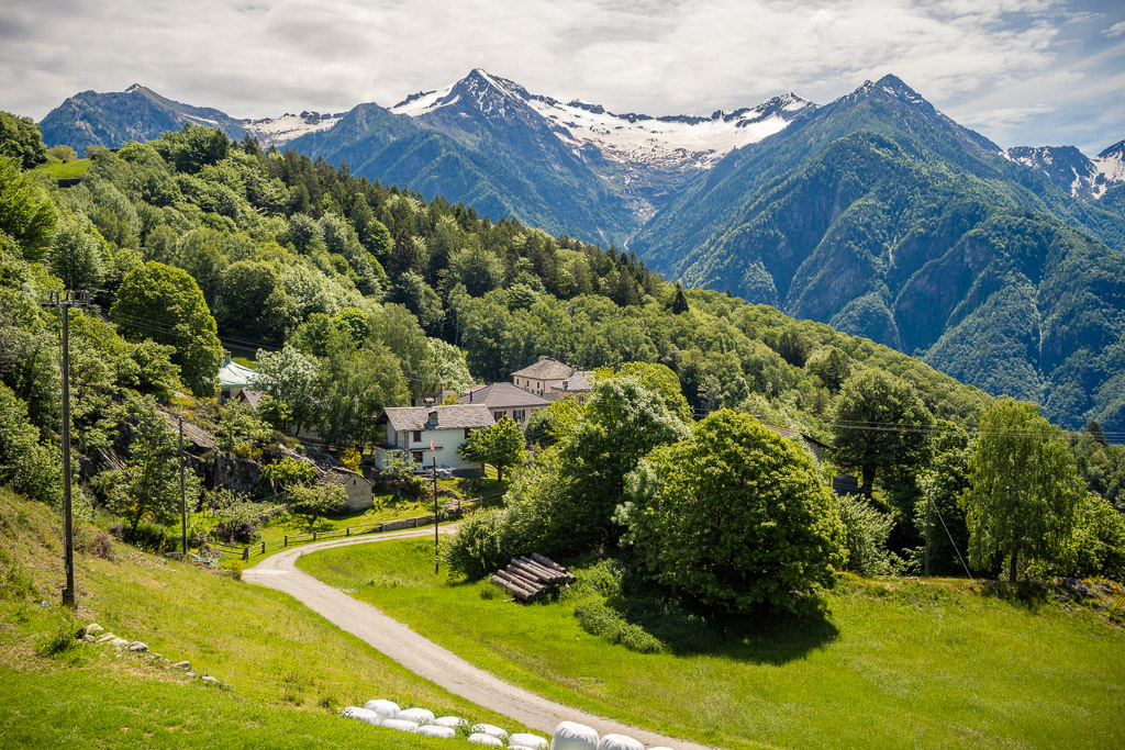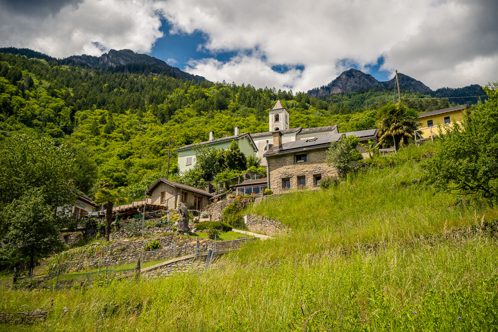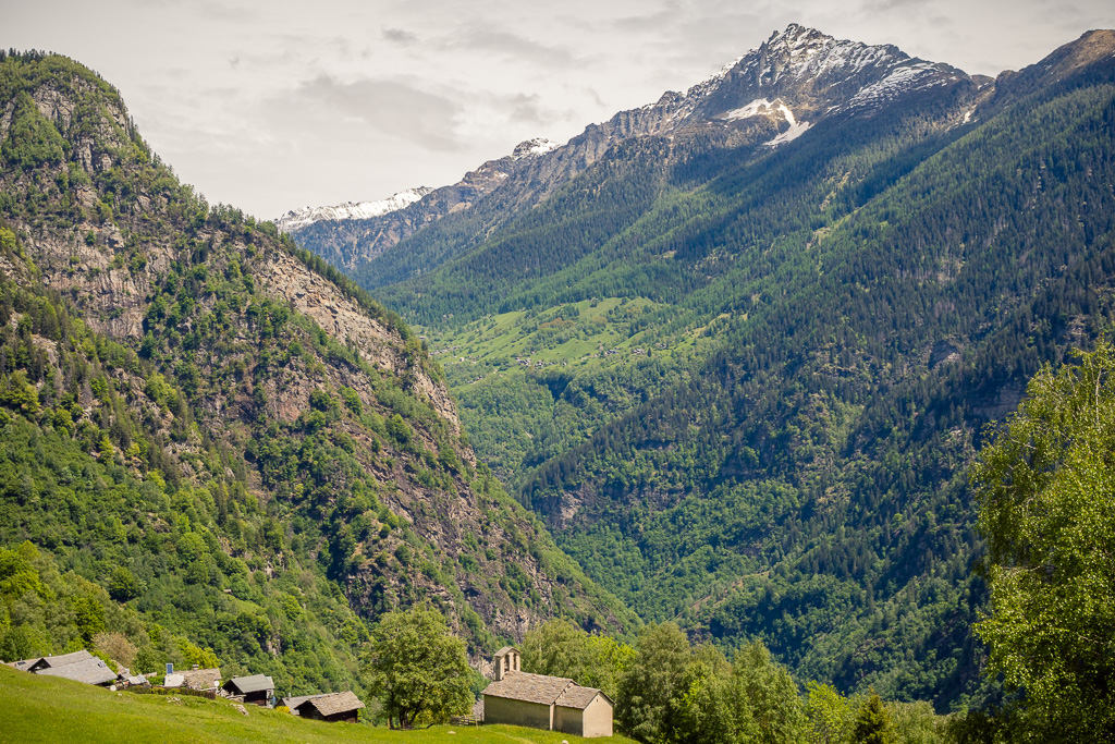 Vom Stausee fuhren wir nun auf der Autostrasse ein Stück talauswärts bergab, bis wir die Abzweigung nach Castaneda erreichten. Dieser zweite Aufstieg war mit 200 Höhenmetern bald geschafft, wir durchquerten das Dorf und erreichten nach weiteren 200 Höhenmeter die nächste grössere Ortschaft am Hang, Santa Maria in Calanca.