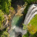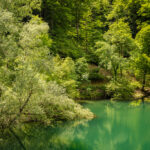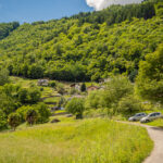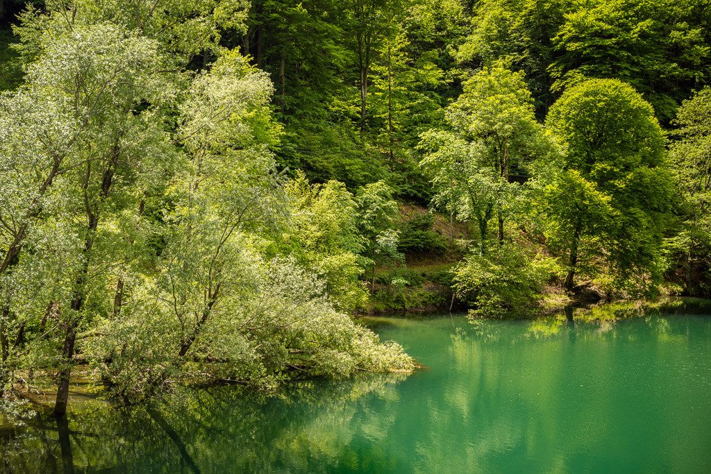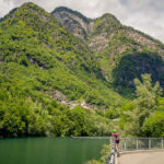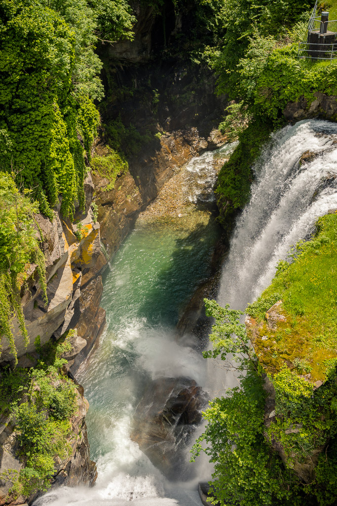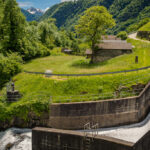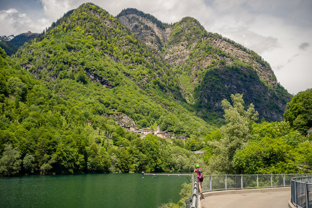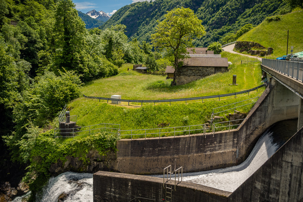 Nach einem letzten Steilstück über Wiesen erreichten wir unterhalb von Monti di San Carlo wieder einen Fahrweg. Auf diesem fuhren wir in zahlreichen Serpentinen steil hinunter an Buseno vorbei in den Talgrund zu einem Stausee, dem Laghet di Buseno. Beeindruckend an diesem See waren nicht nur die dichtebewaldete Uferlandschaft und das türkisblaue Wasser, sondern vor allem die beiden rauschenden Wasserfälle an der Staumauer, von denen das Wasser tosend in eine tiefe Felsschlucht gelangte.