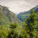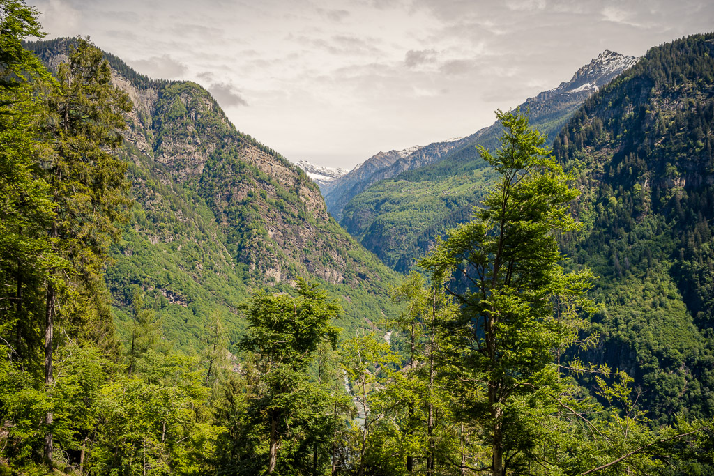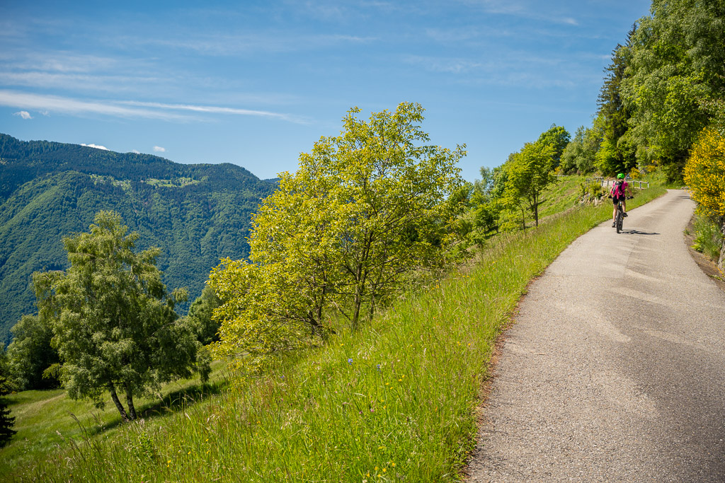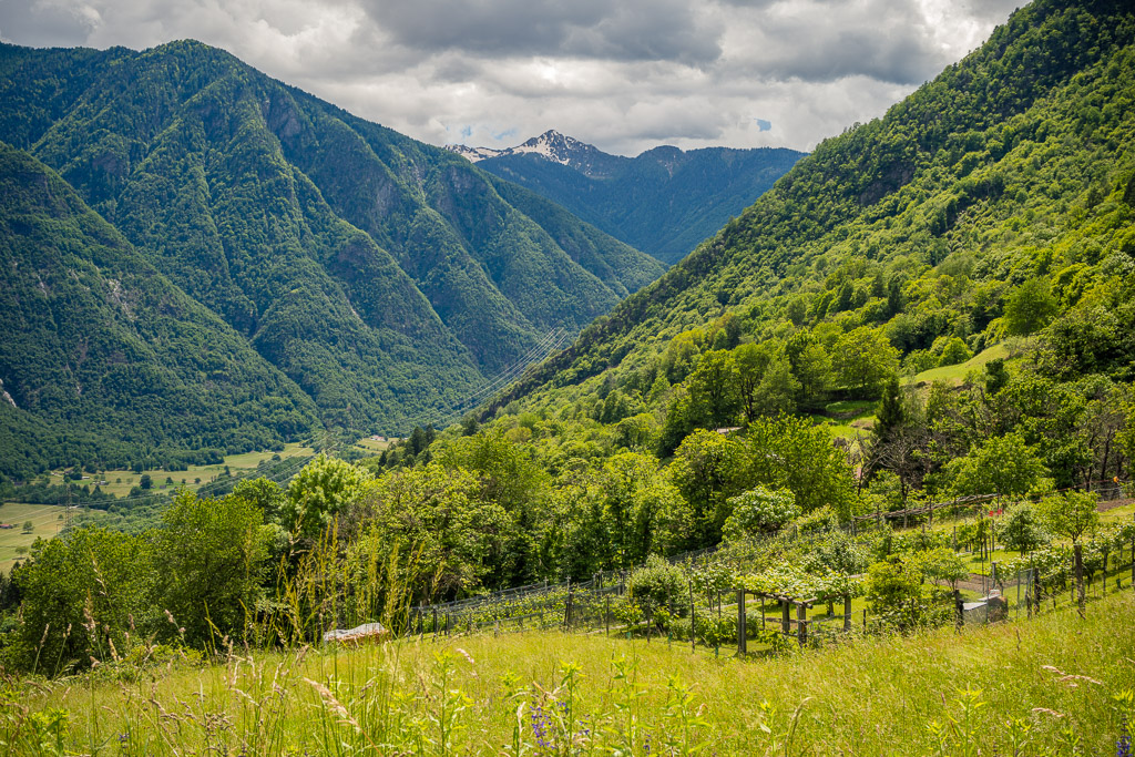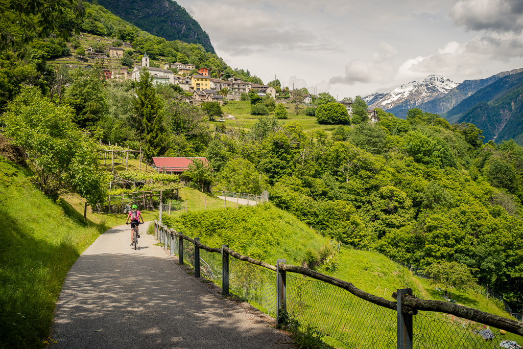 Danach wurde es nochmals abenteuerlich. Ein Feldweg führte anfangs fahrbar in Richtung Verdabbio, endete bei einem Holzplatz aber bald in einem erneut total verblockten Wanderweg. Auch diesen mussten wir schiebend und tragend zurücklegen, bis wir 100 Höhenmeter tiefer wieder auf einen befahrbaren Weg stiessen. Von Verdabbio selbst bekamen wir eigentlich gar nicht viel zu sehen, da die zahlreichen Häuser ziemlich gut versteckt auf der von unserem Weg abgewandten Hangseite lagen. Wir kamen hier aber nach langer Zeit zum ersten Mal wieder an einem Brunnen vorbei und konnten endlich unsere schon sehr geleerten Trinkbeutel auffüllen. Generell fiel mir auf, dass die Brunnendichte im Tessin weit spärlicher zu sein scheint als in unseren Bündner Bergen.