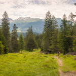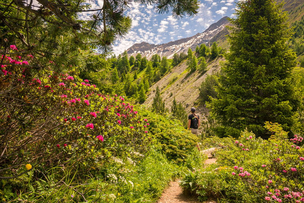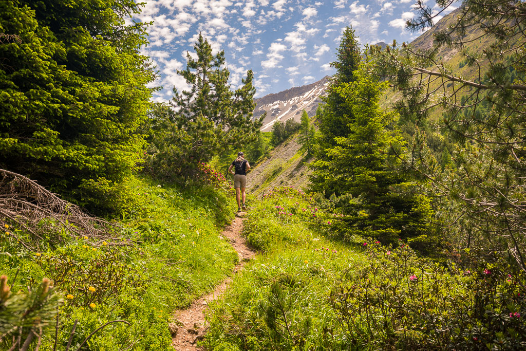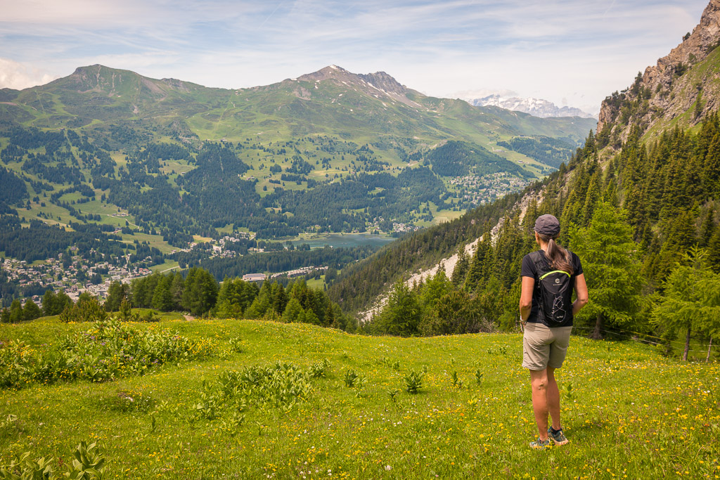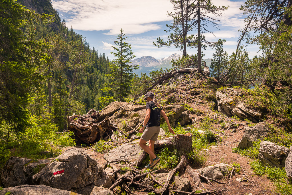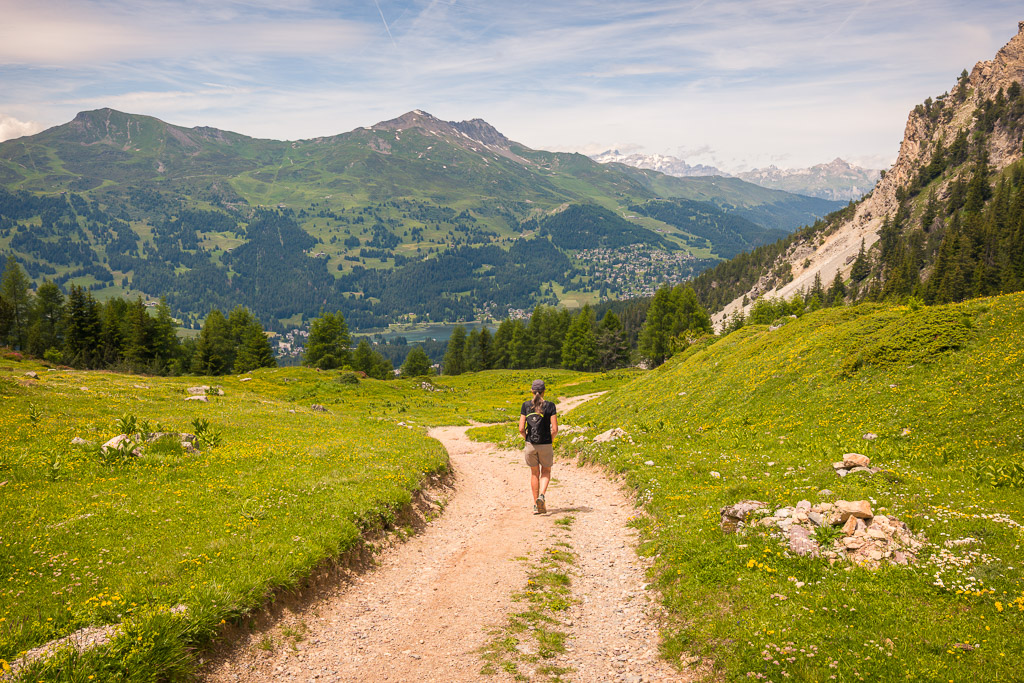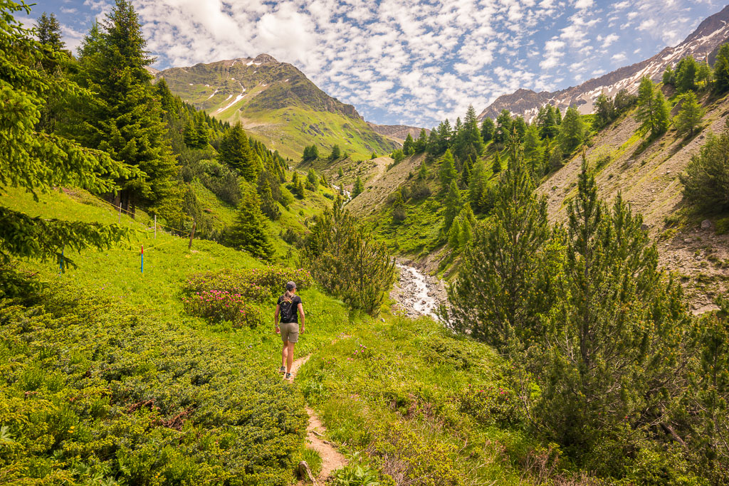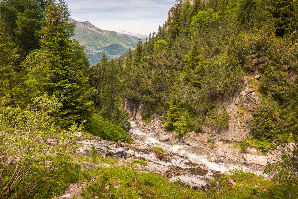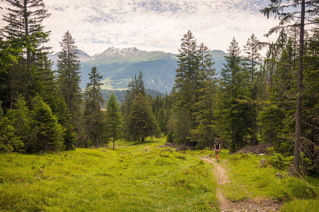 Kleine Wanderung von der Lenzerheide zur Alp Sanaspans über den Wasserfallweg. Abstieg auf der Alpstrasse und hinunter zur Biathlonarena bei Lantsch/Lenz.