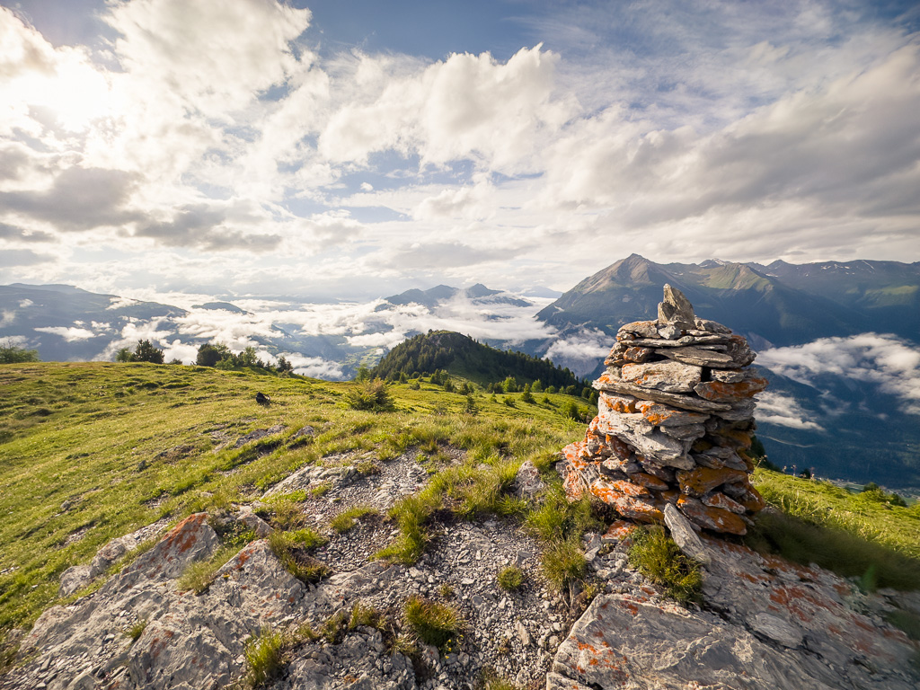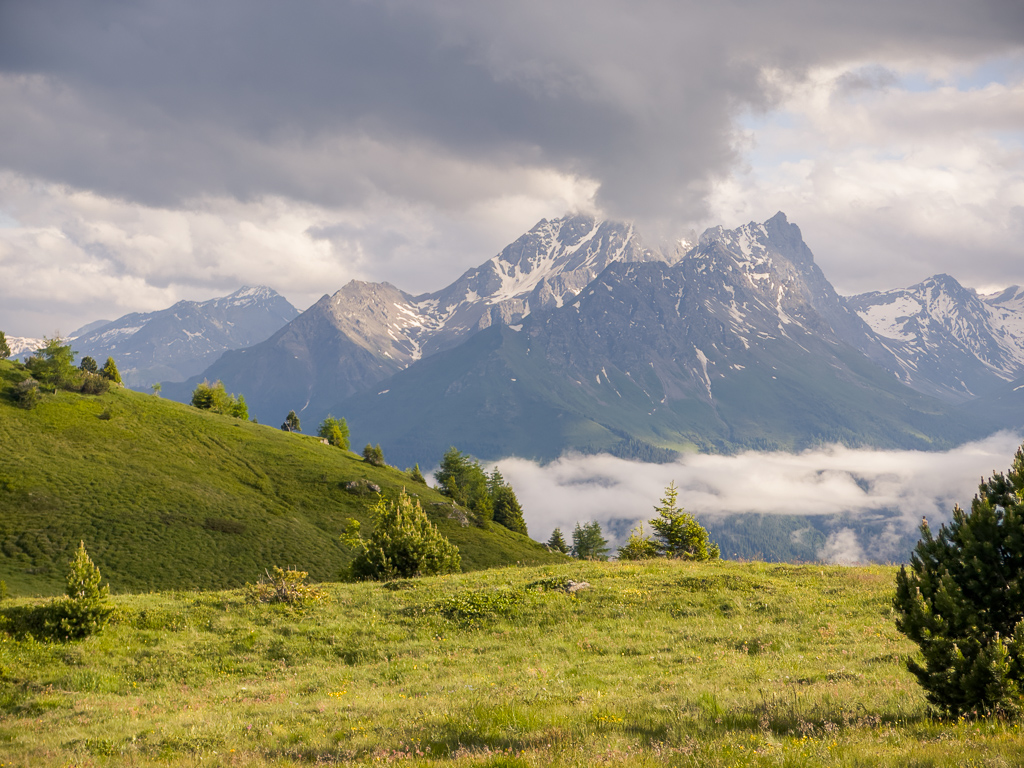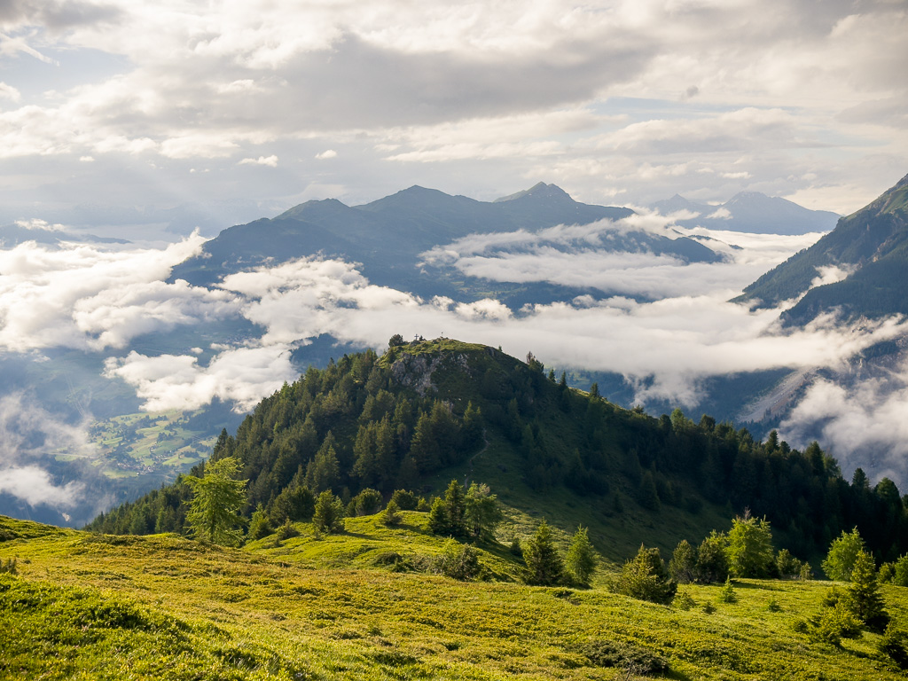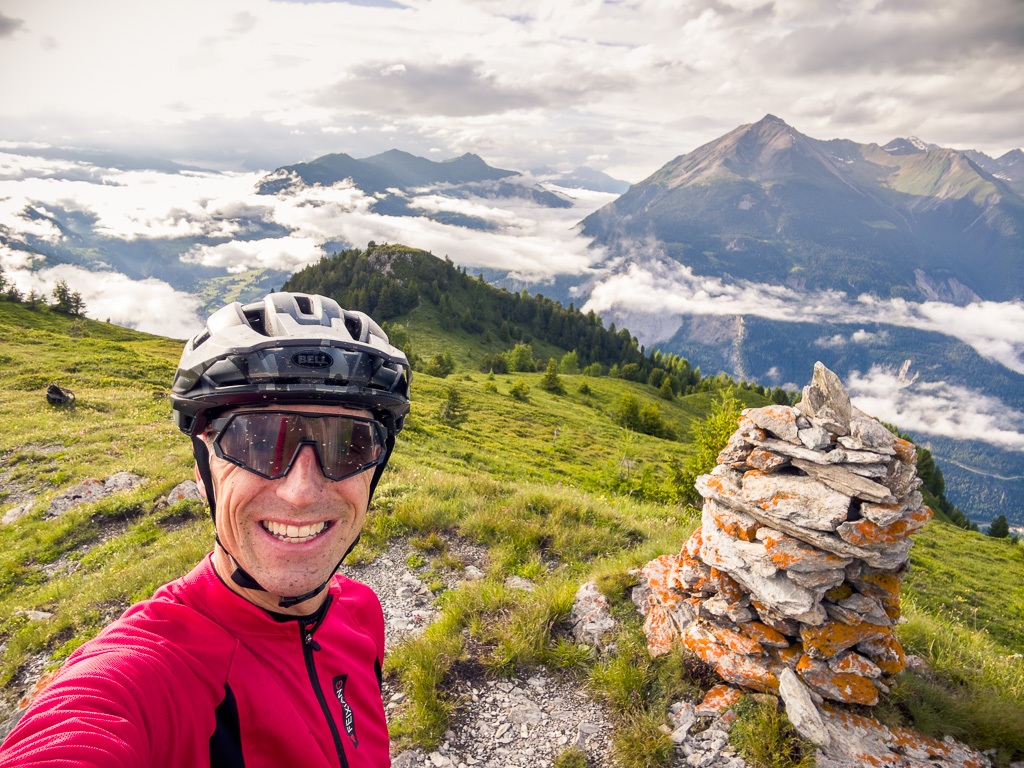 Ich hatte mir die letzte Fahrt zum Motta Palousa mit dem Gravelbike leichtgemacht. Wegen dem regnerischen Wetter beschloss ich aber, heute das Mountainbike zu nehmen, was schon bei der Hinfahrt (siehe oben) eindeutig die bessere Idee war. Der Aufstieg zur Alp Ozur fühlte sich dafür wieder sehr mühsam an, was sicher auch am nassen, «klebrigen» Untergrund und dem Gewicht vom Schlamm lag, den meine Stollenreifen bei jeder Radumdrehung in mein Gesicht und auf mein Hinterteil befördern mussten. Bei der Alp Ozur angekommen, liess ich das Bike dann weiter oben auf der Weide etwa 100 Höhenmeter unterhalb des Gipfels liegen und legte den Rest zu Fuss zurück. Ich hatte mir ursprünglich überlegt, wie schon einige Male zuvor vom Motta Palousa auf der anderen Seite ins Oberhalbstein nach Cunter abzufahren. Es war allerdings schon Abend und ich wollte nicht erst in der Dunkelheit heimkehren. So lief ich dann auf gleichem Weg wieder zurück zu meinem Bike.