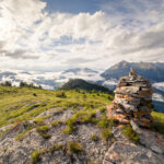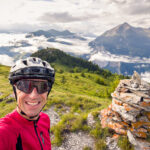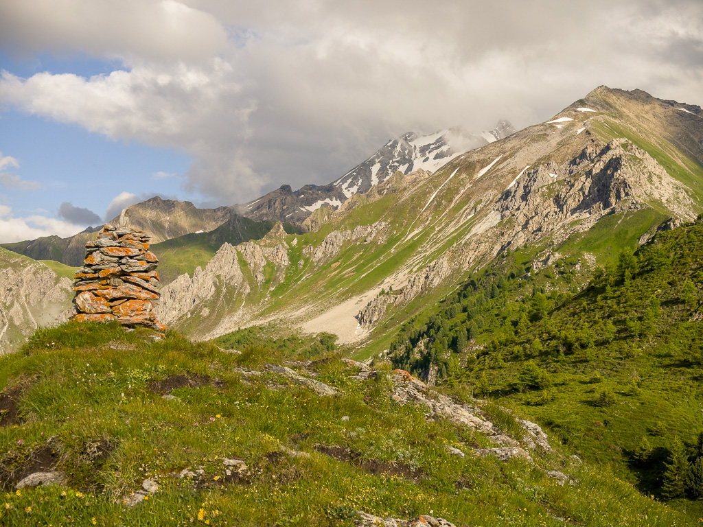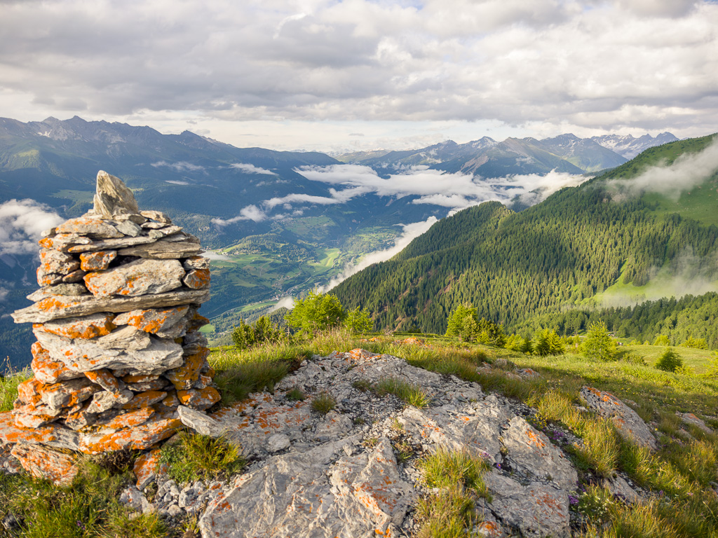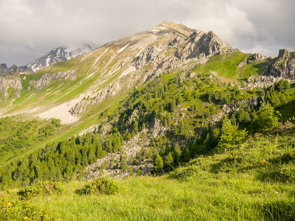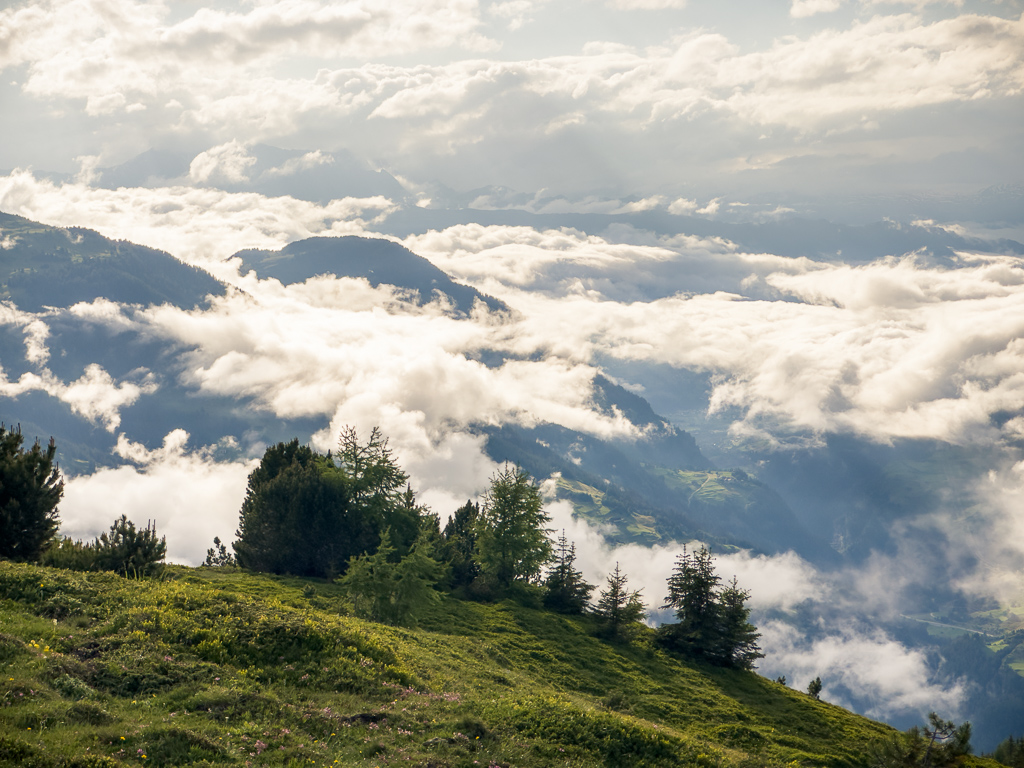 Ich hatte mir die letzte Fahrt zum Motta Palousa mit dem Gravelbike leichtgemacht. Wegen dem regnerischen Wetter beschloss ich aber, heute das Mountainbike zu nehmen, was schon bei der Hinfahrt (siehe oben) eindeutig die bessere Idee war. Der Aufstieg zur Alp Ozur fühlte sich dafür wieder sehr mühsam an, was sicher auch am nassen, «klebrigen» Untergrund und dem Gewicht vom Schlamm lag, den meine Stollenreifen bei jeder Radumdrehung in mein Gesicht und auf mein Hinterteil befördern mussten. Bei der Alp Ozur angekommen, liess ich das Bike dann weiter oben auf der Weide etwa 100 Höhenmeter unterhalb des Gipfels liegen und legte den Rest zu Fuss zurück. Ich hatte mir ursprünglich überlegt, wie schon einige Male zuvor vom Motta Palousa auf der anderen Seite ins Oberhalbstein nach Cunter abzufahren. Es war allerdings schon Abend und ich wollte nicht erst in der Dunkelheit heimkehren. So lief ich dann auf gleichem Weg wieder zurück zu meinem Bike.