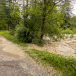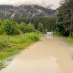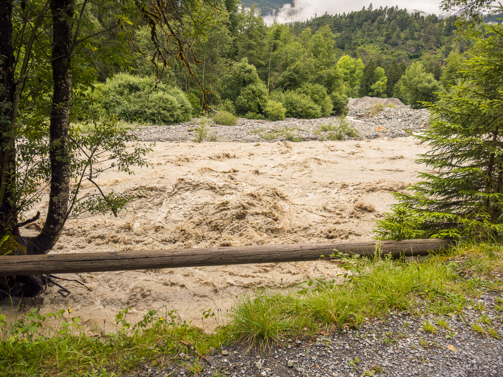Die Nachteile gegenüber den Gravelbike im Aufstieg machte das Mountainbike bei der rasanten Abfahrt nach Surava mehr als wett. Der Flug über Geröll und Bodenwellen fühlte sich dank den beim Gravelbike fehlenden Stossdämpfern hier mehr wie eine Sonntagsfahrt im Auto an. In Surava und Umgebung war man während meiner Abwesenheit nicht untätig geblieben. Der Uferweg war inzwischen abgesperrt worden. Angesichts des möglicherweise noch weiter steigenden Wasserstands der Albula hatte ich mir allerdings schon während der Hinfahrt überlegt, auf der Autostrasse nach Alvaneu Bad zurückzufahren.