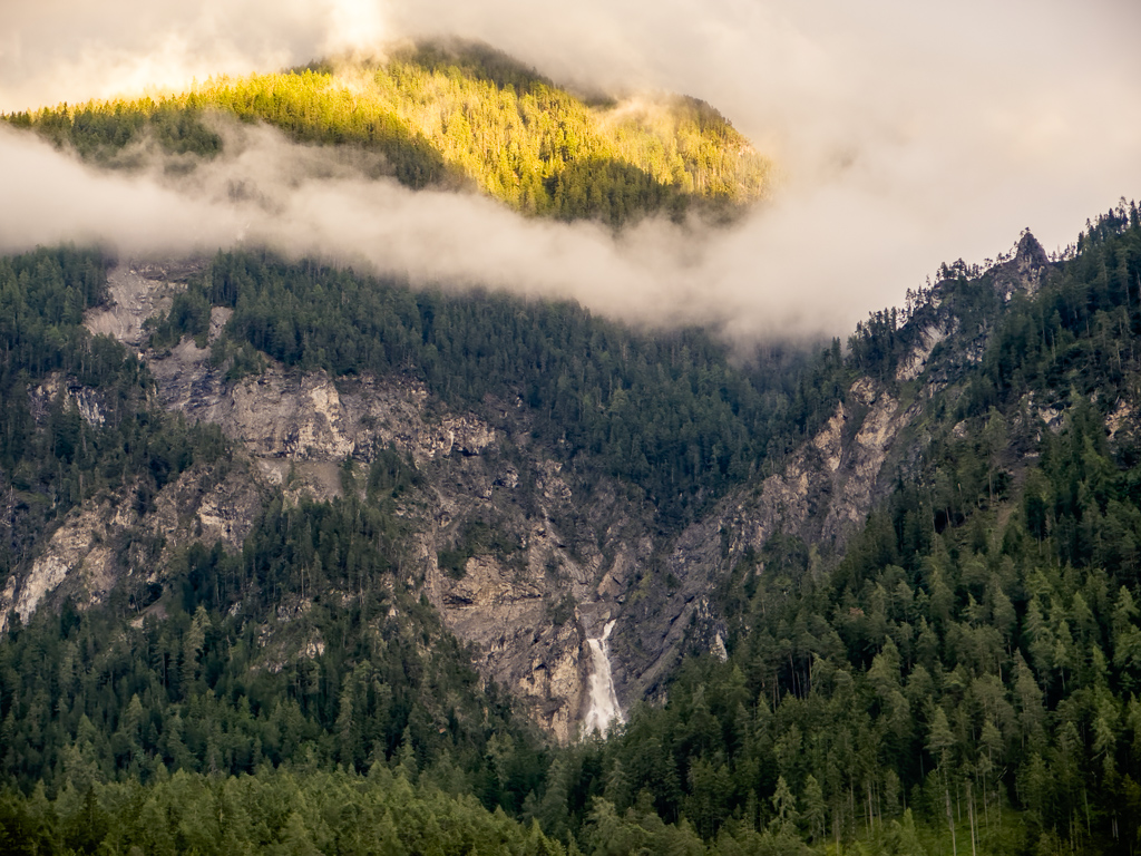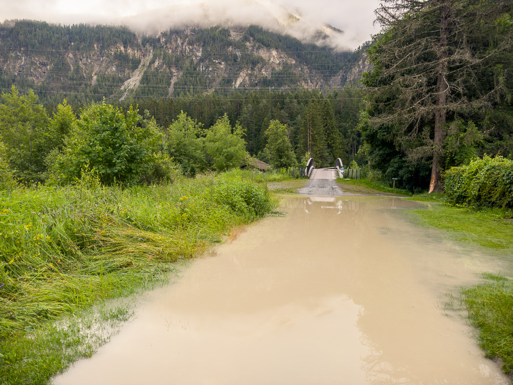 Dort angekommen, wollte ich es mir trotzdem nicht nehmen lassen, die Lage noch weiter zu erkunden. Die Durchquerung eines unerwartet tiefen Tümpels bei der Brücke am Parkplatz des Golfplatzes resultierte in klatschnassen Füssen und Schuhen. Ich konnte aber noch an Zinols vorbei zum Biohof Las Sorts fahren, um dort im Hofladen noch etwas Käsenachschub für den Abend zu besorgen. Danach fuhr ich wieder nach Alvaneu Bad zurück und über die Strasse nach Alvaneu Dorf hoch.