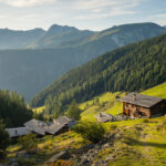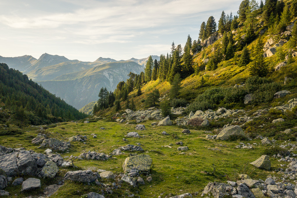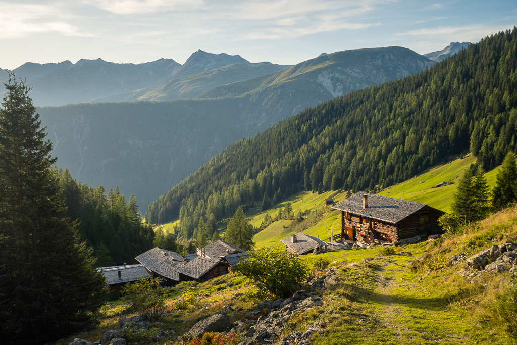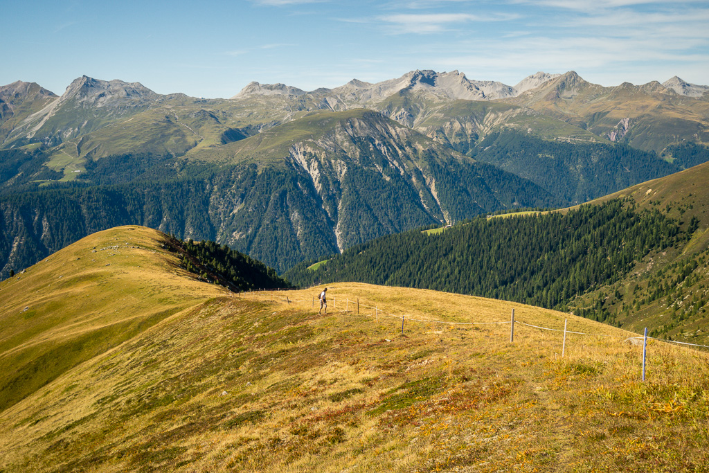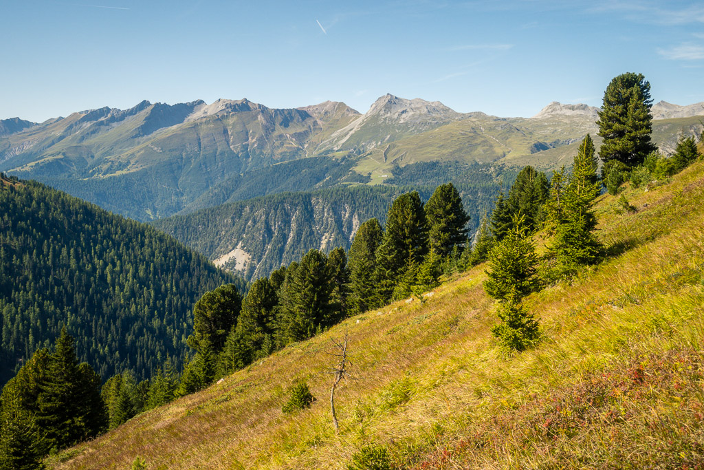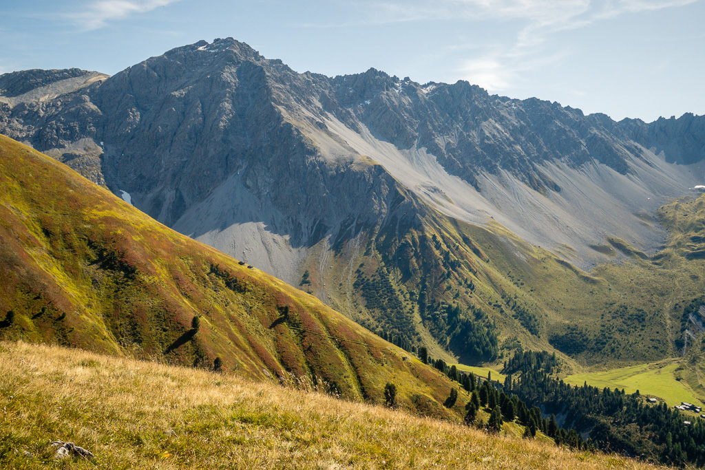 In Davos Monstein bis ans südliche Dorfende und weiter zu den Hütten der Oberalp. Von dort aus wäre unsere spätere Abstiegsroute eigentlich auch die günstigste Route für den Aufstieg. Wir sind aber auf einem Wanderweg durch den Rüggsitenwald in Richtung Inneralpen gewandert und haben in einer Waldlichtung in der Falllinie von P.2258 einen äusserst steilen und weglosen Aufstieg durch Gras und Gebüsch bei Gallimeder auf den Grasrücken von Rügg gewählt.
