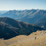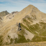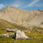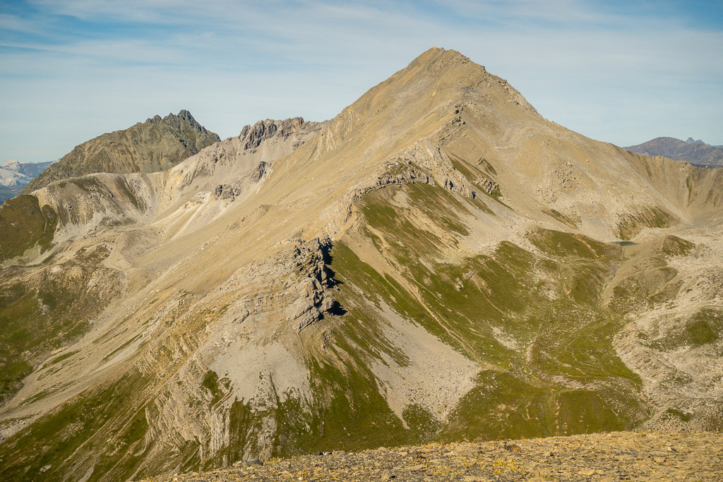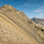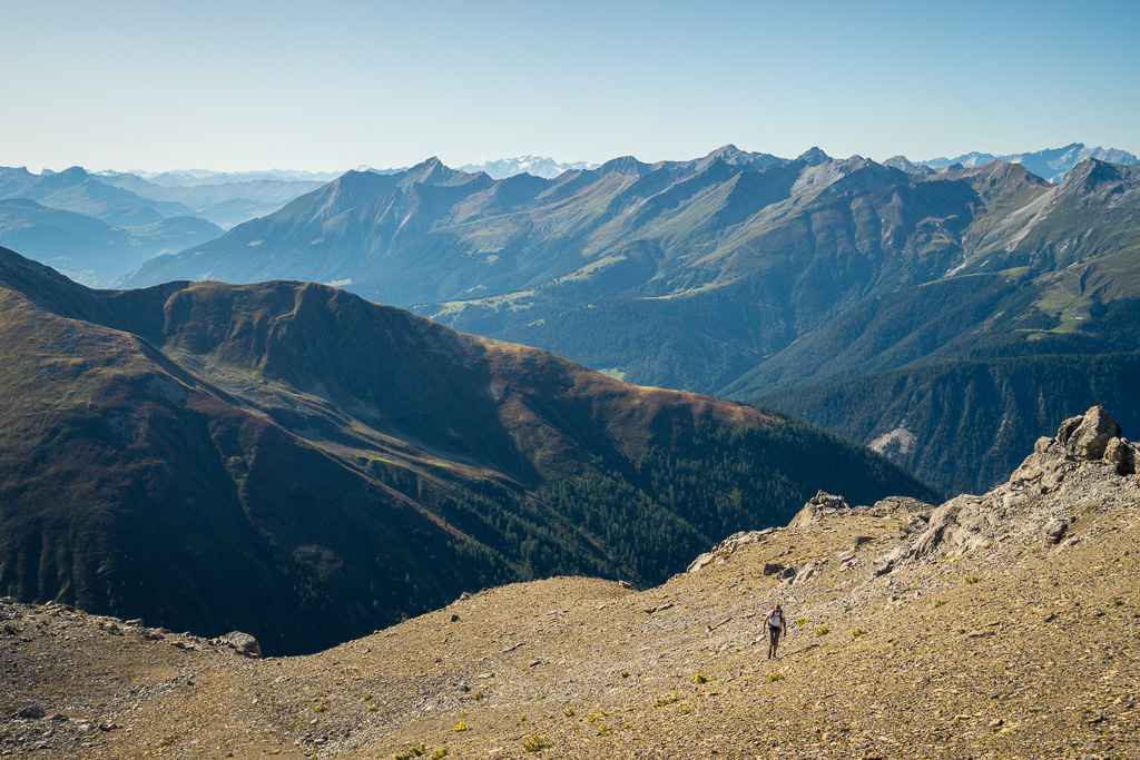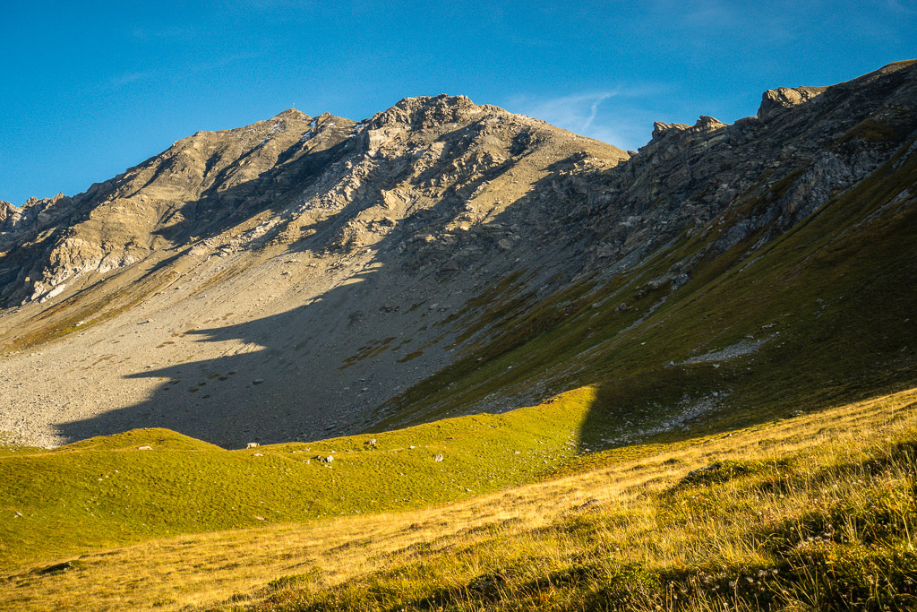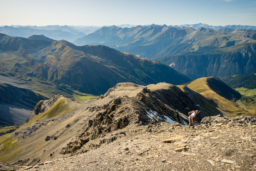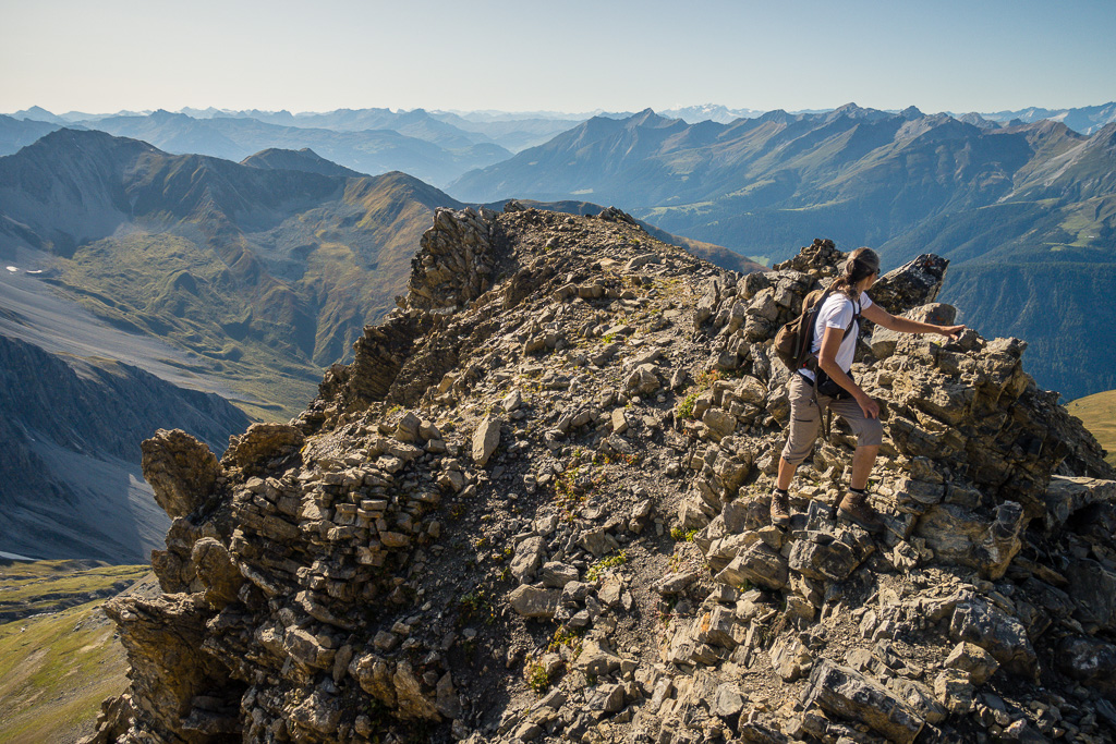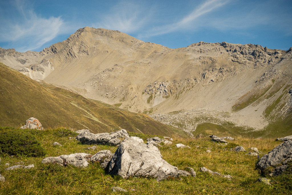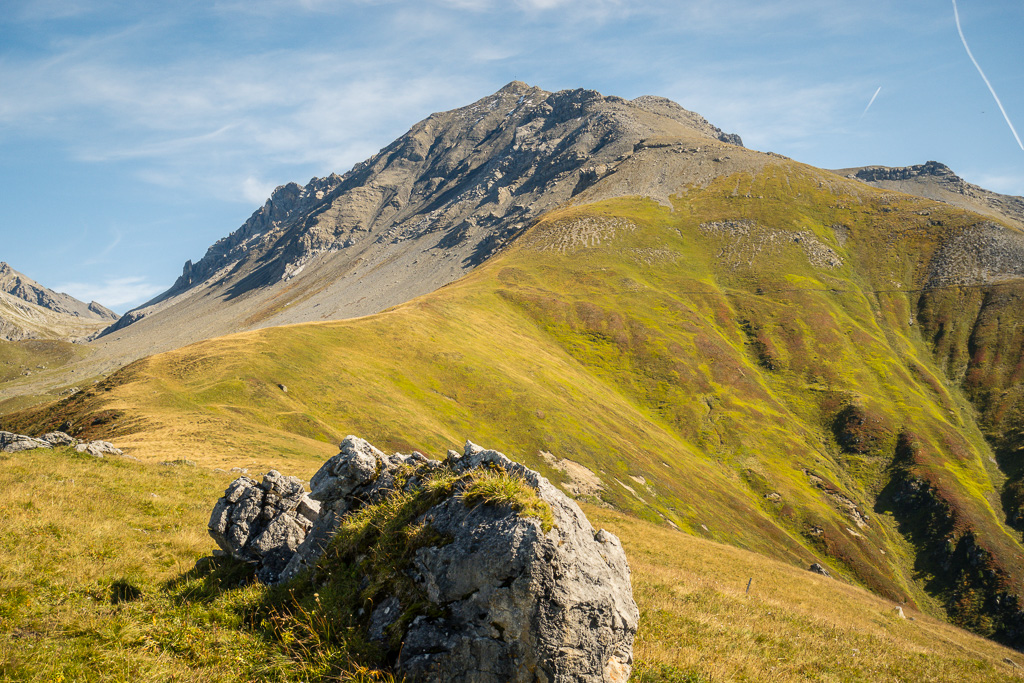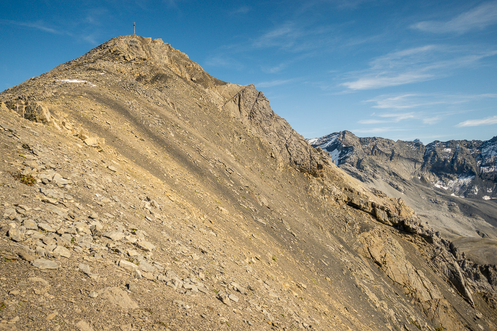 Auf Rügg angelangt, sind wir dem Grasrücken weiter nach Rüggschboden gefolgt, wo er sich aufrichtet und man steil über zunehmendes Geröll bis in eine Mulde bei P.2764 vorstösst. Durch diese oder an ihren Rändern entlang, über einzelne leicht zu umgehende oder überkletternde Felsabsätze auf dem zuletzt engen Grat zum Gipfel.