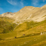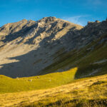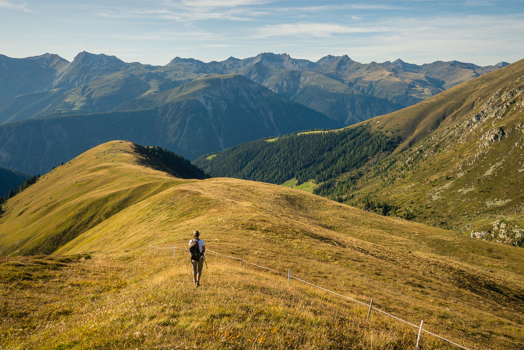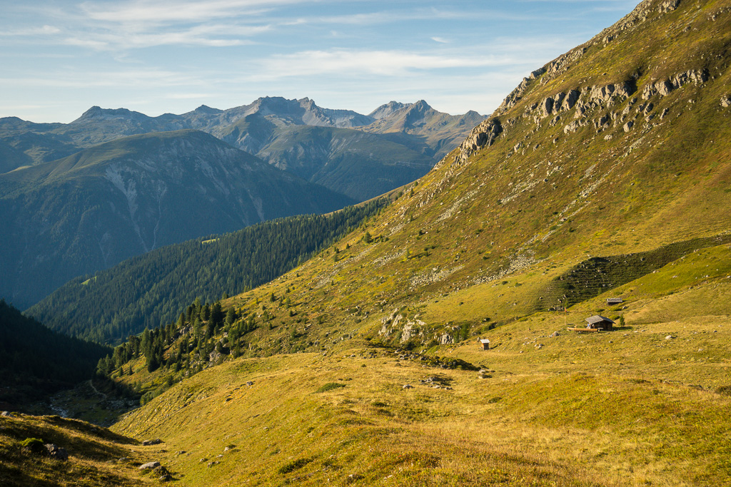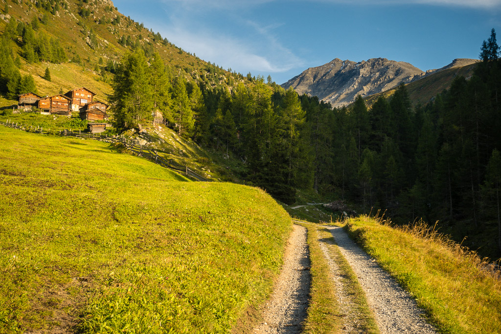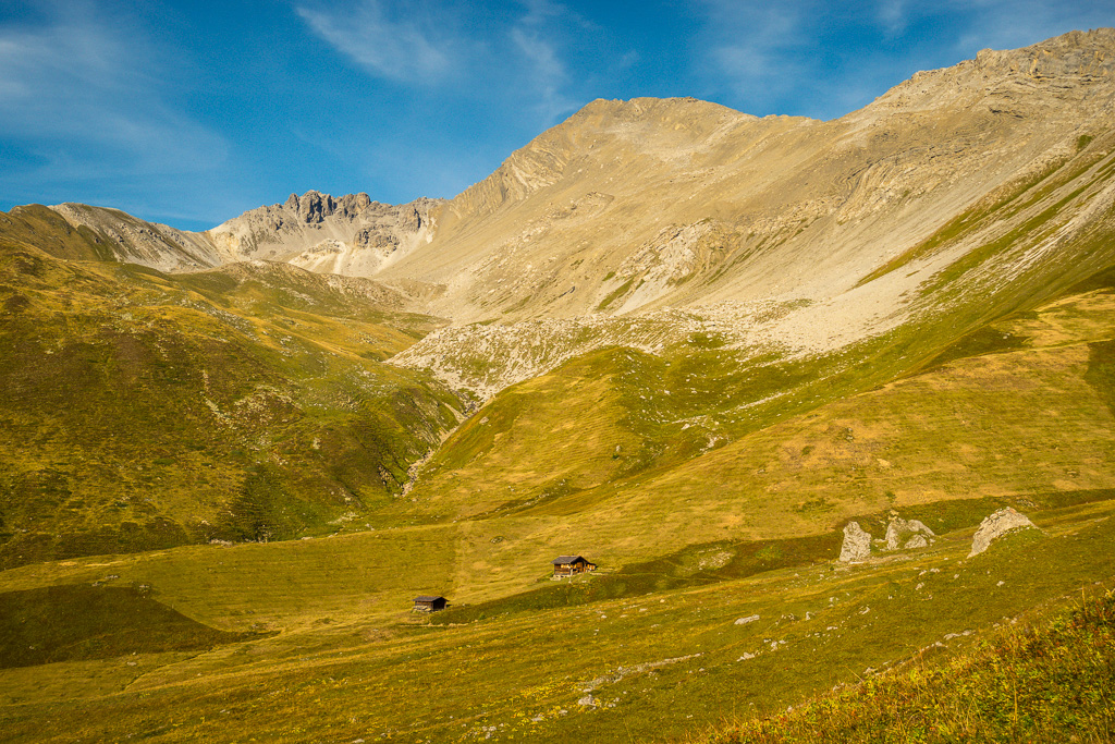 Auf der Aufstiegsroute wieder nach Rüggschboden zurück. Hier rechts (nördlich) über Grashänge weglos absteigen zu den Hütten von Fanezmeder, wo man auf einen Wanderweg zurück nach Oberalp stösst.