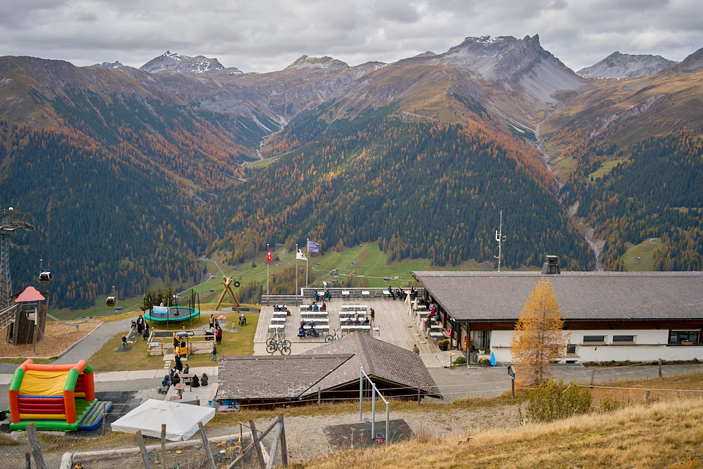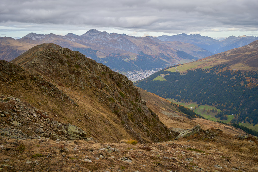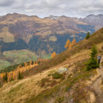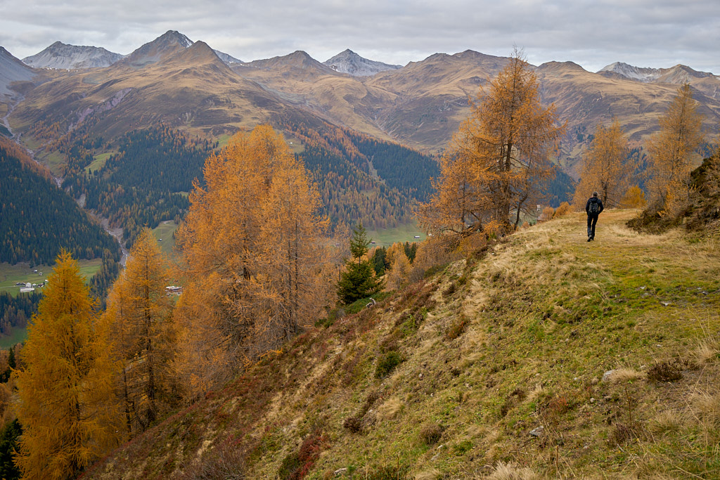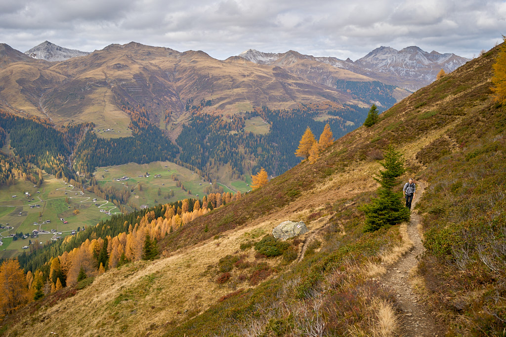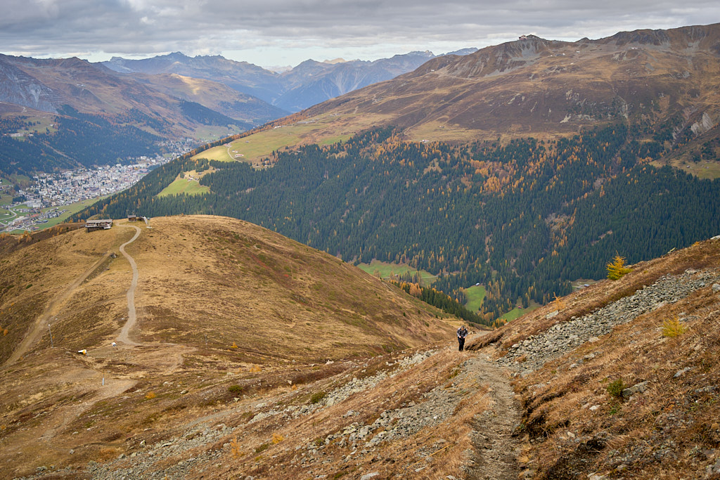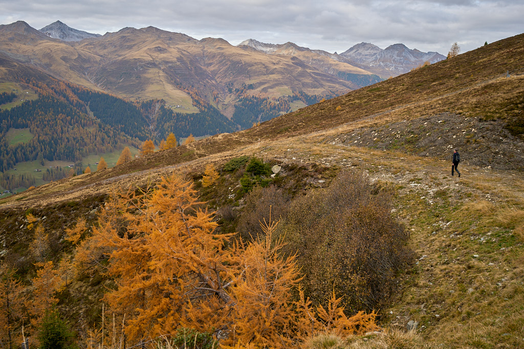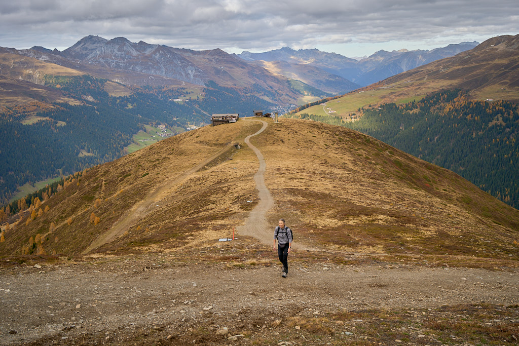 vom Parkplatz in Davos Glaris zur Bergstation Jatzmeder der Rinerhornbahn. Danach Wanderung von Jatzmeder aufs Rinerhorn und weiter zum Marchhüreli. Abstieg über ein Geröllfeld zur Bergstation des Nüllisch-Lifts. Dann mit ständigem wunderschönem Herbstpanorama vor der Nase am Nüllischgrat vorbei zurück nach Jatzmeder und Rückfahrt ins Tal mit dem Bike.