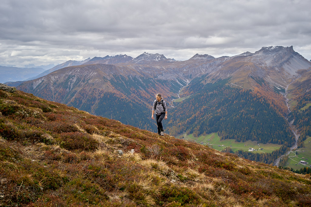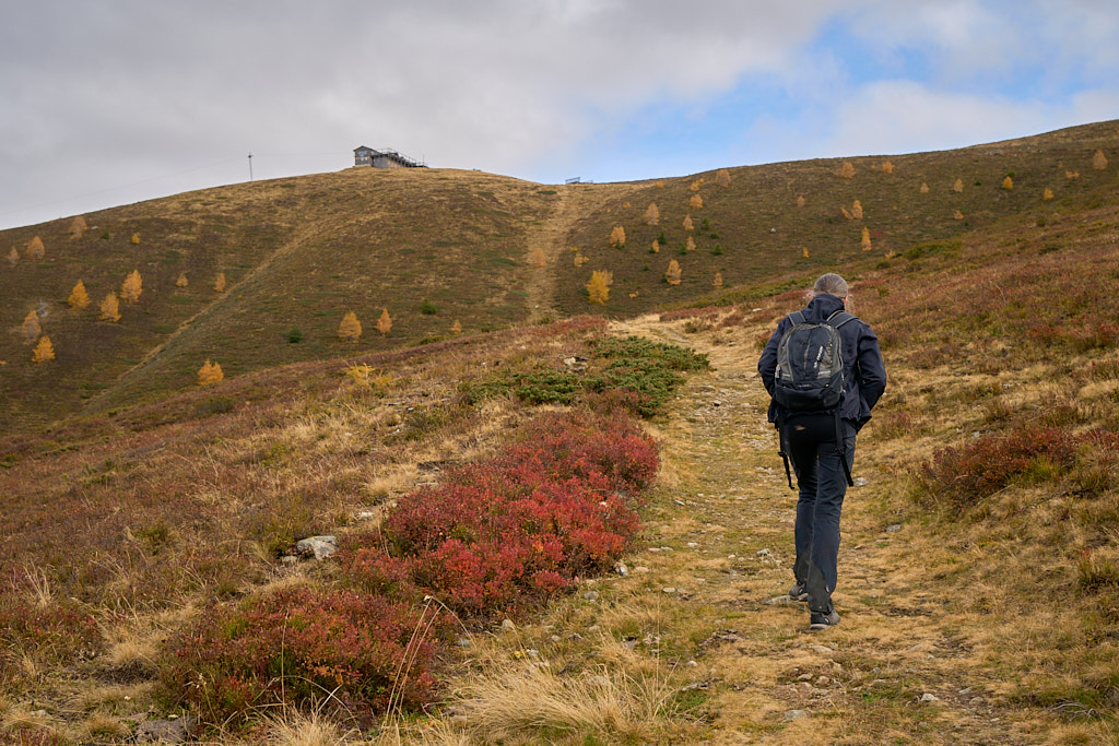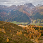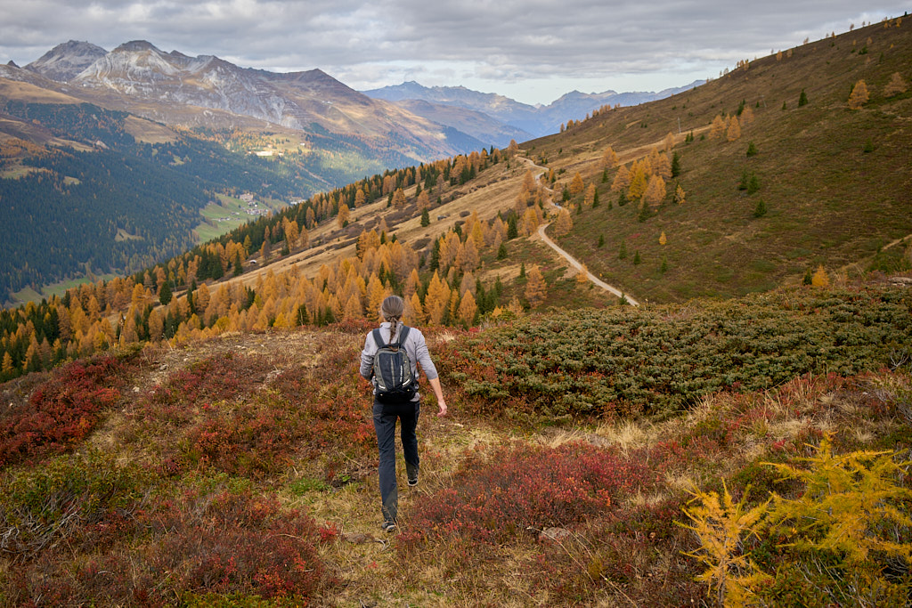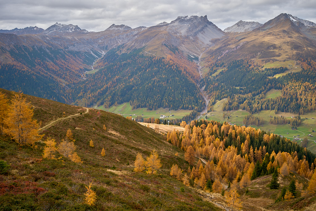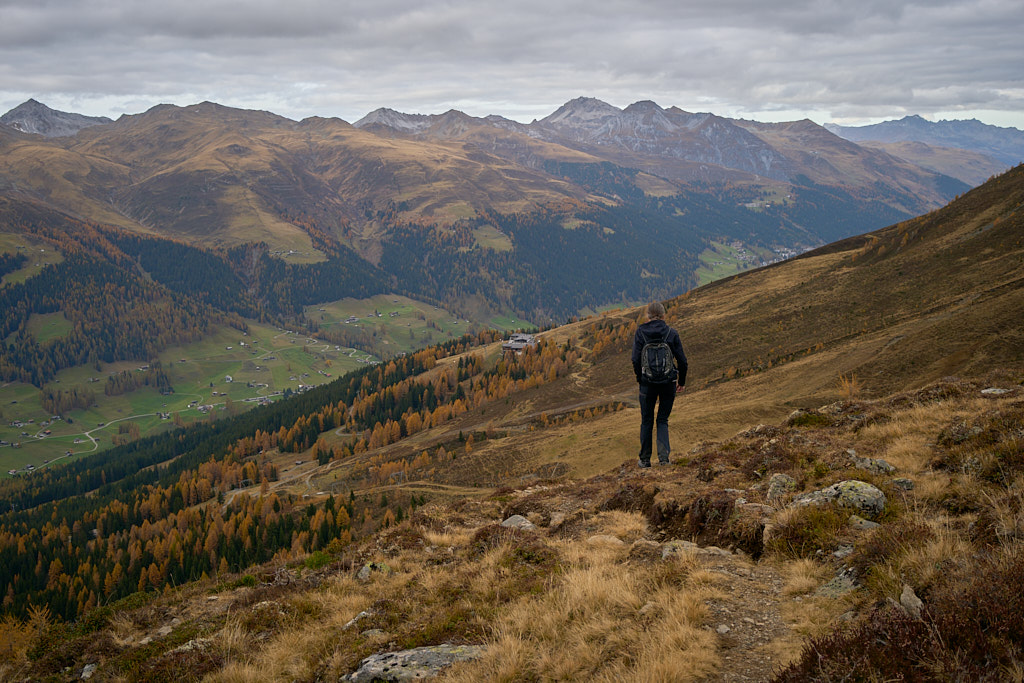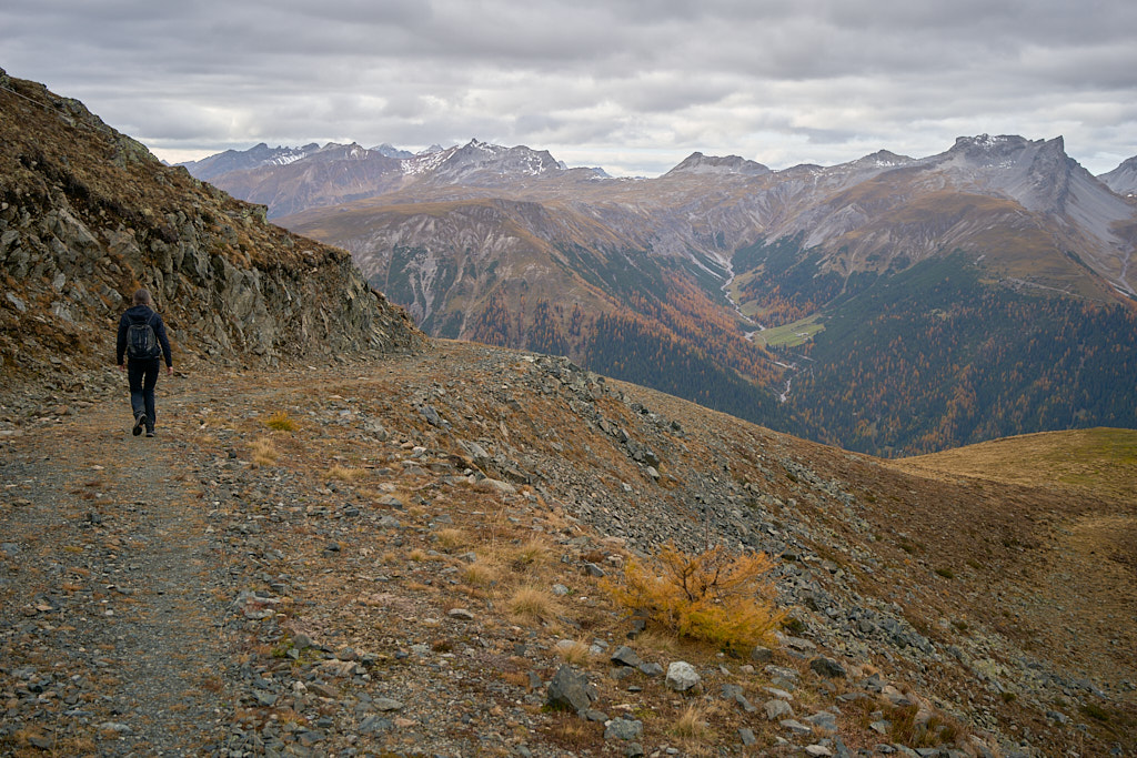 vom Parkplatz in Davos Glaris zur Bergstation Jatzmeder der Rinerhornbahn. Danach Wanderung von Jatzmeder aufs Rinerhorn und weiter zum Marchhüreli. Abstieg über ein Geröllfeld zur Bergstation des Nüllisch-Lifts. Dann mit ständigem wunderschönem Herbstpanorama vor der Nase am Nüllischgrat vorbei zurück nach Jatzmeder und Rückfahrt ins Tal mit dem Bike.