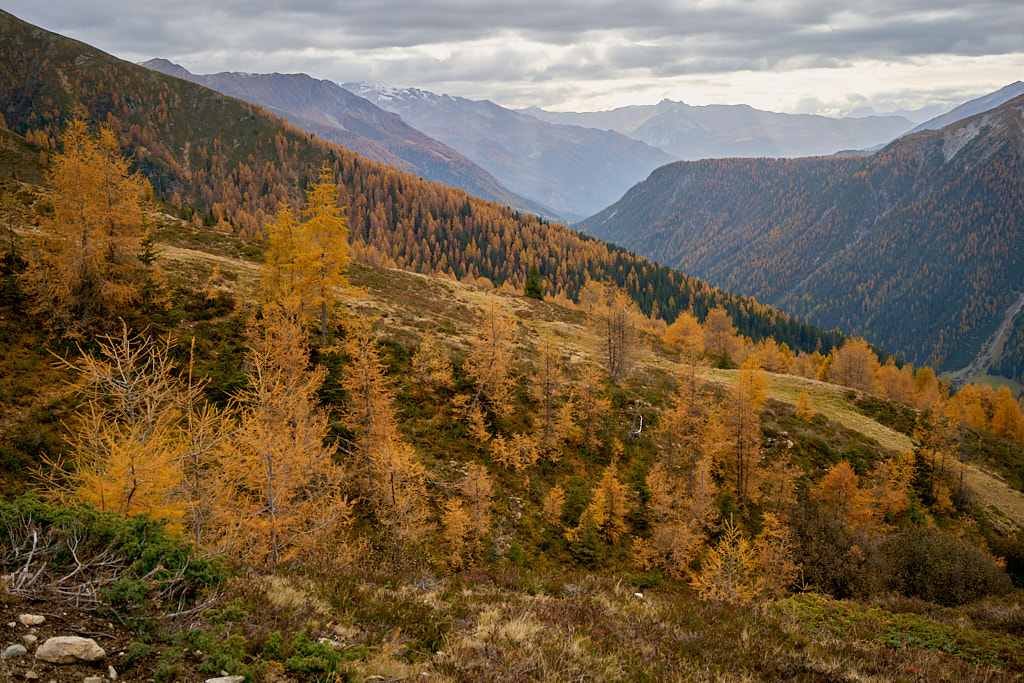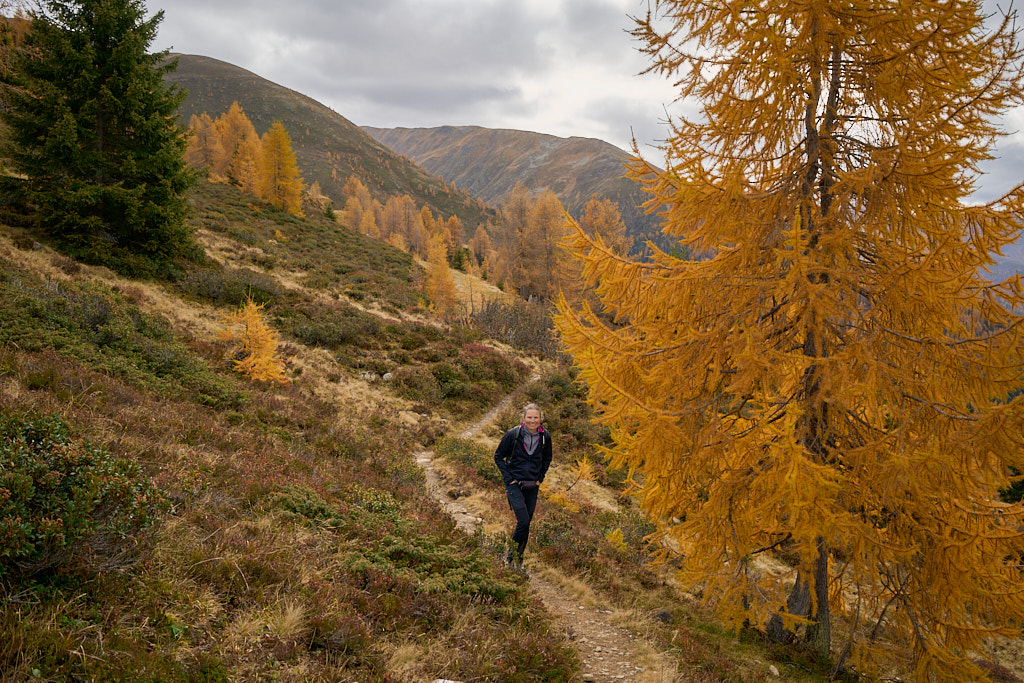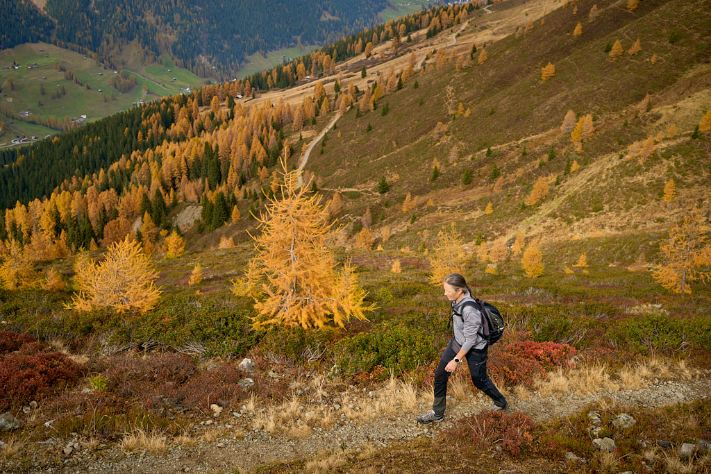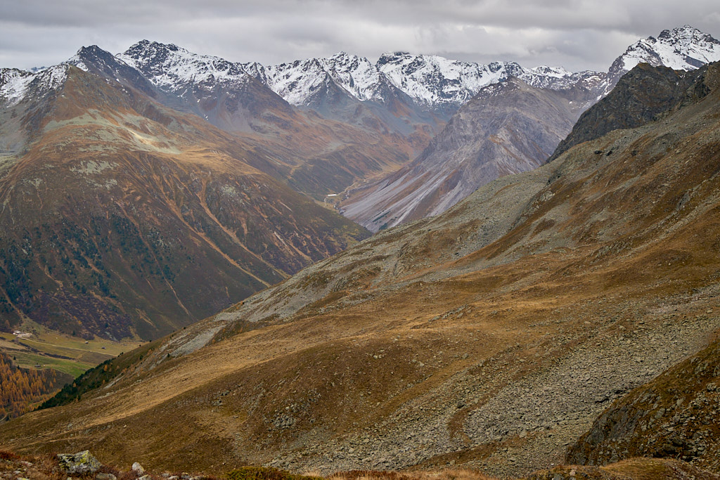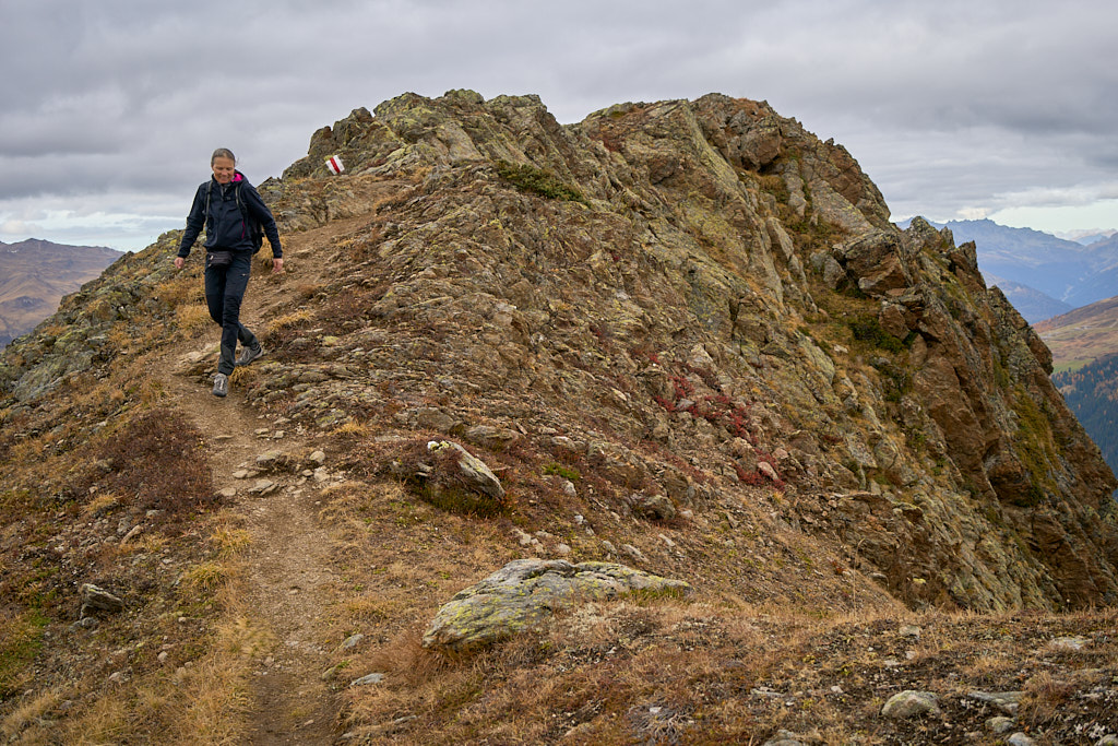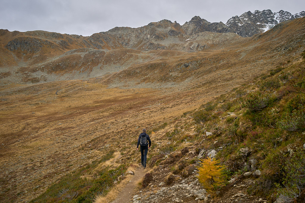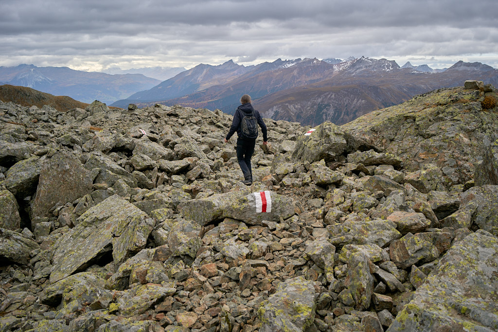 vom Parkplatz in Davos Glaris zur Bergstation Jatzmeder der Rinerhornbahn. Danach Wanderung von Jatzmeder aufs Rinerhorn und weiter zum Marchhüreli. Abstieg über ein Geröllfeld zur Bergstation des Nüllisch-Lifts. Dann mit ständigem wunderschönem Herbstpanorama vor der Nase am Nüllischgrat vorbei zurück nach Jatzmeder und Rückfahrt ins Tal mit dem Bike.