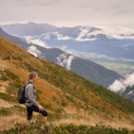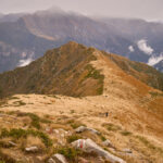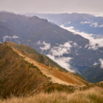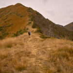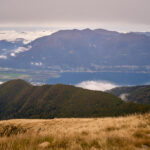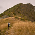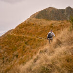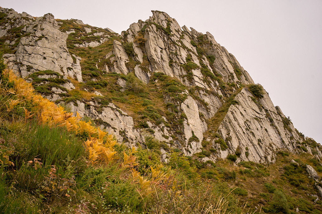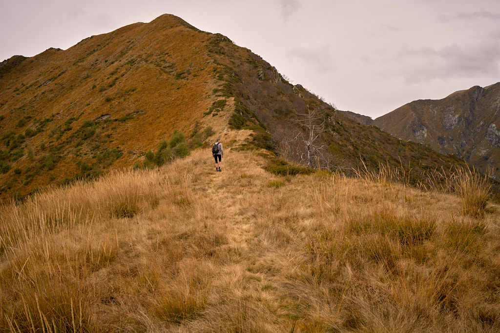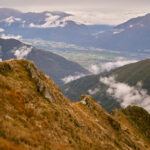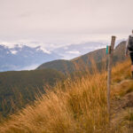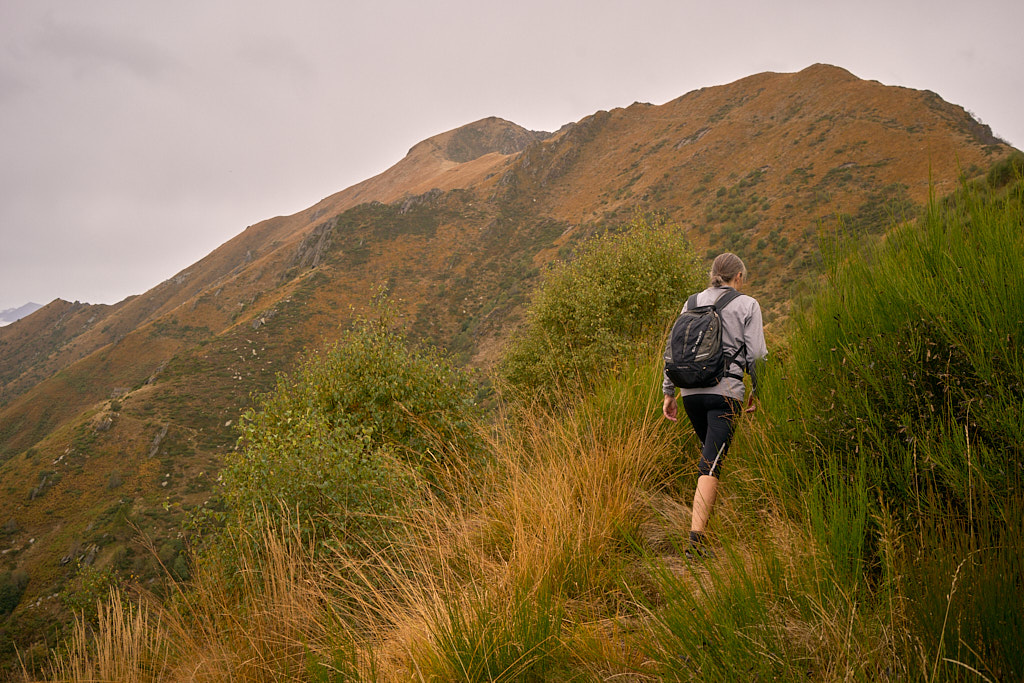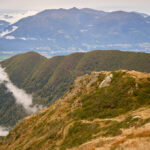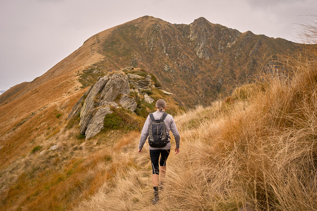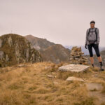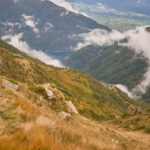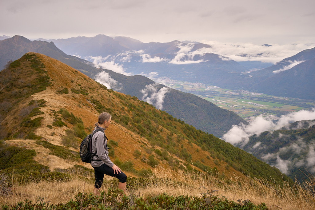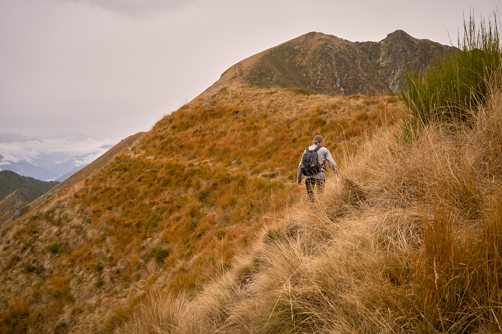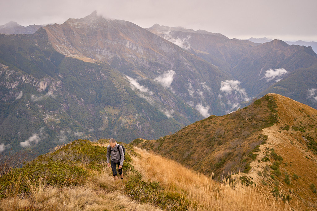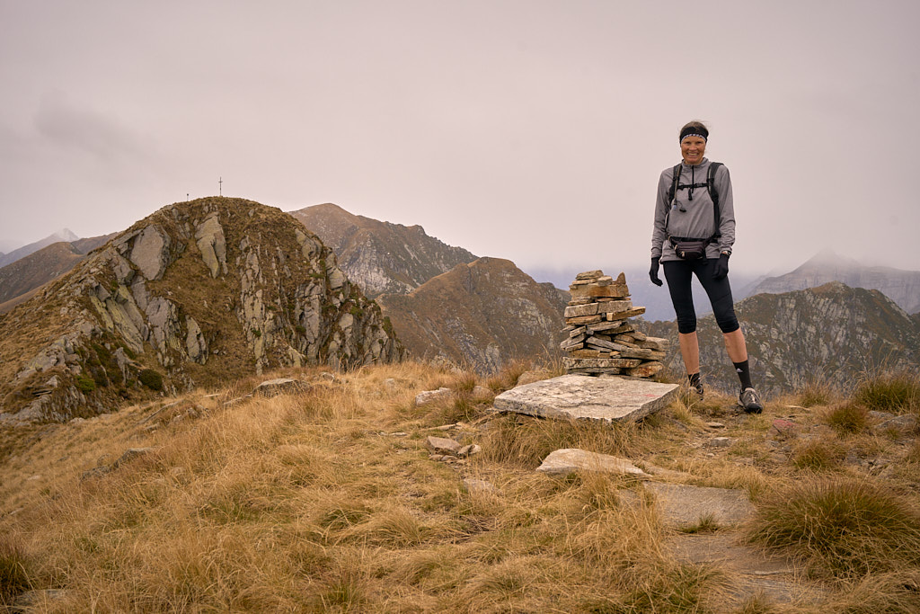 Wir kamen schlussendlich auf einem Sattel mit einem Wegweiser an, laut dem wir uns nun auf dem Madone befanden. Dies konnte aber unmöglich sein, da der Grasrücken dahinter noch weiter aufstieg. Wir hatten aber auch schon während geraumer Zeit feststellen müssen, dass das Wetter zunehmend ungemütlicher wurde, in der exponierten Lage hier ein heftiger Wind wehte und dichte Wolken sich uns langsam aus dem Verzascatal näherten. Wir stiegen aber trotzdem noch weiter bis zu einem ersten Gipfel mit einem Steinmann auf. Offenbar war dies der „Südgipfel”, denn etwas weiter entfernt war von hier aus noch ein zweiter, deutlich felsiger erscheinender Gipfel mit einem Gipfelkreuz sichtbar. Wir überlegten, auch noch dort hinüberzuqueren. Dies hätte uns allerdings geschätzt noch mindestens eine halbe Stunde hin und zurück gekostet, sodass wir angesichts von Wetter und Uhrzeit auf den Abstecher dorthin verzichteten und den Südgipfel zum offiziellen Endpunkt unserer Tour erklärten.