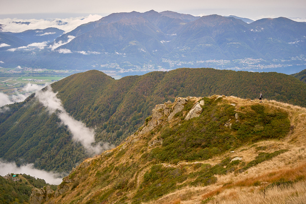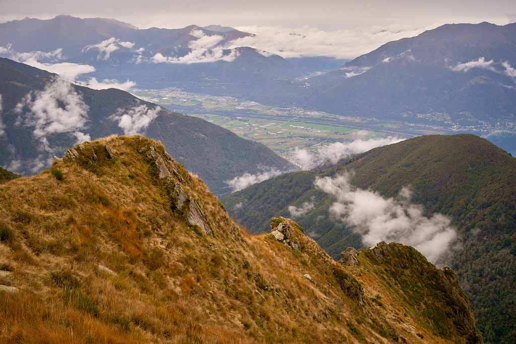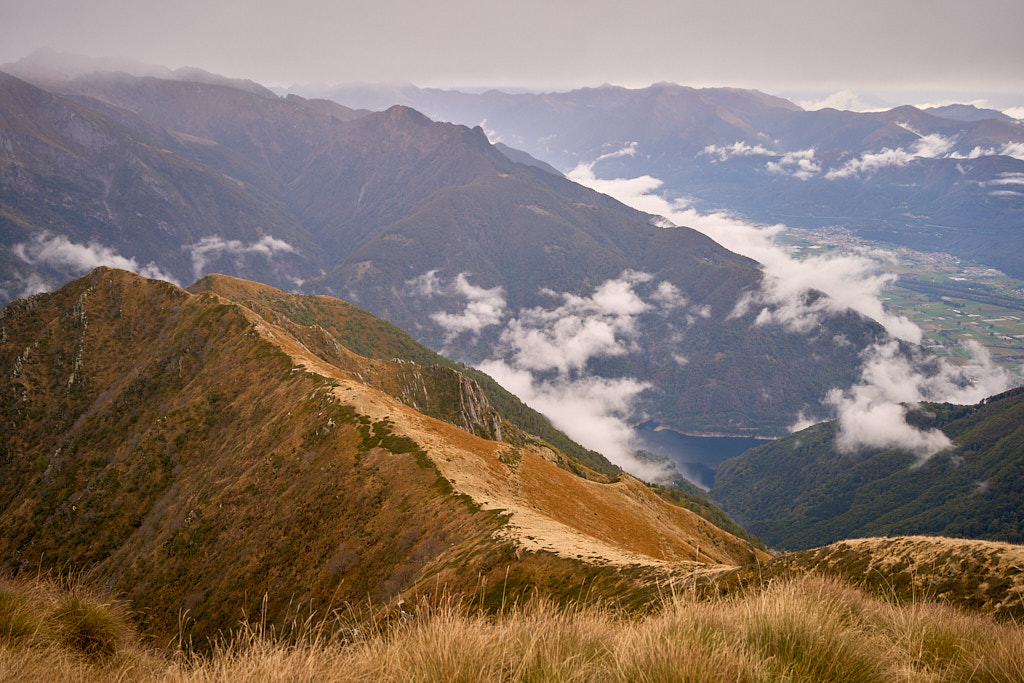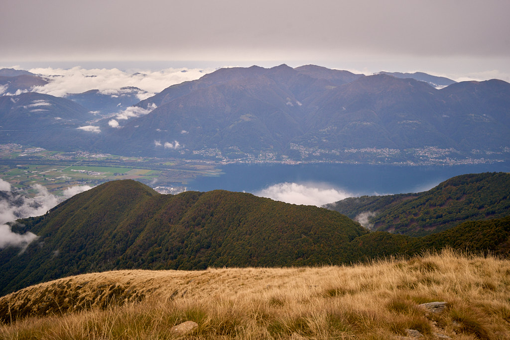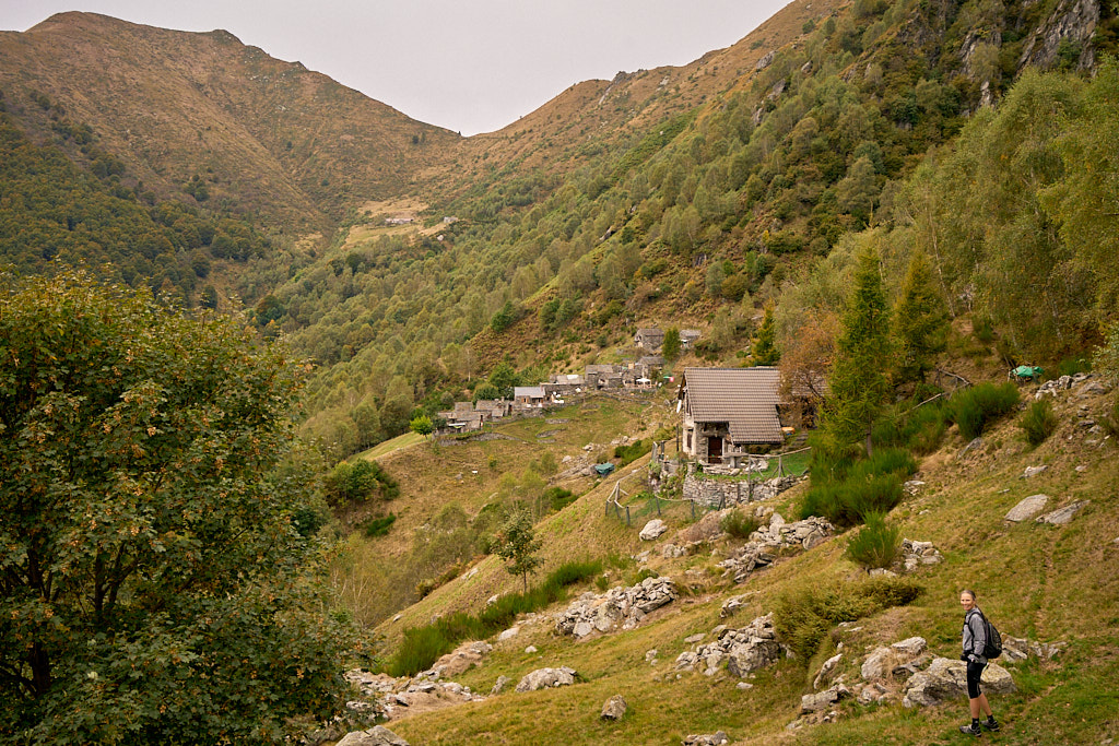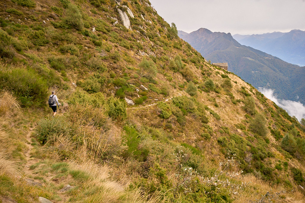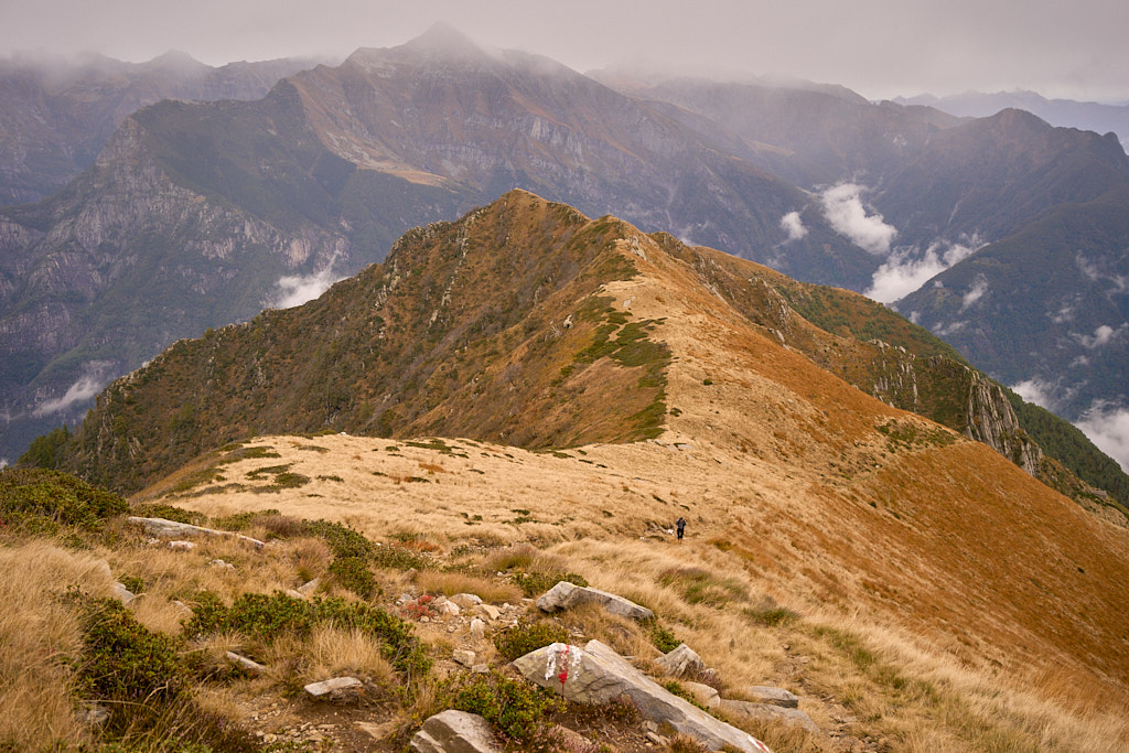 Bei einer grösseren Ansammlung von Hütten bei Porchèsg hatten wir dann die Waldgrenze verlassen und steuerten nun den langsam über uns erkennbaren Ostgrat des Madone an. Dies war kein eigentlicher Felsgrat, sondern mehrheitlich ein gebüsch- und felsdurchsetzter schmaler Grasrücken, der sich in mehreren Stufen und trügerisch als Gipfel erscheinenden Zwischenerhebungen zum eigentlichen Gipfel aufschwang. Wir stiegen lange auf dem Rücken empor, wobei wir einige weglose Buschzonen in der linken Flanke umgingen. In einigen Routenbeschreibungen wurde der Aufstieg als teils weglos und nicht einfach zu finden beschrieben, wir konnten aber durchwegs blauen, wenn auch teils verblichenden oder überwachsenen Markierungen folgen. Der Ausblick weitete sich zusehends und wir bekamen immer mehr vom Verzascatal und vom Lago Maggiore zu sehen. Auch Cima della Trosa und Cimetta, die wir am Folgetag noch besuchen würden, rückten als Nachbargipfel des Madone ins Blickfeld.