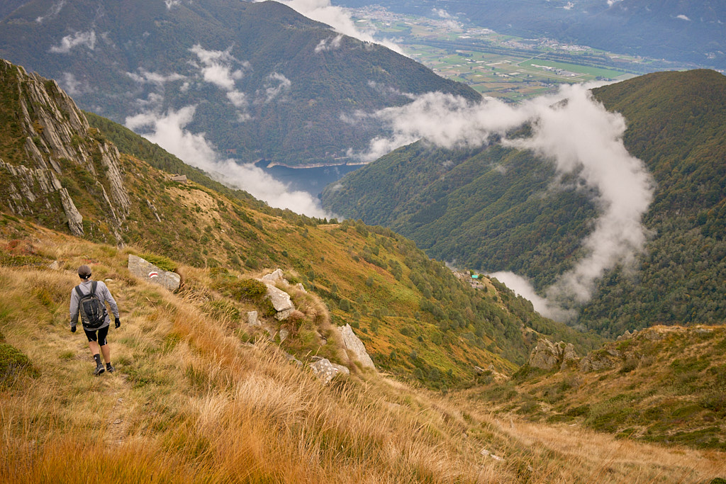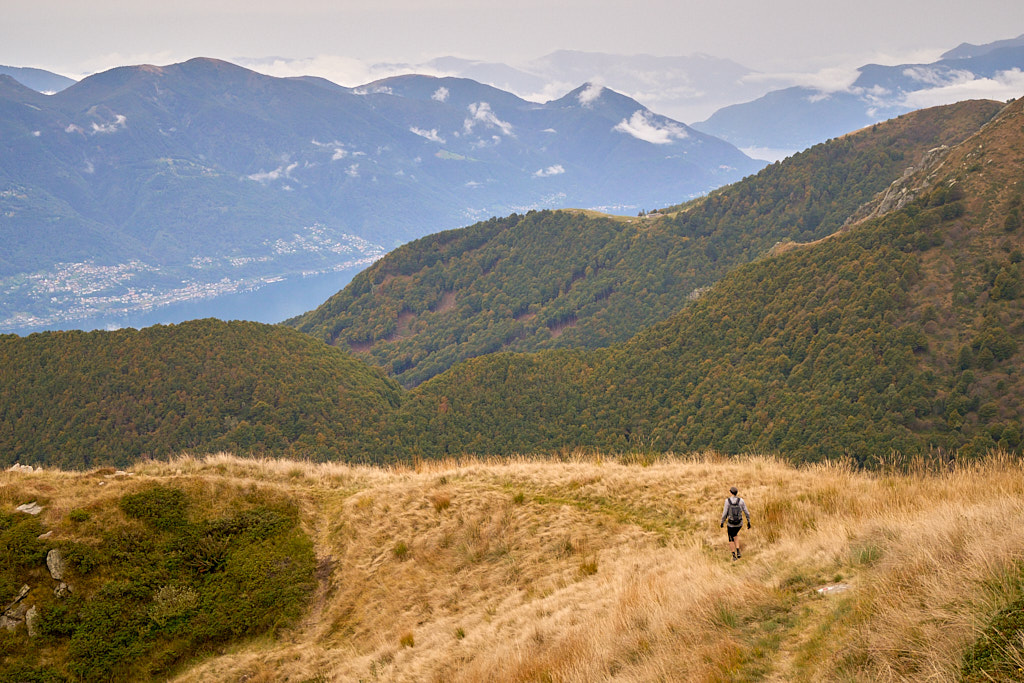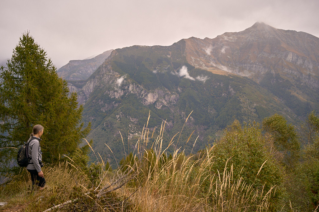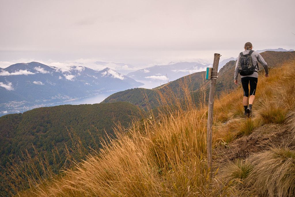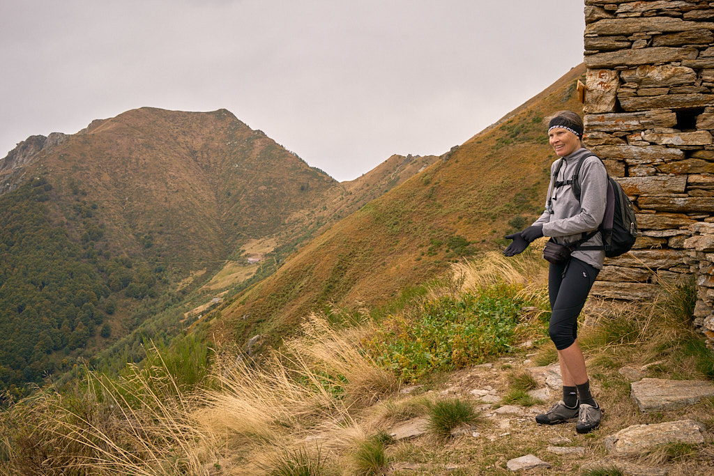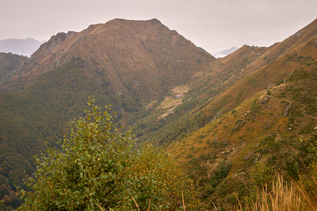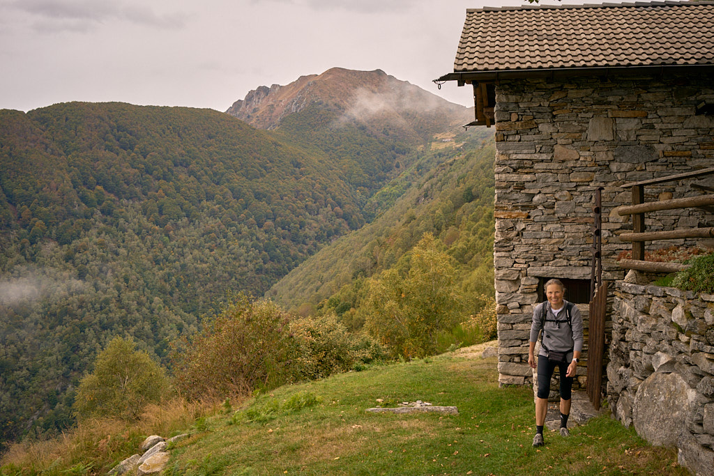 Bei einer grösseren Ansammlung von Hütten bei Porchèsg hatten wir dann die Waldgrenze verlassen und steuerten nun den langsam über uns erkennbaren Ostgrat des Madone an. Dies war kein eigentlicher Felsgrat, sondern mehrheitlich ein gebüsch- und felsdurchsetzter schmaler Grasrücken, der sich in mehreren Stufen und trügerisch als Gipfel erscheinenden Zwischenerhebungen zum eigentlichen Gipfel aufschwang. Wir stiegen lange auf dem Rücken empor, wobei wir einige weglose Buschzonen in der linken Flanke umgingen. In einigen Routenbeschreibungen wurde der Aufstieg als teils weglos und nicht einfach zu finden beschrieben, wir konnten aber durchwegs blauen, wenn auch teils verblichenden oder überwachsenen Markierungen folgen. Der Ausblick weitete sich zusehends und wir bekamen immer mehr vom Verzascatal und vom Lago Maggiore zu sehen. Auch Cima della Trosa und Cimetta, die wir am Folgetag noch besuchen würden, rückten als Nachbargipfel des Madone ins Blickfeld.