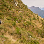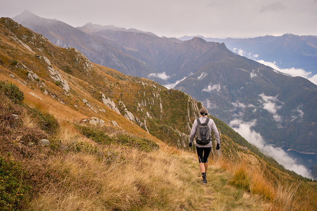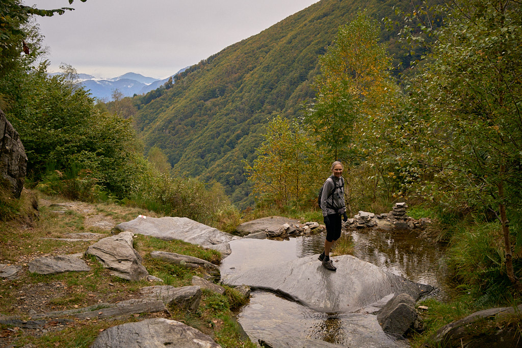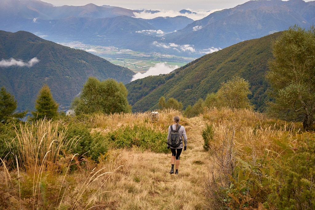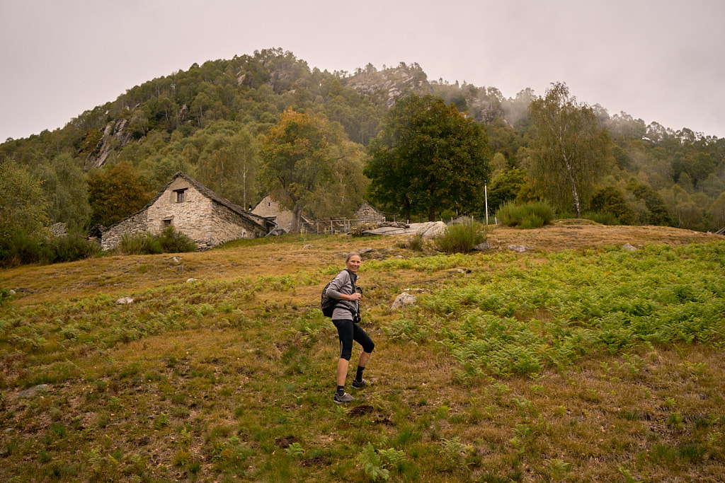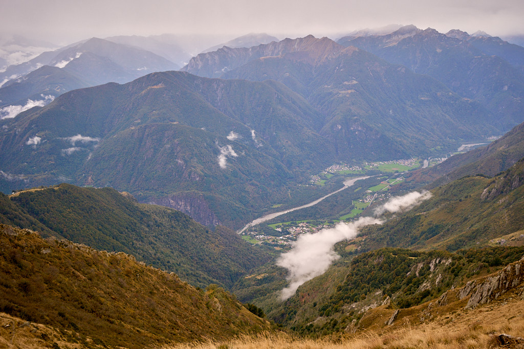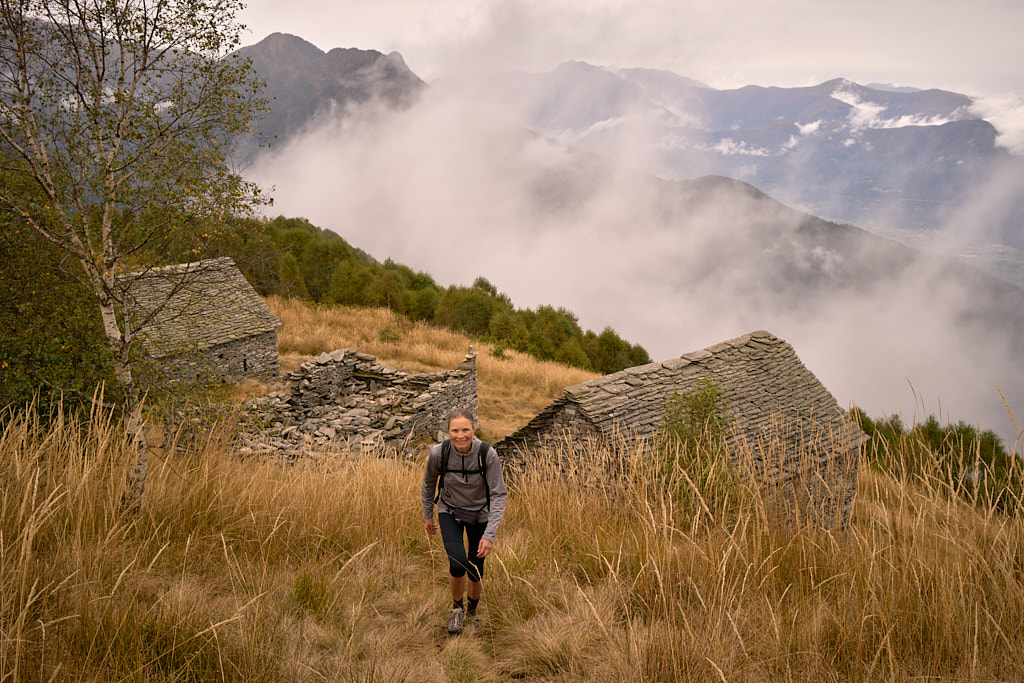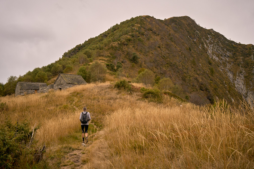 Bei einer grösseren Ansammlung von Hütten bei Porchèsg hatten wir dann die Waldgrenze verlassen und steuerten nun den langsam über uns erkennbaren Ostgrat des Madone an. Dies war kein eigentlicher Felsgrat, sondern mehrheitlich ein gebüsch- und felsdurchsetzter schmaler Grasrücken, der sich in mehreren Stufen und trügerisch als Gipfel erscheinenden Zwischenerhebungen zum eigentlichen Gipfel aufschwang. Wir stiegen lange auf dem Rücken empor, wobei wir einige weglose Buschzonen in der linken Flanke umgingen. In einigen Routenbeschreibungen wurde der Aufstieg als teils weglos und nicht einfach zu finden beschrieben, wir konnten aber durchwegs blauen, wenn auch teils verblichenden oder überwachsenen Markierungen folgen. Der Ausblick weitete sich zusehends und wir bekamen immer mehr vom Verzascatal und vom Lago Maggiore zu sehen. Auch Cima della Trosa und Cimetta, die wir am Folgetag noch besuchen würden, rückten als Nachbargipfel des Madone ins Blickfeld.