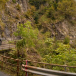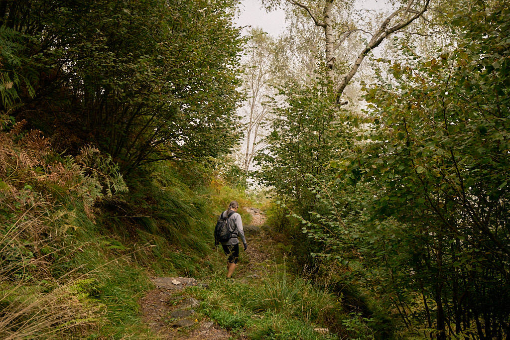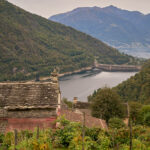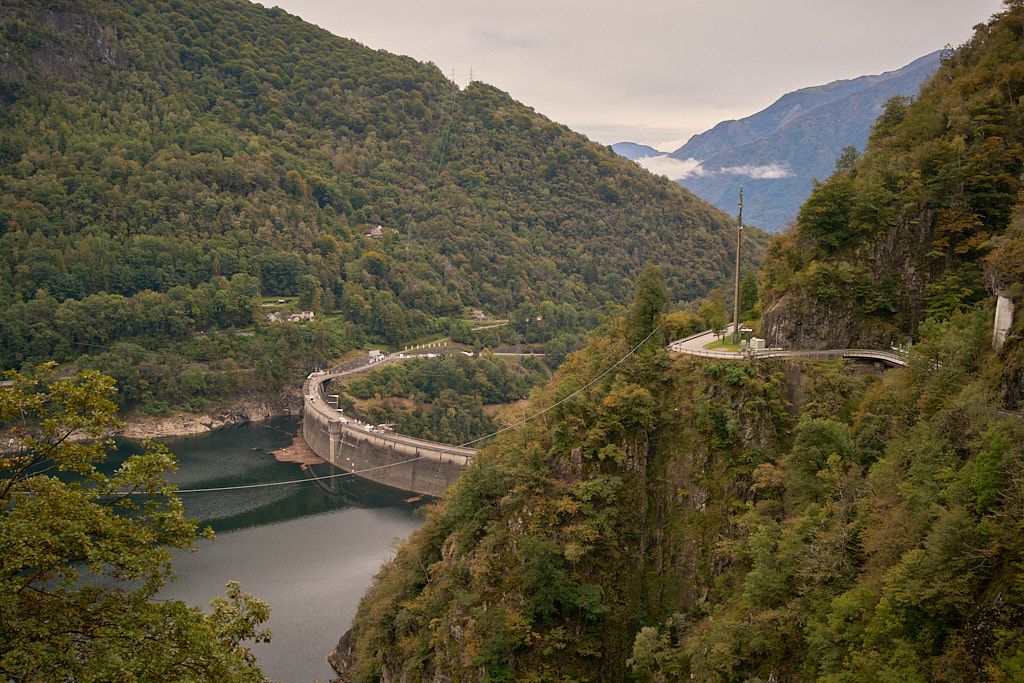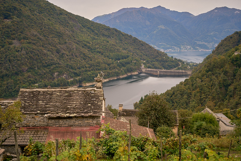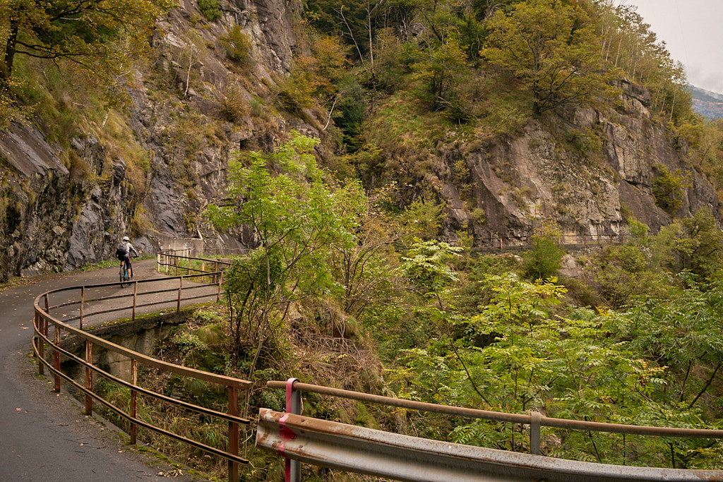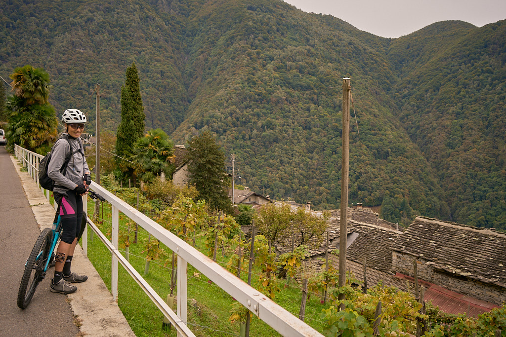 Die von uns anvisierte Aufstiegsroute führte von Mergoscia über den „Ostgrat” auf den Madone. Wir begaben uns also wieder einmal mit unseren Bikes auf die Strasse von Contra nach Mergoscia, die wir bereits von unseren Ausflügen ins Verzascatal her kannten. Diesmal fuhren wir aber an der Abzweigung zum Wanderweg auf die Staumauer vorbei und weiter bis zum Eingang eines kilometerlangen Tunnels, der den Berg direkt nach Mergoscia unterquerte. Wir mussten ihn aber zum Glück nicht benutzen, sondern konnten auf der früheren, nunmehr für den Verkehr gesperrten Strasse dem Hang entlang zum Dorfeingang fahren. Diese Strecke war sehr malerisch, verlief grösstenteils durch den Wald und bot aber immer wieder Ausblicke auf den Lago di Vogorno unter uns.