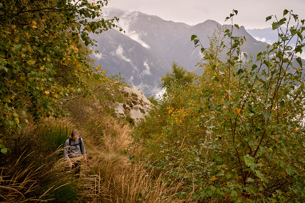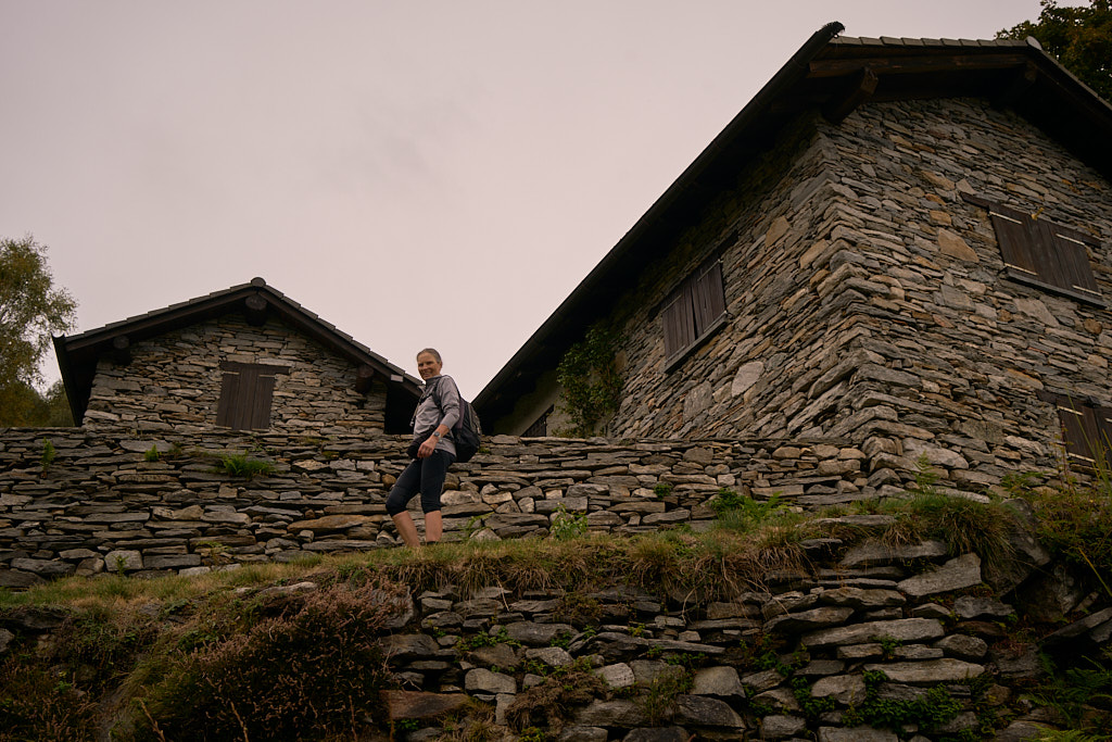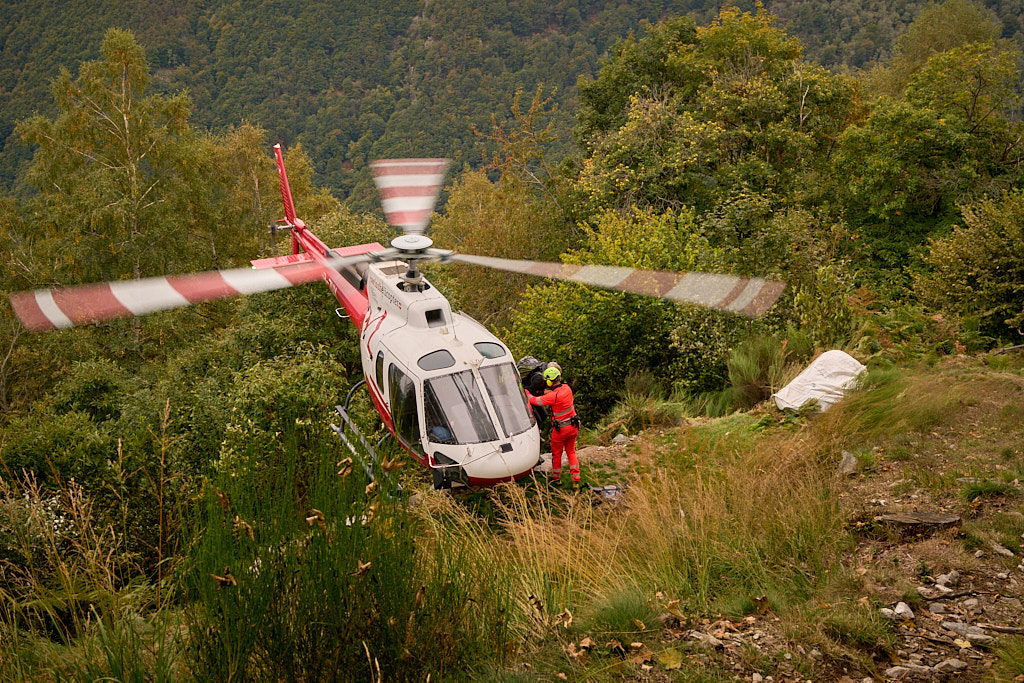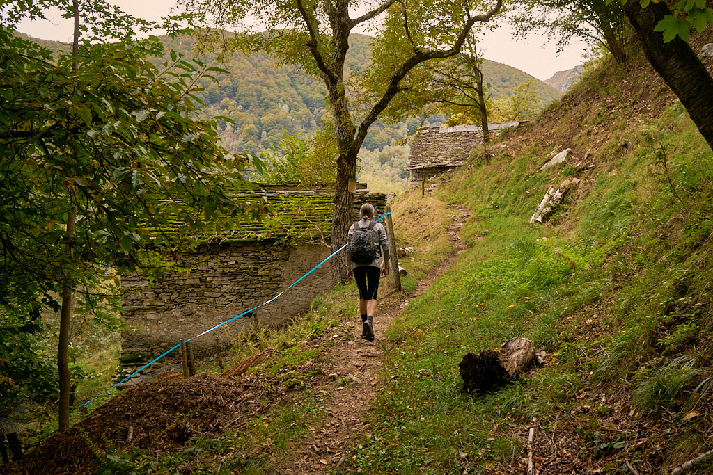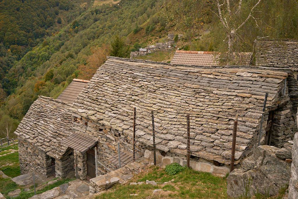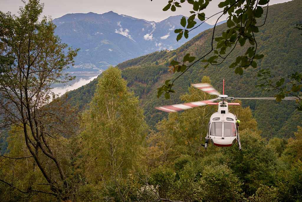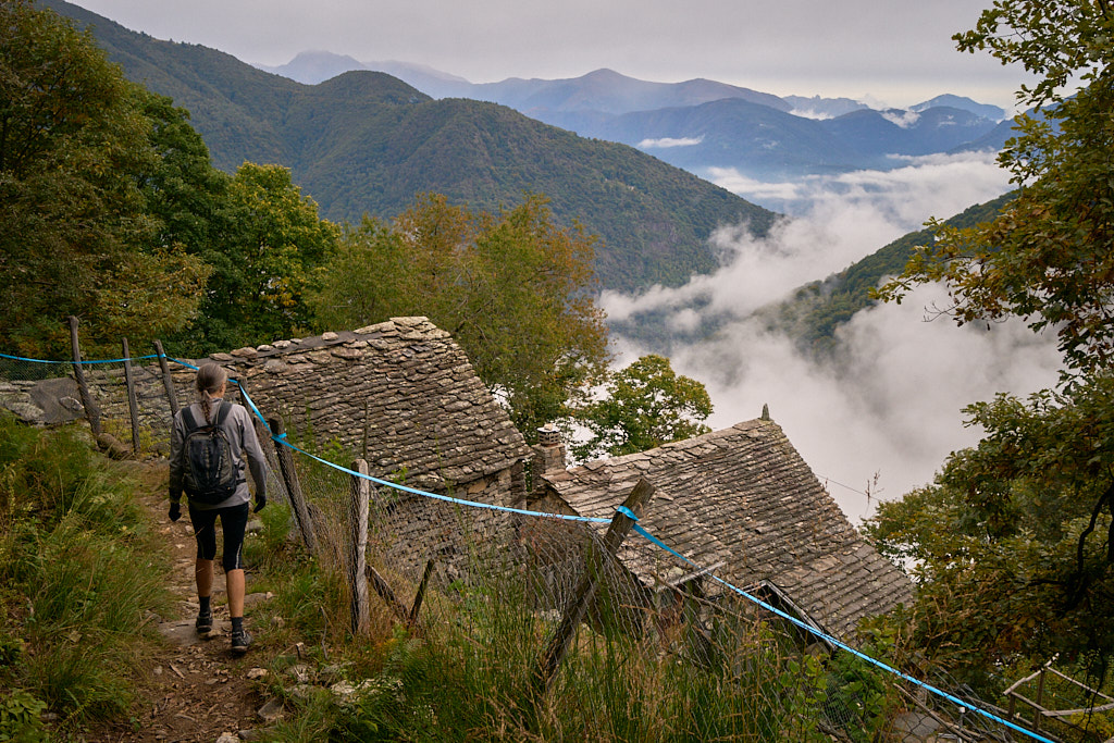 Der Weg führte im Zickzack steil durch den Wald und an zahlreichen mehr oder weniger verfallenen Alphütten vorbei. Dieser Schein konnte jedoch trügen. Bei einem Ziegenstall versuchte ich, den verrosteten Riegel der Holzpforte zu öffnen und einen Blick ins Innere zu erhaschen. Dabei fiel mir das ganze desolate Schloss mitsamt Beschlägen zu Boden, sodass ich es irgendwie wieder an die Holzbalken befestigte und weiterging. Wenige Meter später knatterte es plötzlich aus dem Tal und ein Helikopter stieg unvermittelt hinter den Bäumen herauf. Während wir unseren Augen nicht trauten, setzte er tatsächlich genau neben jener Scheune zur Landung an, bei der ich eine Minute zuvor noch am Werk war. Wegen der kleinen Waldlichtung konnte er zwischen den Bäumen nur mit den Kufen am Rand der Stützmauer aufsetzen. Ein älteres Paar stieg aus und bewegte sich gebückt zur Hütte, während der Hubschrauber mit lautem Getöse wieder ins Tal entschwand. Wir hatten uns schon zuvor gewundert, ob diese Hütten überhaupt noch benutzt werden und wie ihre Besitzer sie wohl nur auf mühsamen Pfaden erreichen können. Aber der Linienflug aus der Luft scheint für einige von ihnen offenbar auch eine gangbare Alternative zu sein.