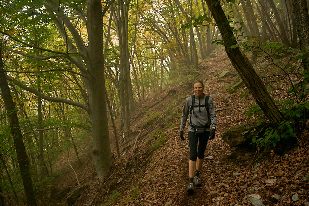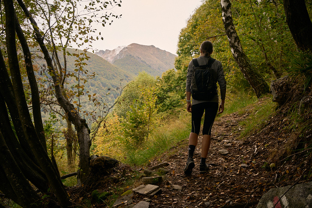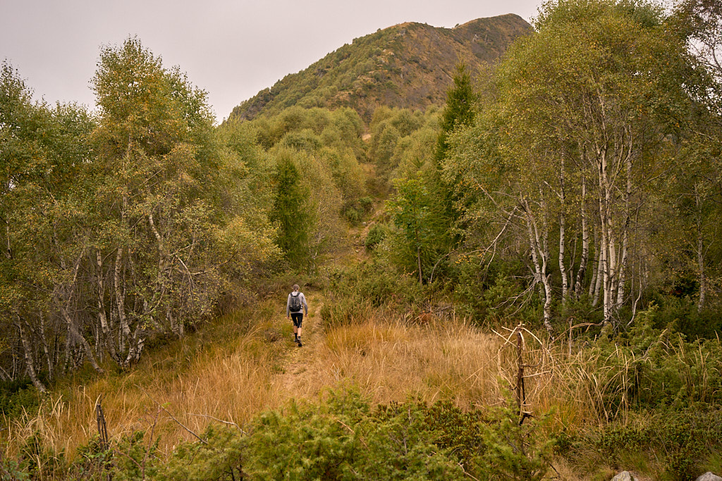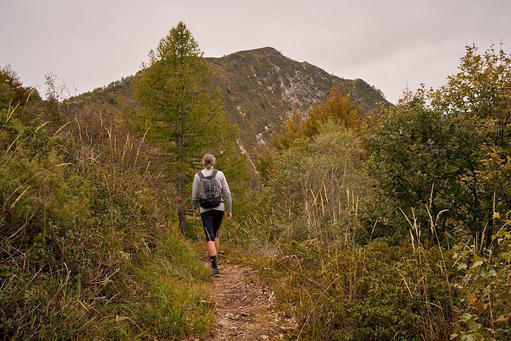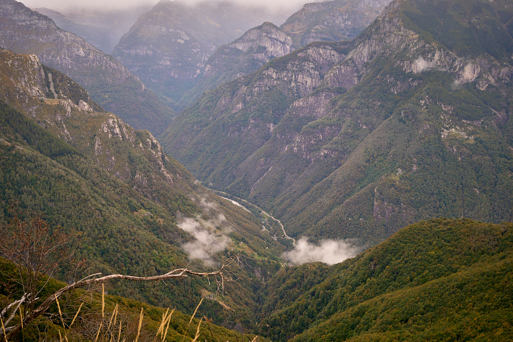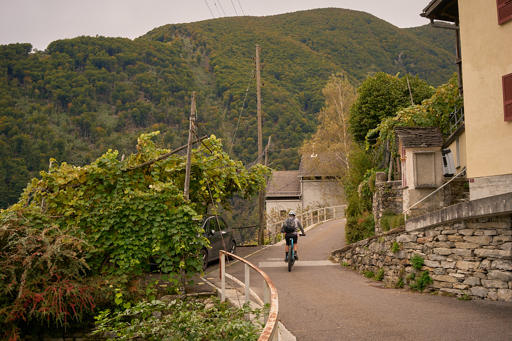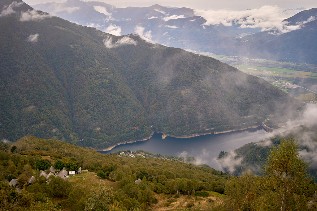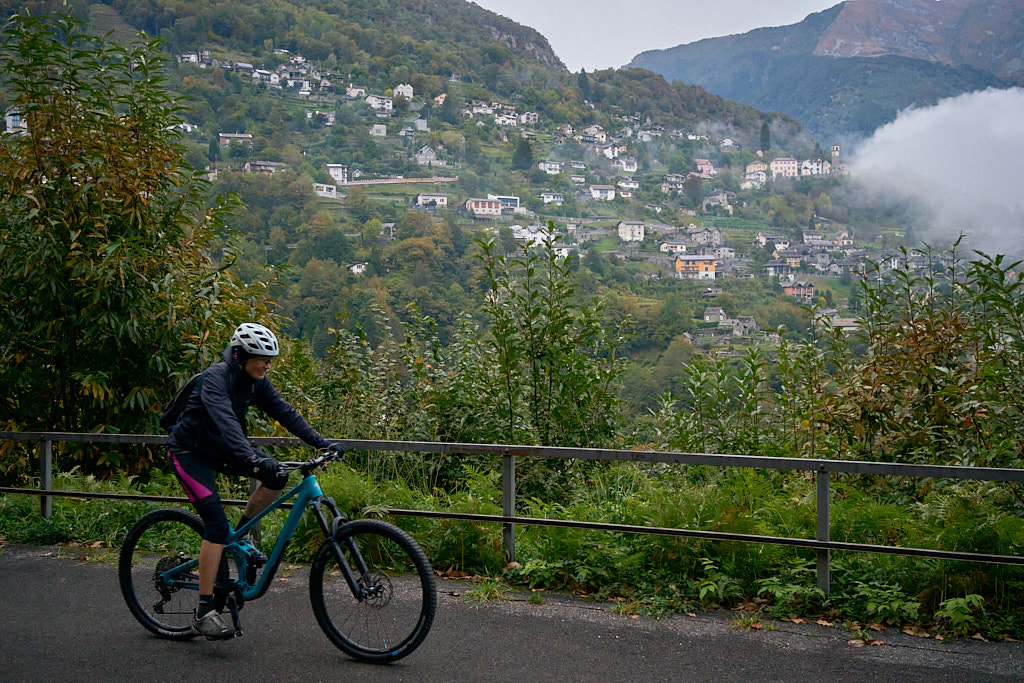 Wir stiegen nicht auf dem Hinweg vom Madone ab, sondern in der windgeschützten Südseite des Ostgrats zur Alpe Rocca und von dort aus weiter zu den Hütten von Mota di Sopra und Bresciàdiga. Hier stiegen wir in den Wald ein und ich war froh, dass wir vorhin nicht noch allzuviel Zeit in der Gipfelzone verbracht hatten. Im dichten Wald wurde es in der aufkommenden Dämmerung nämlich zunehmend düster und tatsächlich verpassten wir unterwegs auch den richtigen Weg, ohne Konsequenzen allerdings. In Mergoscia erreichten wir wieder unsere Bikes und fuhren auf der schönen Strecke hoch über dem Lago di Vogorno zurück nach Contra.