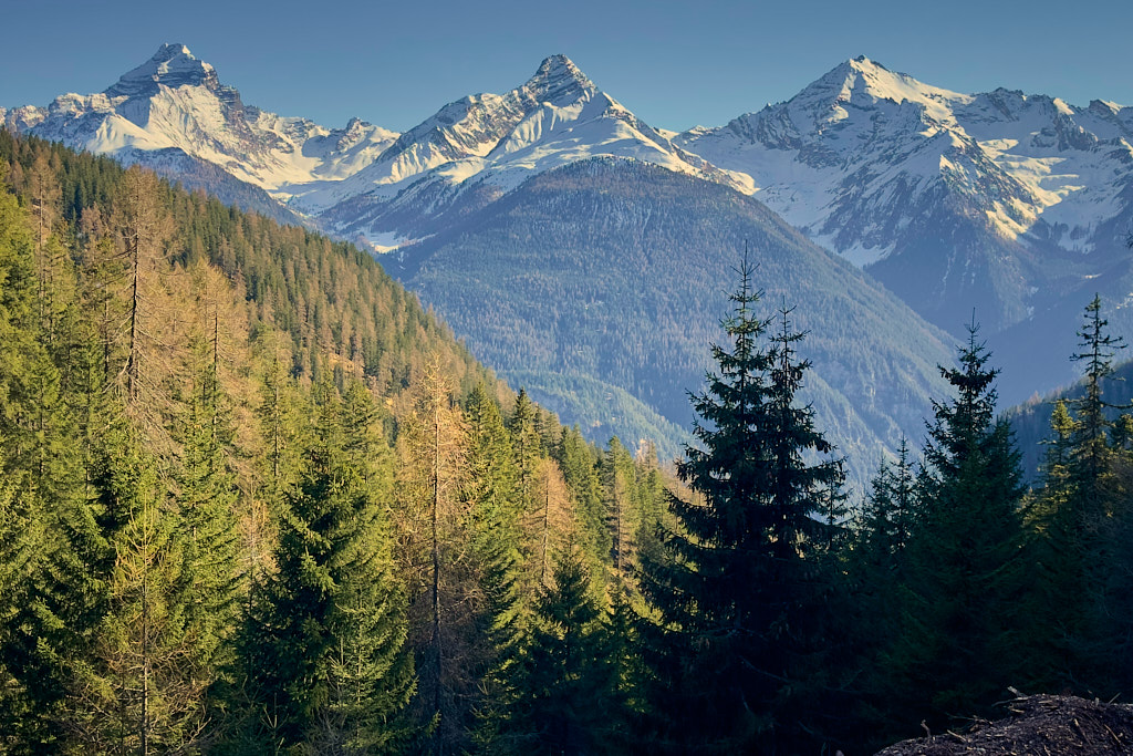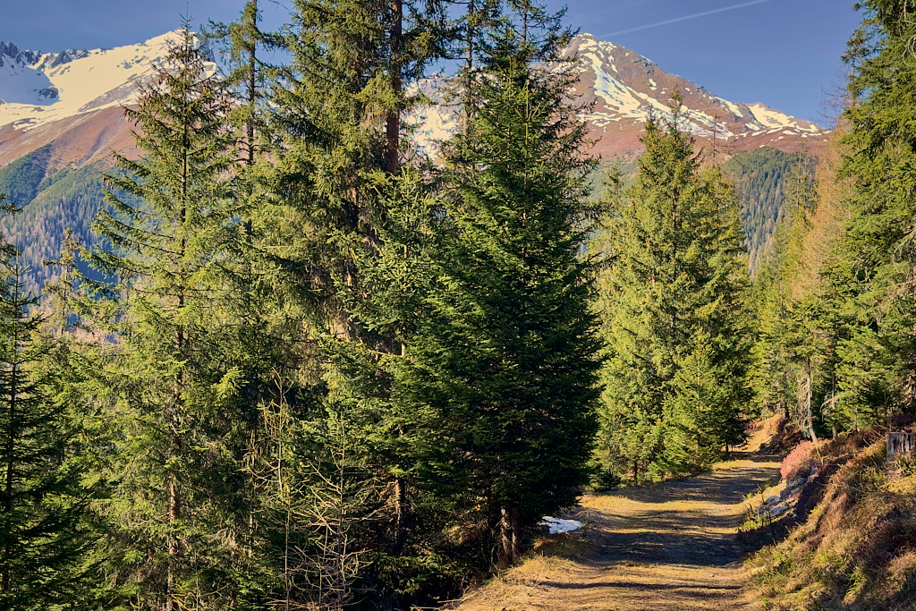 Auf der Schmittner Alpstrasse (bis auf wenige Meter schneefrei) zur Kreuzung nach Grünwald. Abfahrt über Hirtenstock und alten Pardelaweg.