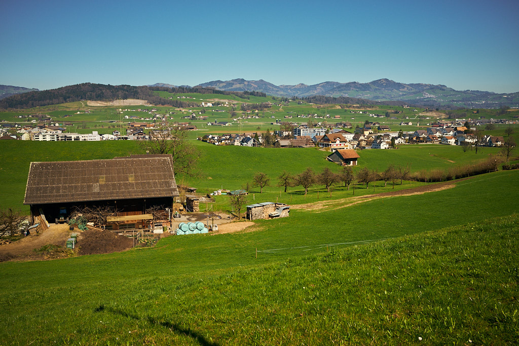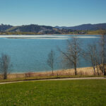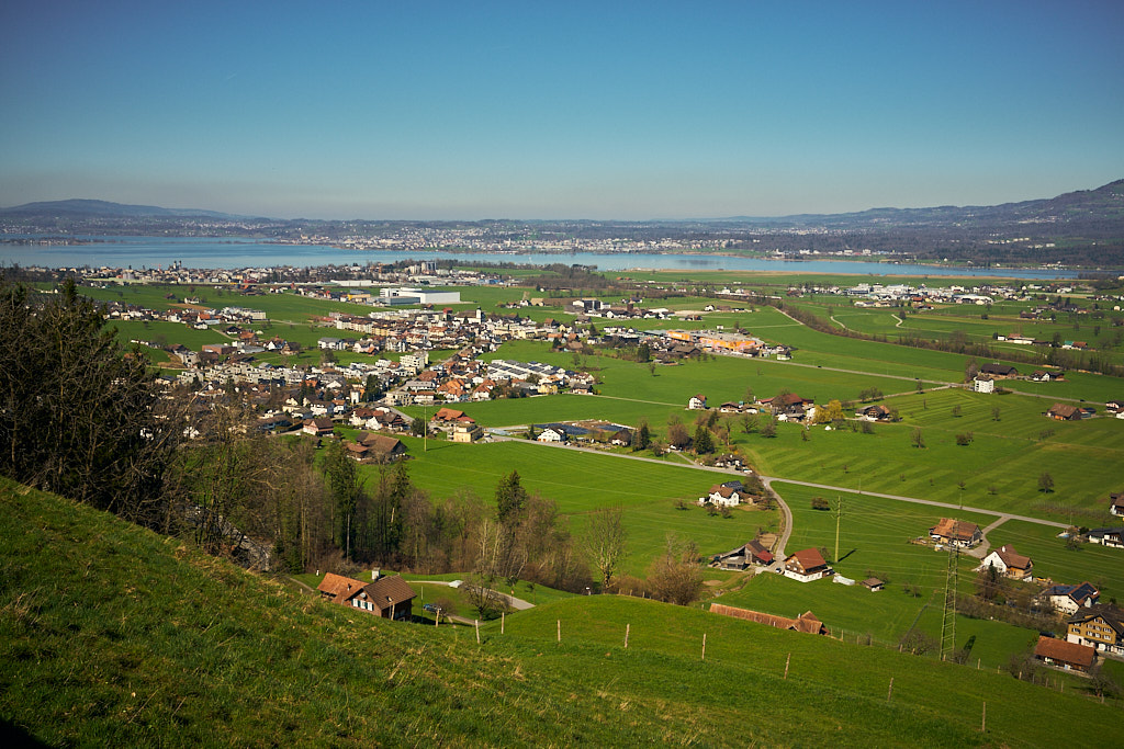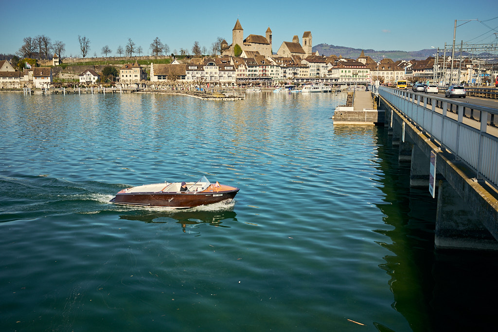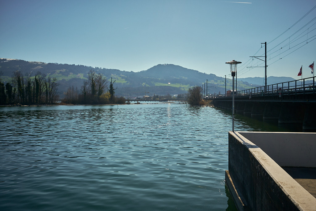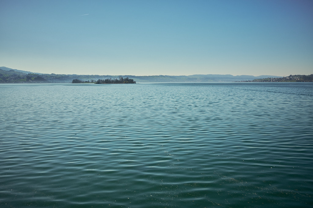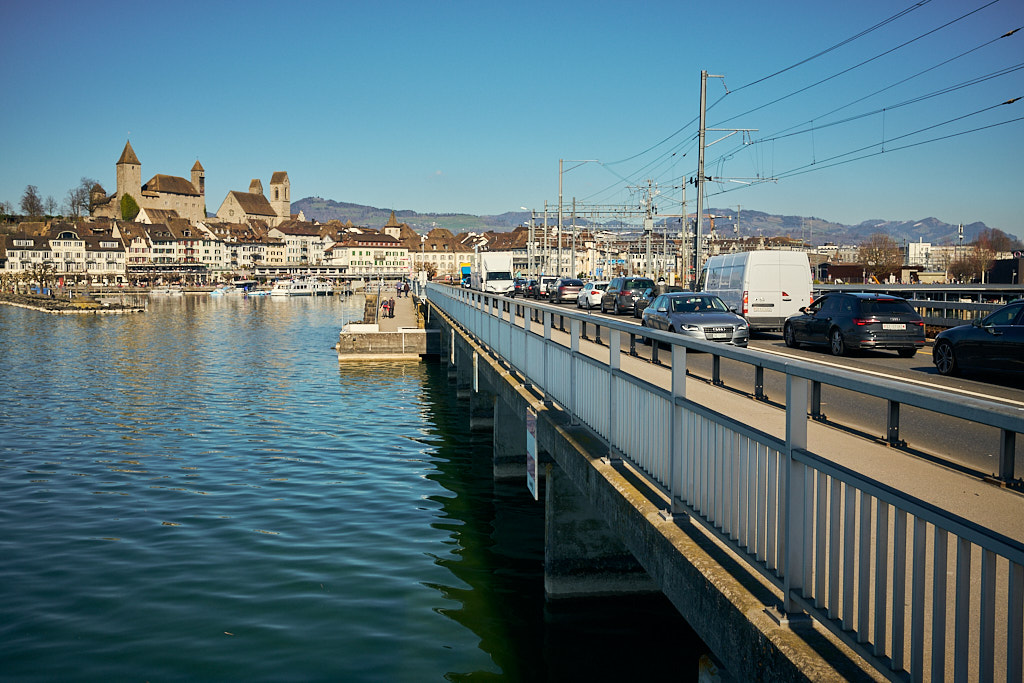 Nach Pfäffikon folgte die Überquerung des Seedamms nach Rapperswil und wieder zurück in den Kanton St. Gallen. Der Seedamm trennt den Zürichsee von seinem östlichen Anhängsel, dem Obersee. Die Autos standen auf dem Damm im Stau. Auf beiden Seiten der Strasse verliefen Rad- und Fussgängerwege, auf denen sich unzählige Spaziergänger und Radfahrer kreuzten. Ich hatte nicht im entferntesten damit gerechnet, dass sich an einem normalen Wochentag derart viele Leute in der Sonne tummeln würden. Dementsprechend langsam kam ich nun vorwärts, immerhin trotz allem noch schneller als die Autokolonne neben mir, und erreichte schlussendlich Rapperswil. Angesichts des Trubels verzichtete ich auf einen Abstecher in die Altstadt und fuhr stattdessen am Bahnhof und durch die angrenzenden Wohnquartiere direkt weiter nach Osten, stadtauswärts.