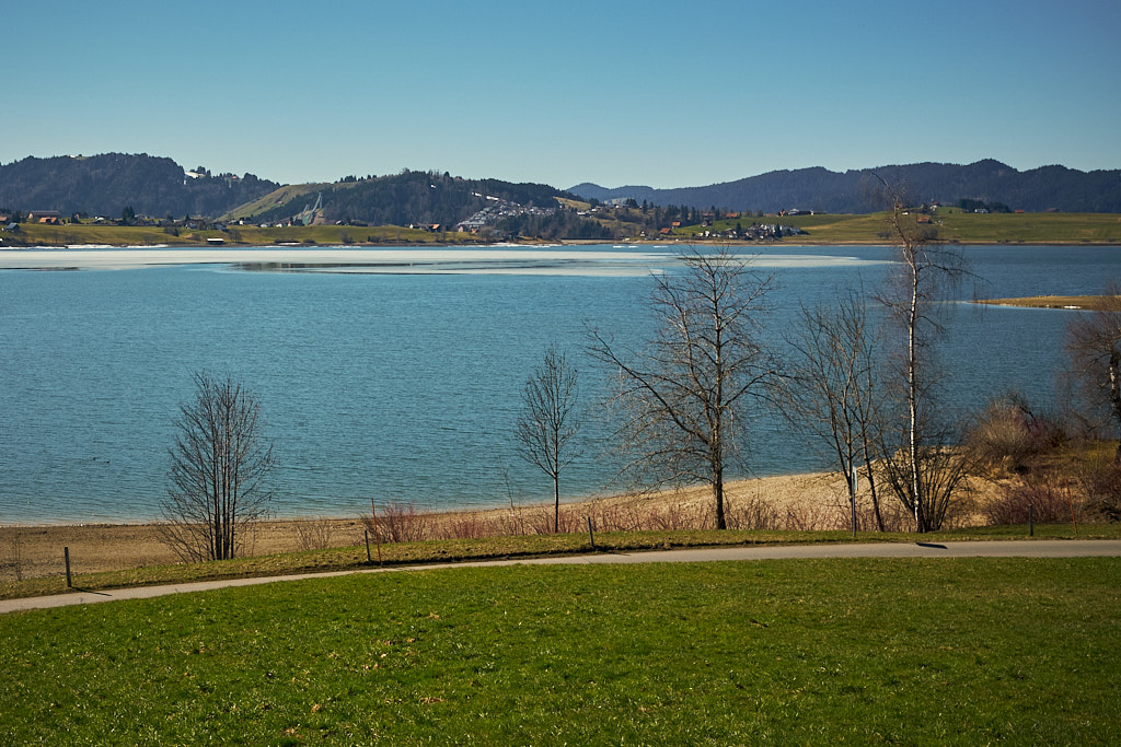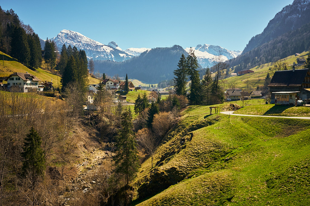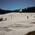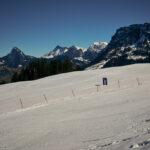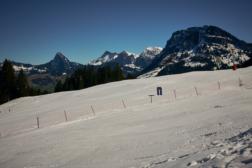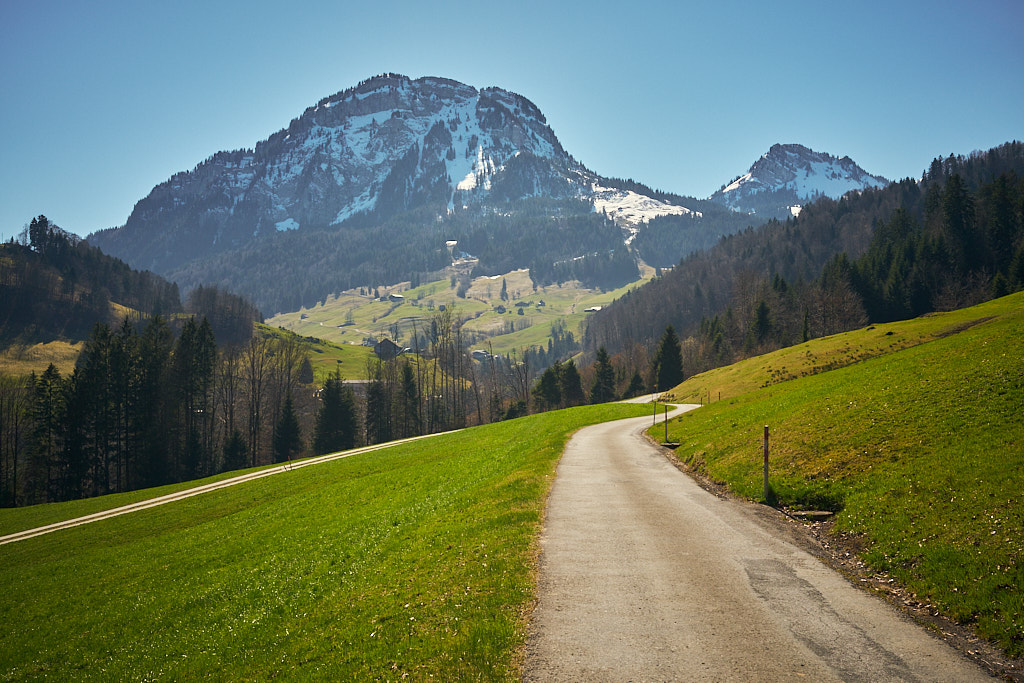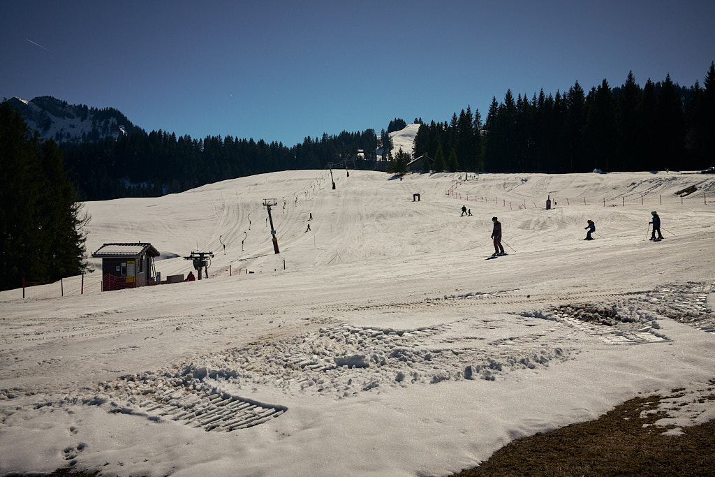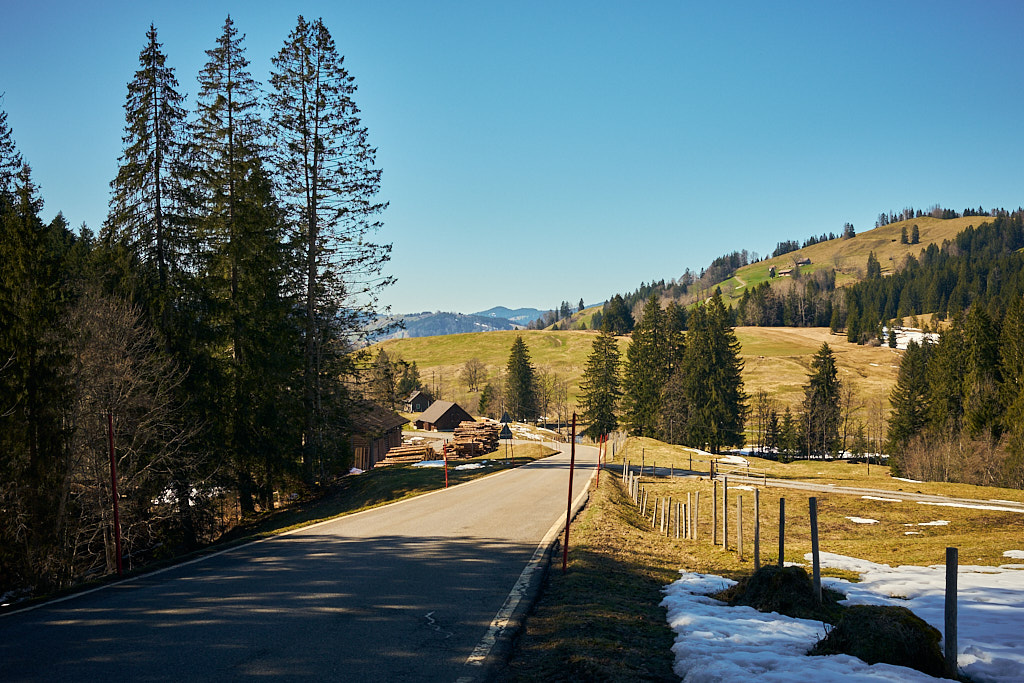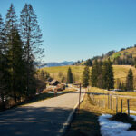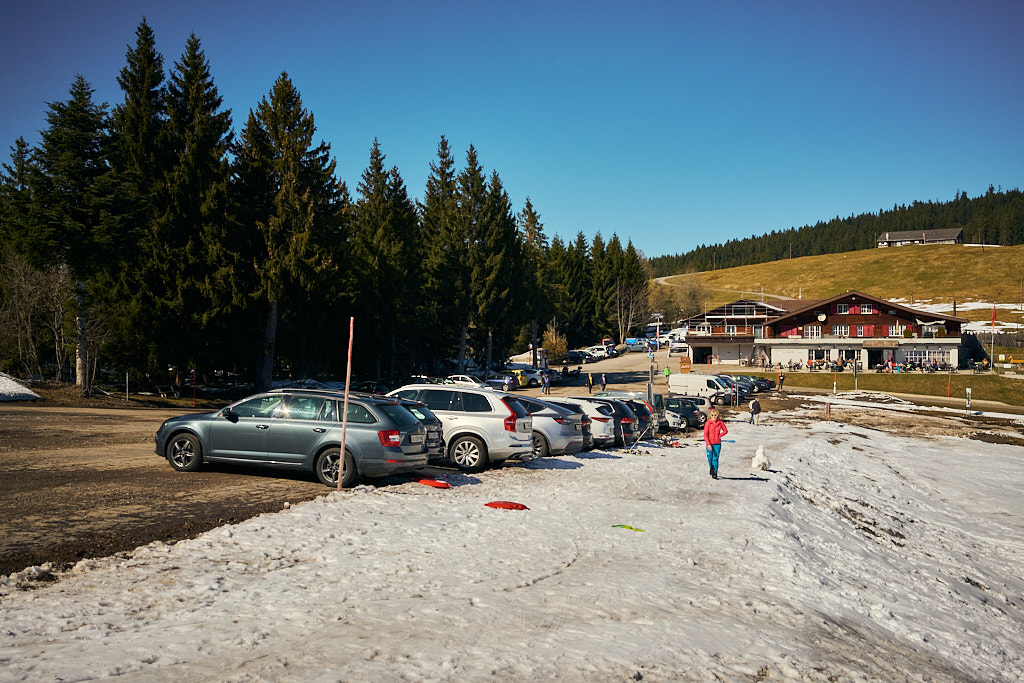 Jetzt folgte ein längerer Aufstieg in vielen Serpentinen auf der Passstrasse zum Sattelegg. An einem Sommerwochenende wäre hier sicher die Hölle los gewesen zwischen Auto- und Motorradfahrern, heute waren hingegen aber nur relativ wenige Exemplare von beiden unterwegs. Stetig gewann ich an Höhe und erreichte nach einigen Kilometern die Passhöhe. Der Kontrast zum Unterland war erheblich: die Hänge waren noch schneebedeckt und ein kleiner Bügelskilift samt Piste war neben der Strasse voll in Betrieb.