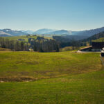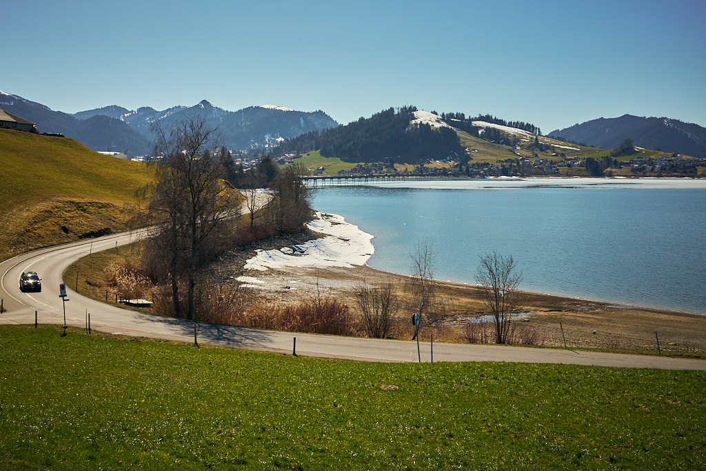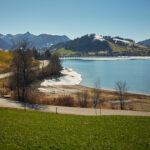 Jenseits vom Sattelegg fuhr ich wieder bergab zum Sihlsee unweit der Schwyzer Kantonshauptstadt Einsiedeln und dem im Süden angrenzenden Skigebiet Hochybrig. Beide Ziele wollte ich mir aber für zukünftige Touren aufheben und fuhr heute stattdessen am östlichen Ufer des Sihlsees entlang nach Egg. Von hier ging es nochmals in einem kurzen, aber heftigen Aufstieg zum unscheinbaren Etzelpass, der die erste Hügelkette der Schwyzer Voralpen zwischen Sihlsee und Zürichsee überwindet.
