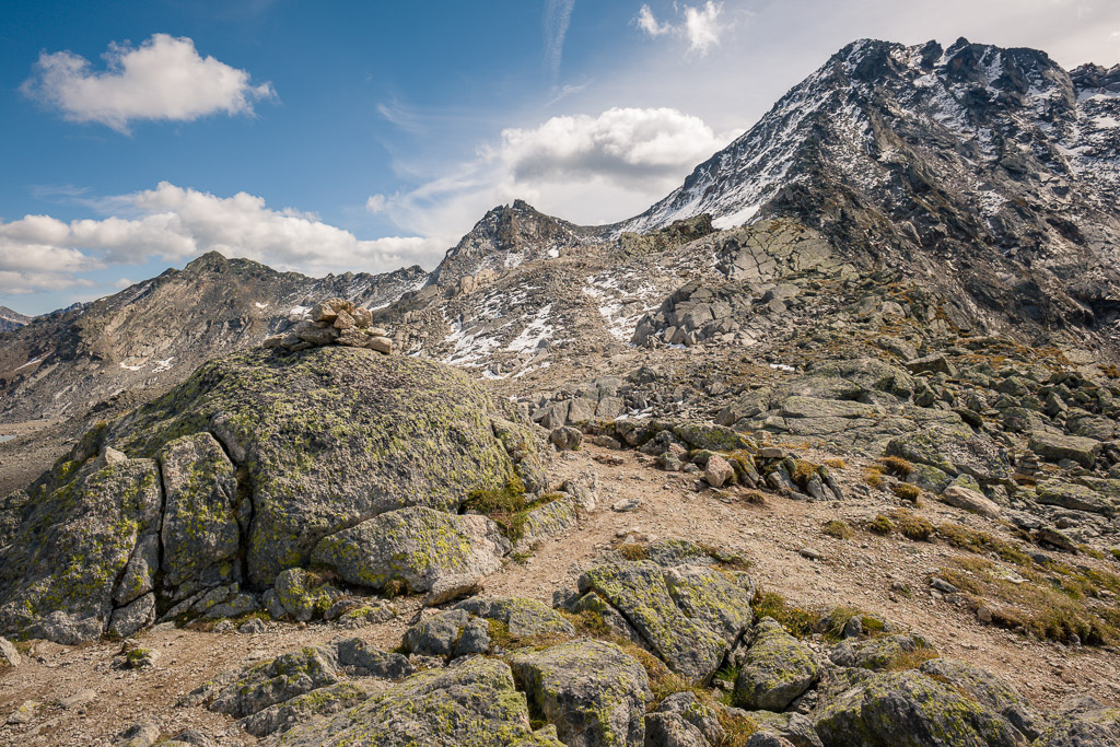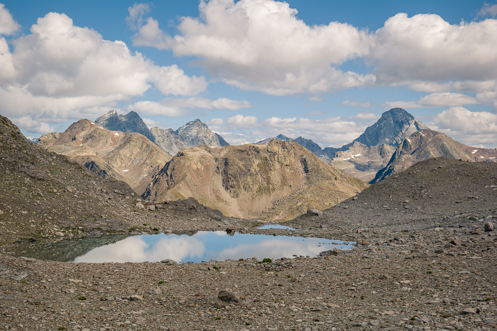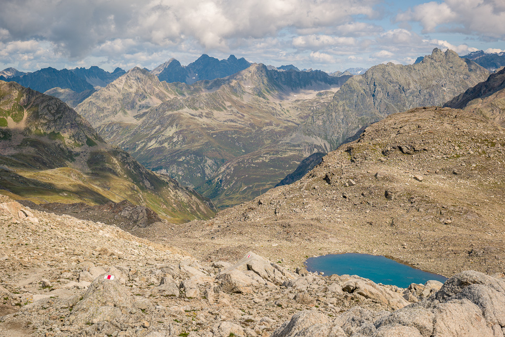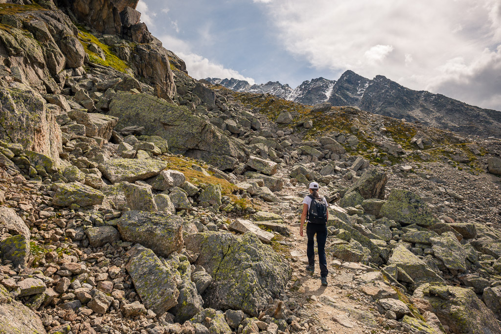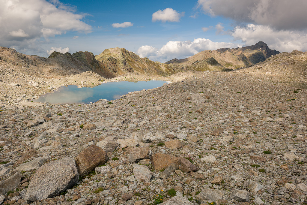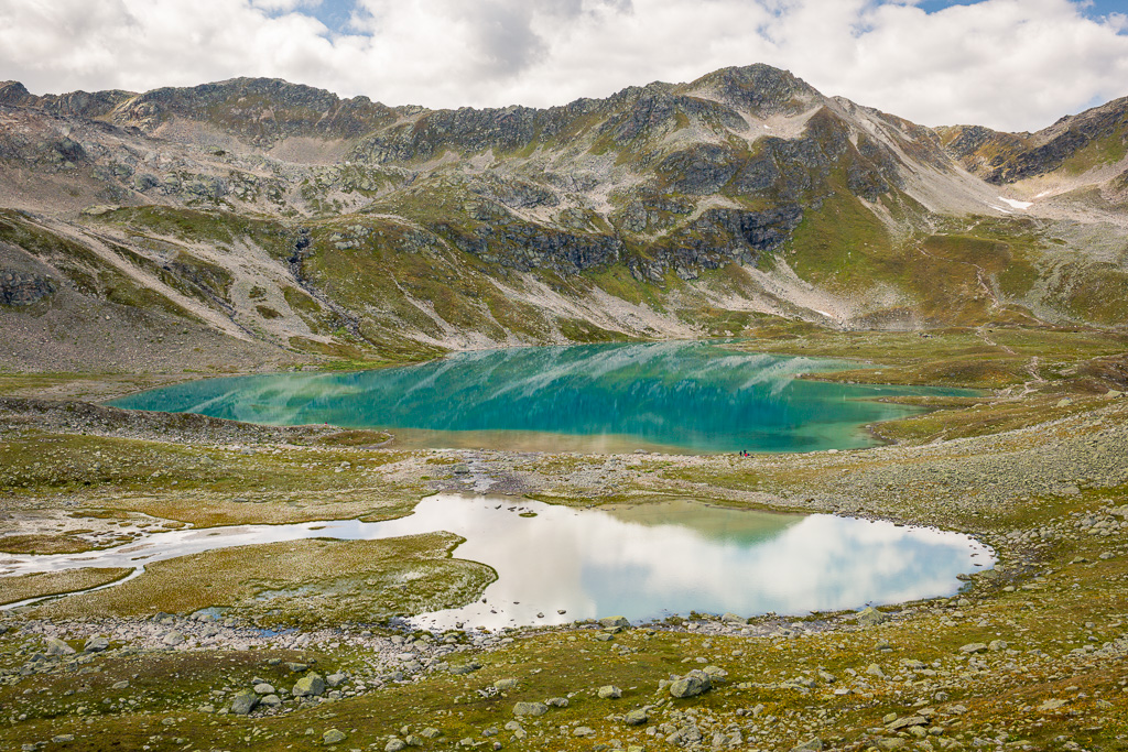 Von der Wägerhütte an der Flüelapassstrasse (Haltestelle des Postautos und Parkplatz) den Wegweisern folgend zur Winterlücke. Es geht zunächst mit mehr oder weniger Hintergrundlärm von der Passstrasse über blockdurchsetzte Grashänge hoch, dann zunehmend ruhiger in den Geröllkessel am Fuss des Flüela Wisshorns mit Blick auf die Überreste eines Felssturzes vor einigen Jahren. Im Schlussanstieg windet sich der Pfad in vielen Kehren durchs Geröll und wir erreichen den Passübergang der Winterlücke mit schönem Blick auf die ersten beiden, höchstgelegenen Jöriseen.