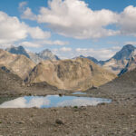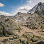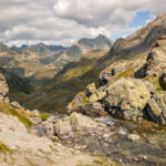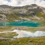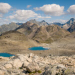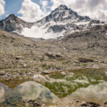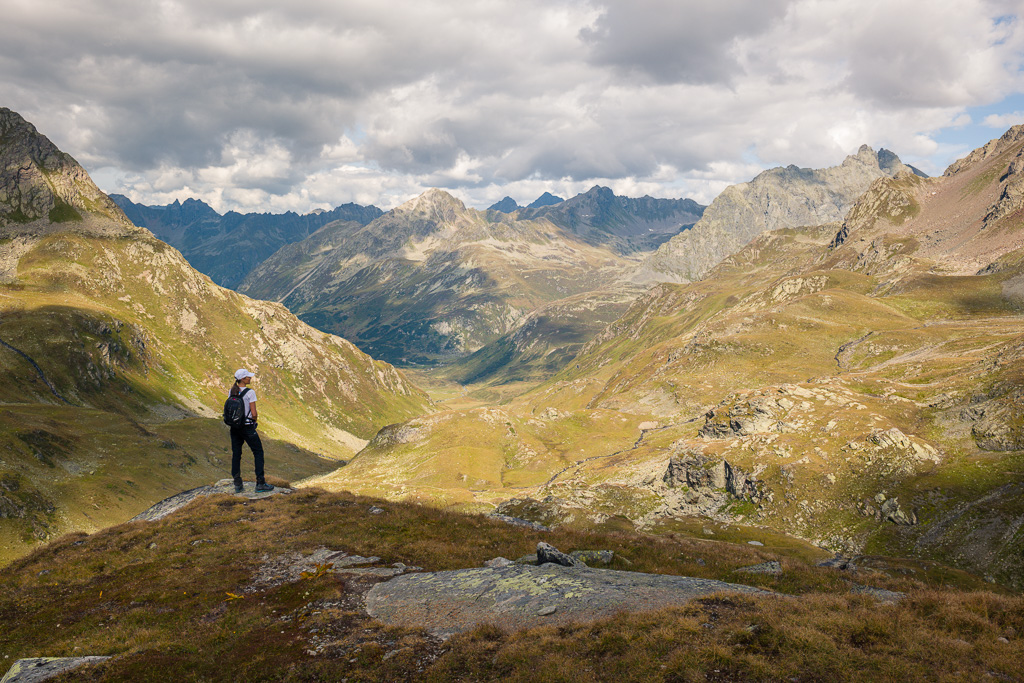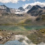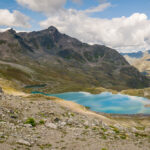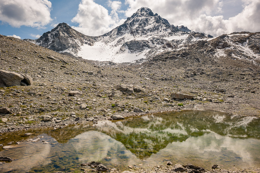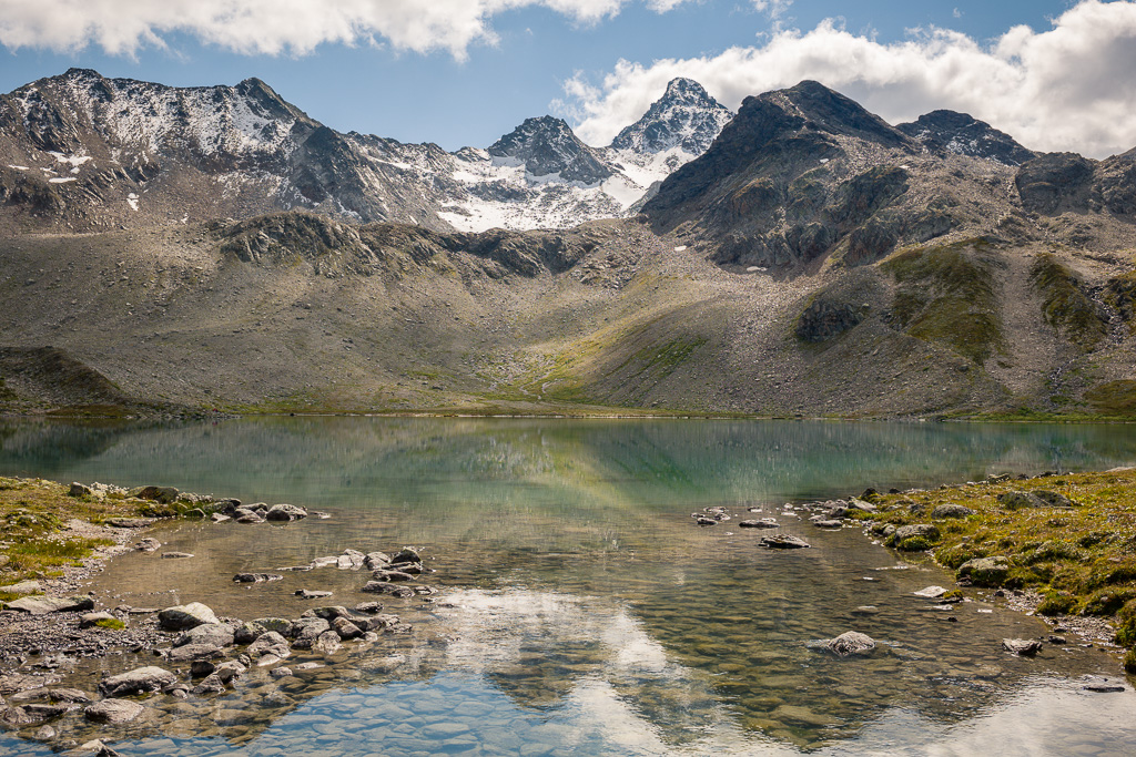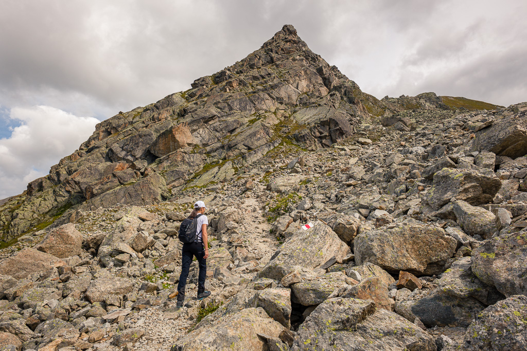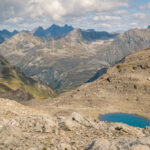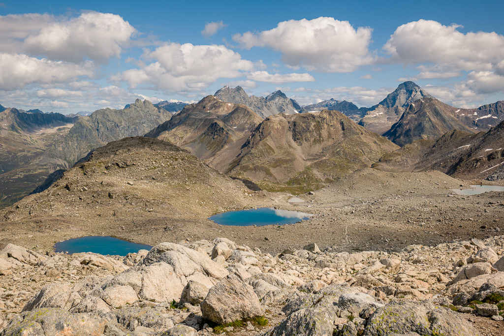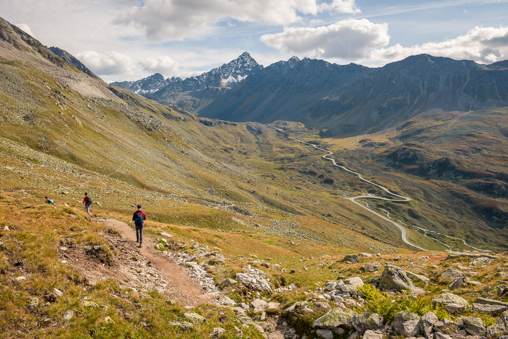 Von der Wägerhütte an der Flüelapassstrasse (Haltestelle des Postautos und Parkplatz) den Wegweisern folgend zur Winterlücke. Es geht zunächst mit mehr oder weniger Hintergrundlärm von der Passstrasse über blockdurchsetzte Grashänge hoch, dann zunehmend ruhiger in den Geröllkessel am Fuss des Flüela Wisshorns mit Blick auf die Überreste eines Felssturzes vor einigen Jahren. Im Schlussanstieg windet sich der Pfad in vielen Kehren durchs Geröll und wir erreichen den Passübergang der Winterlücke mit schönem Blick auf die ersten beiden, höchstgelegenen Jöriseen.