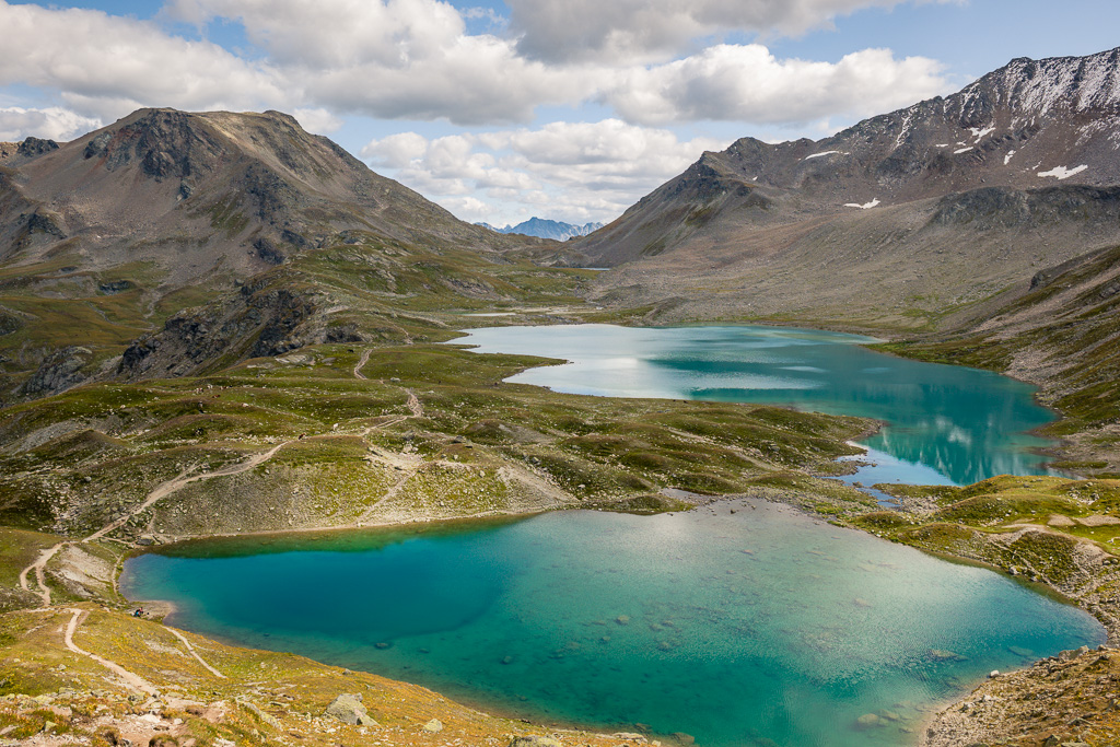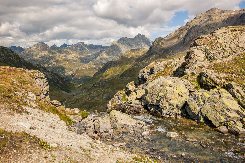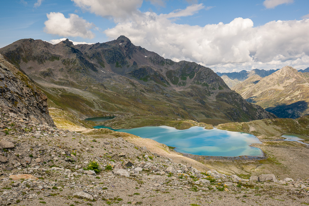 Auf der anderen Seite des Passes nun über weite Geröllhänge und Mulden hinab an den oberen Seen vorbei mit schönem Blick auf Wisshorn und Jörigletscher. An einer Geländekante kommen dann erstmals die unteren Seen und Weideflächen drumherum ins Blickfeld. Nach einem weiteren Abstieg führt der Weg für längere Zeit flach und nördlich an den Seen vorbei. Über den idyllisch plätschernden Abfluss vom grössten See führt ein Metallsteg.