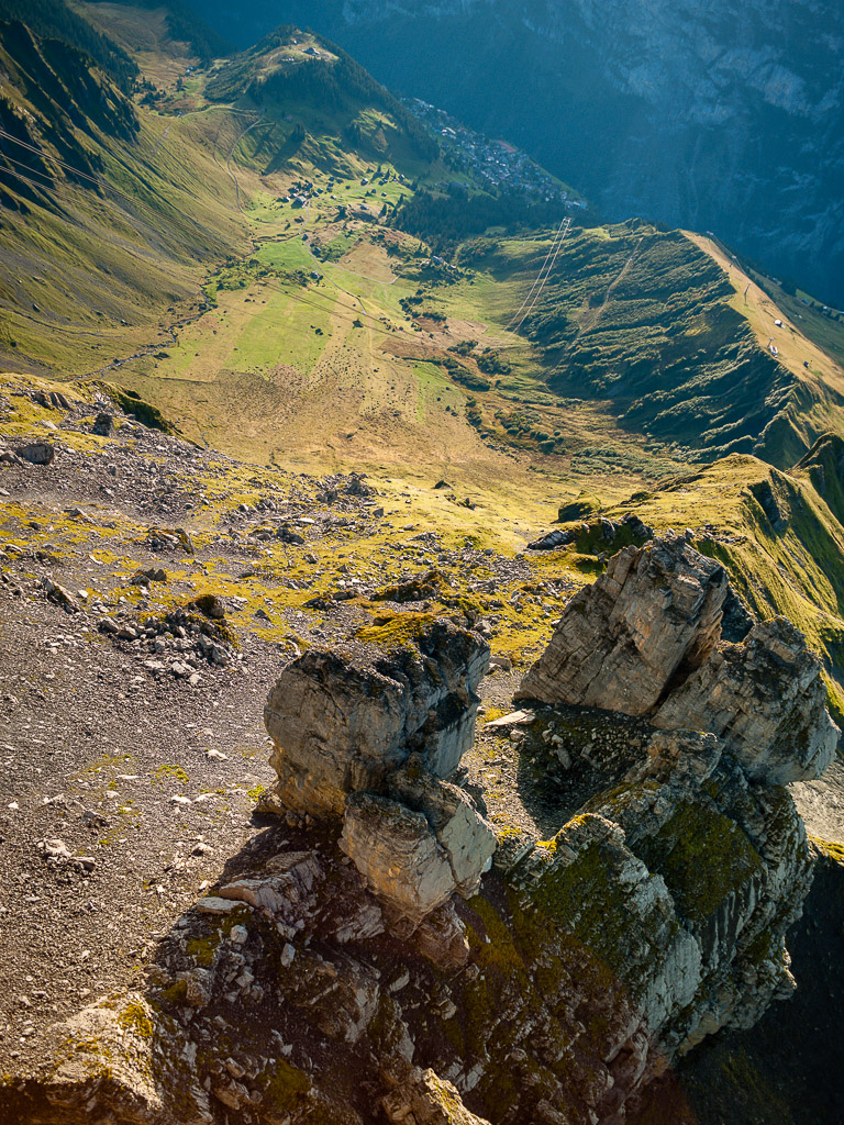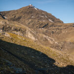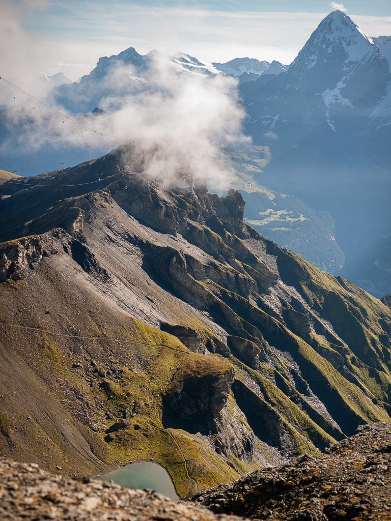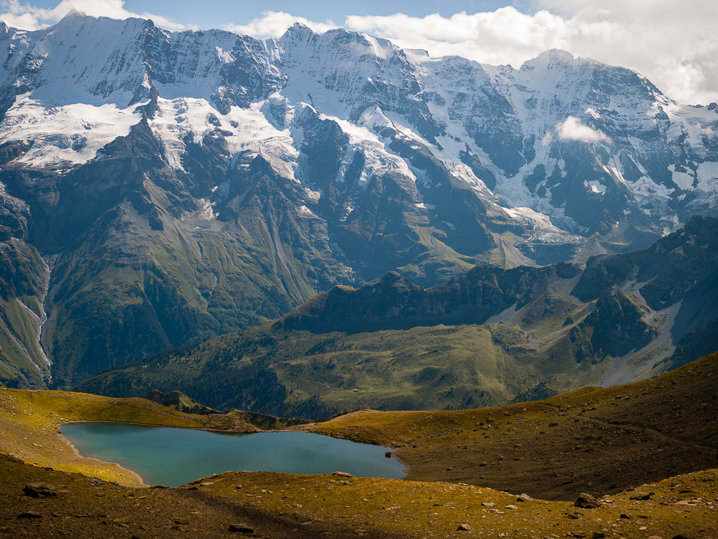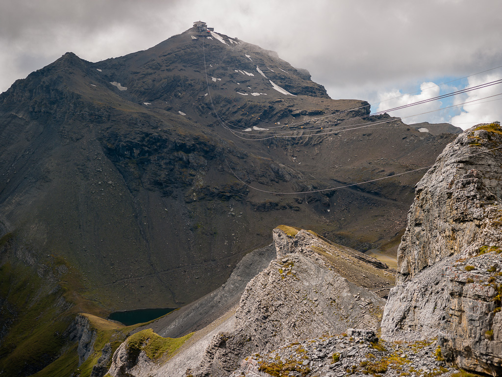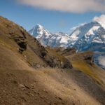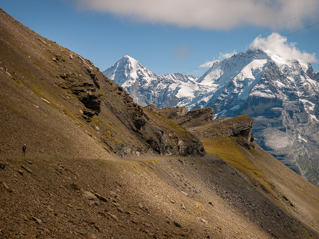 Kurzer Aufstieg von der Mittelstation der Seilbahn auf das Schilthorn durch eine alpine Gerölllandschaft.Im Gegensatz zum Aufstieg aus dem Tal eignet sich diese Variante als relativ gemütliche Halbtagestour.