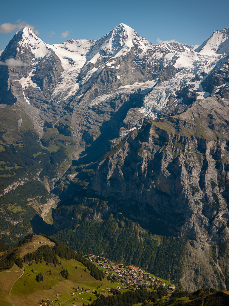 Mit der Schilthornbahn von Stechelberg zur Mittelstation Birg. Abstieg über Wanderwege zum Seewlifura und auf einem langen Ziehweg den Geröllhängen entlang (mit etwas Glück sind Steinböcke zu sehen). Danach steiler, aber schöner Aufstieg über einen Gratrücken zum Kleinen Schilthorn und zuletzt über Treppen zum Gipfelrestaurant «Piz Gloria» auf dem Schilthorn.
