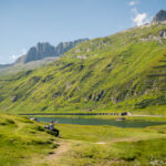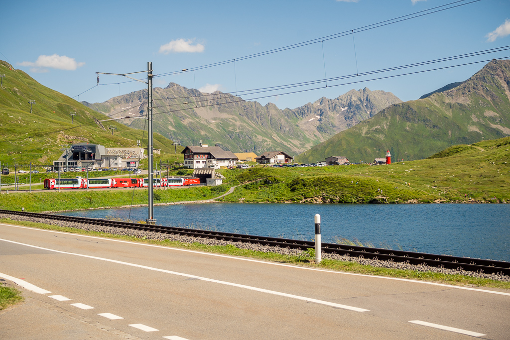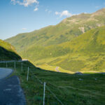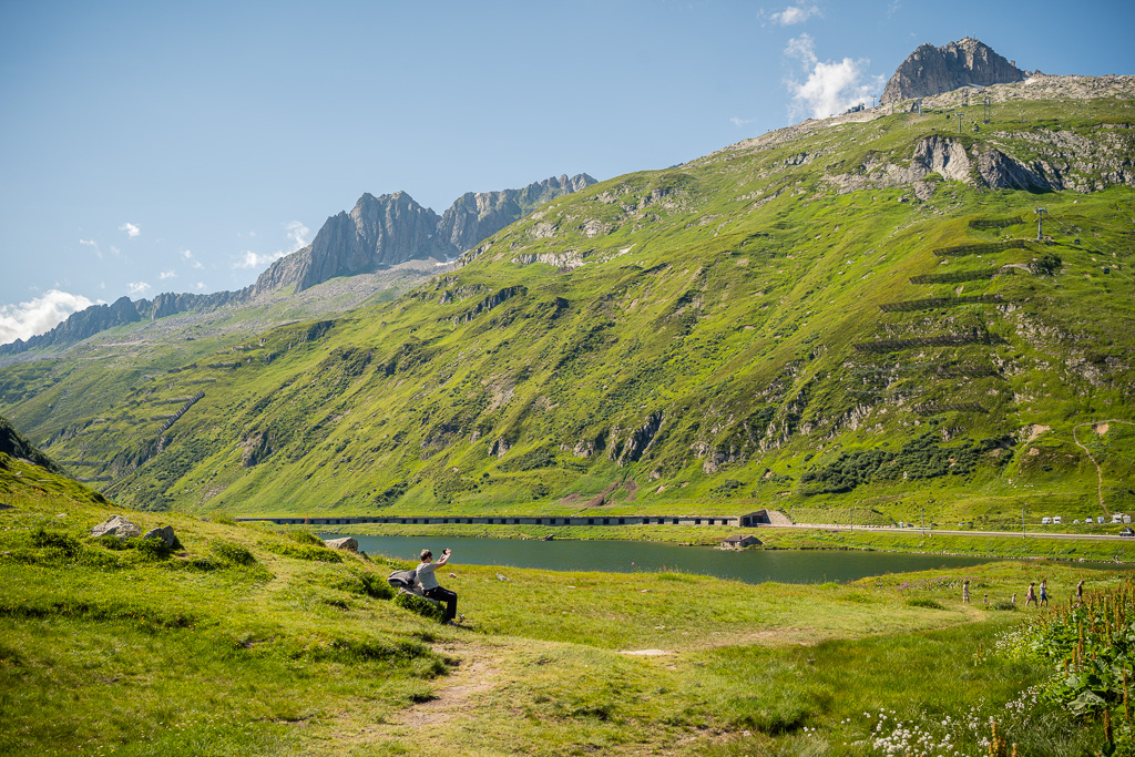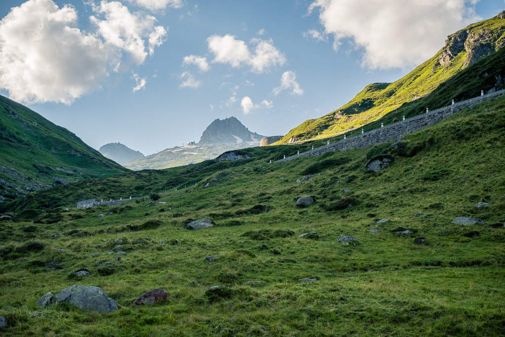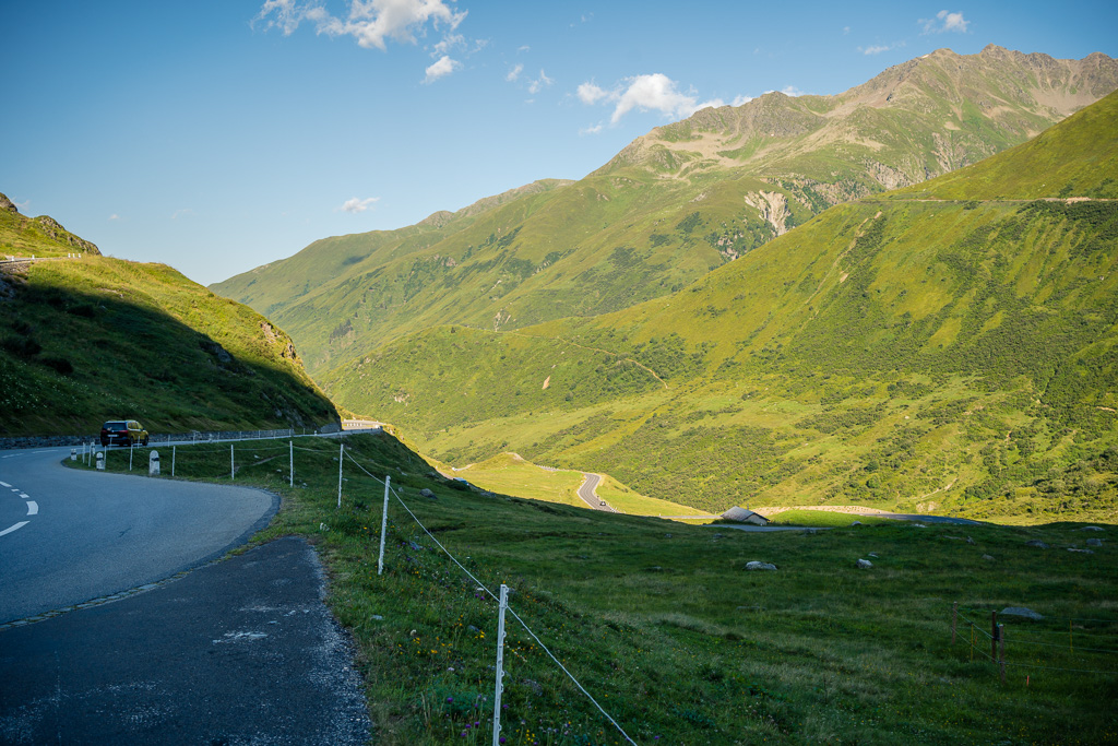 Ich machte mich stattdessen also wieder auf den Weg zum Oberalppass. Zuvor galt es allerdings im Dorf zwischen den flanierenden Touristenmassen noch auf die Schnelle einen Brunnen zu finden, um meinen schon wieder gefährlich leeren Trinkbeutel für den Aufstieg aufzufüllen. Von Andermatt aus war die Passhöhe dank kürzerer Höhen- und Wegdistanz trotz müden Beinen deutlich leichter zu erreichen, und so stand ich nach 18 Uhr bei schon ziemlich tief stehender Sonne und leeren Parkplätzen zum zweiten Mal an diesem Tag auf dem Oberalppass.
