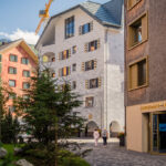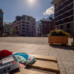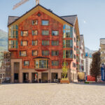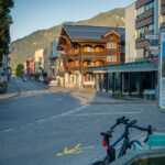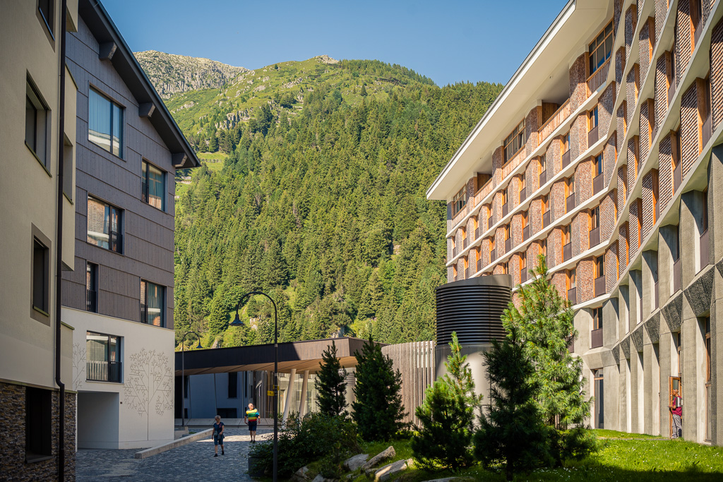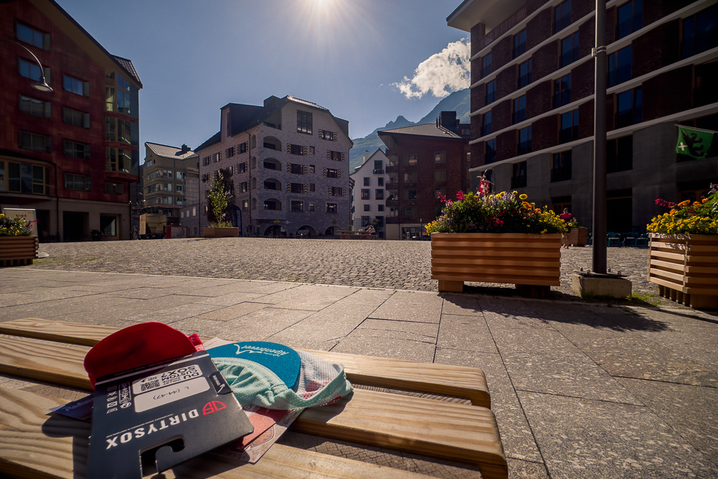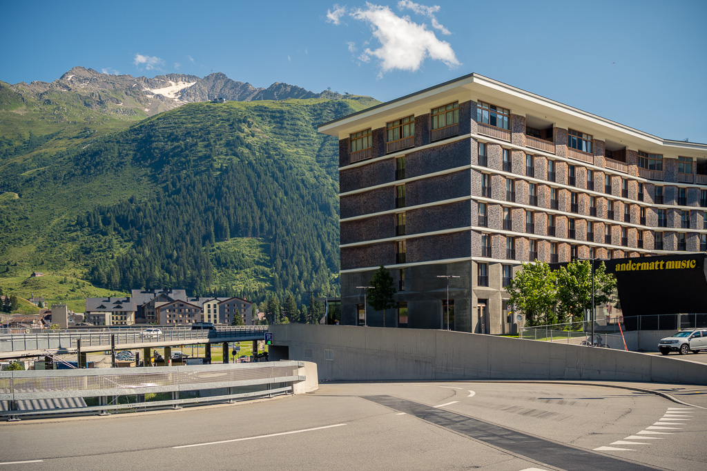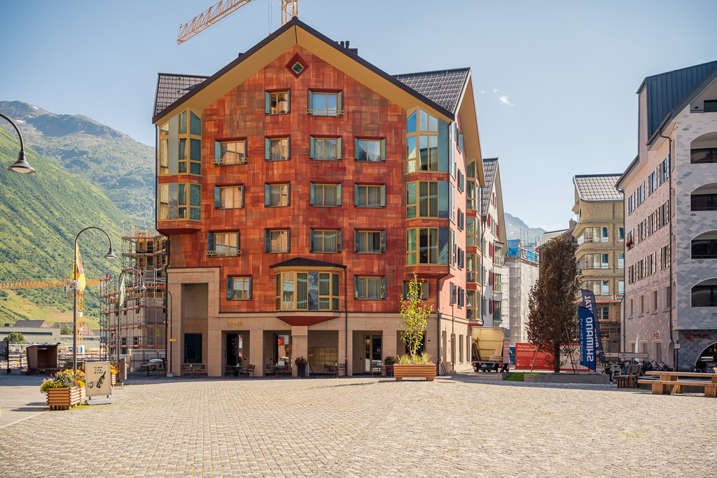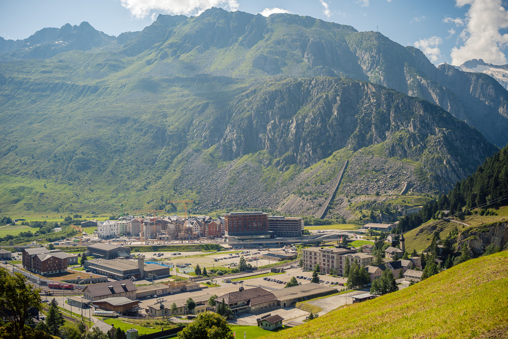 Für meinen Besuch in Andermatt gab es neben der sportlichen Herausforderung heute noch einen handfesten Grund: im Gepäck hatte ich einen Gutschein für ein Paar Rennradsocken und ein Cap dabei, der zwingend vor Ort im Radisson Blu Hotel einzulösen war. Das einstige kleine Bergdorf Andermatt hat sich seit dem Bau der riesigen Hotelanlagen des ägyptischen Investors Sawiri auf dem Areal der ehemaligen Schweizer Militär- und Festungsanlagen enorm gewandelt. Daher war auch die Navigation auf dem letzten Kilometer zum Eingang des Radisson Blu Hotels nicht ganz einfach. Auf vielbefahrenen Kreiseln und Überführungen kam ich zum Rand des Hotelkomplexes, der sich durch Bahngleise und Baustellen vom alten Dorfkern getrennt am Eingang der Schöllenenschlucht erhebt. Durch zugige Schluchten zwischen hoch aufragenden Apartmenthäusern erreichte ich schlussendlich Eingang und Reception des Luxushotels, zeigte den im Rucksack aufgeweichten und halb zerrissenen Gutschein vor, nahm verschwitzt und mit salzverkrusteten Armen meine Souvenirgegenstände entgegen und machte mich flugs wieder auf den Weg nach draussen.