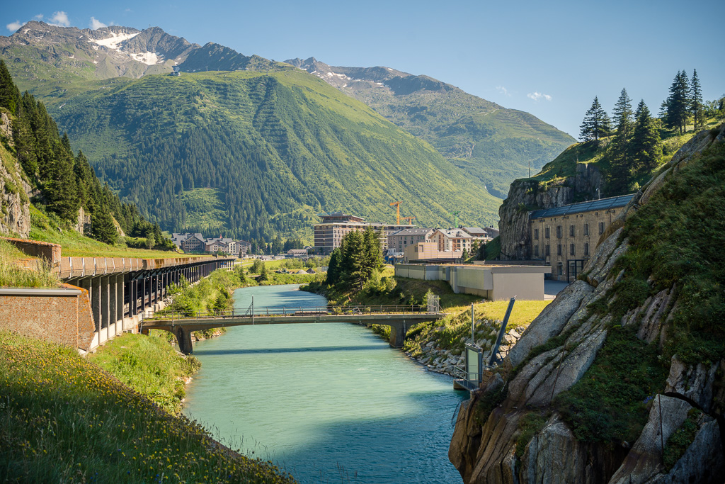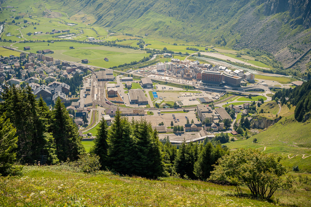 Ich hatte eigentlich vor, noch einen kurzen Abstecher zur Schöllenenschlucht mit der Teufelsbrücke zu machen. Man hatte den Weg dorthin seit meinem letzten Besuch vor 6 Jahren allerdings umgebaut und er führte nun über den Autotunnel, durch Treppenhäuser und sonstige Verwicklungen, auf die ich dann spontan keine Lust mehr hatte. Zudem war es bereits nach 17 Uhr, die Sonne stand schon langsam tief, und in mir kroch erstmals ein ganz subtile Panik beim Gedanken auf, dass ich den langen Weg zurück nach Bonaduz eigentlich auch mit dem Rad fahren und nicht hier übernachten wollte.