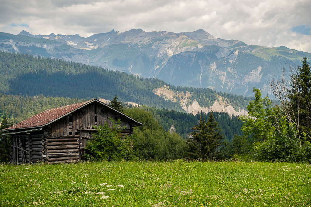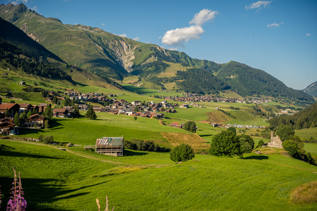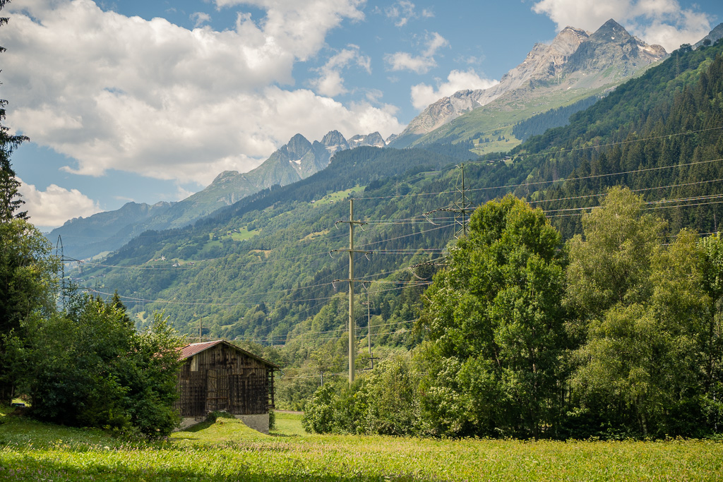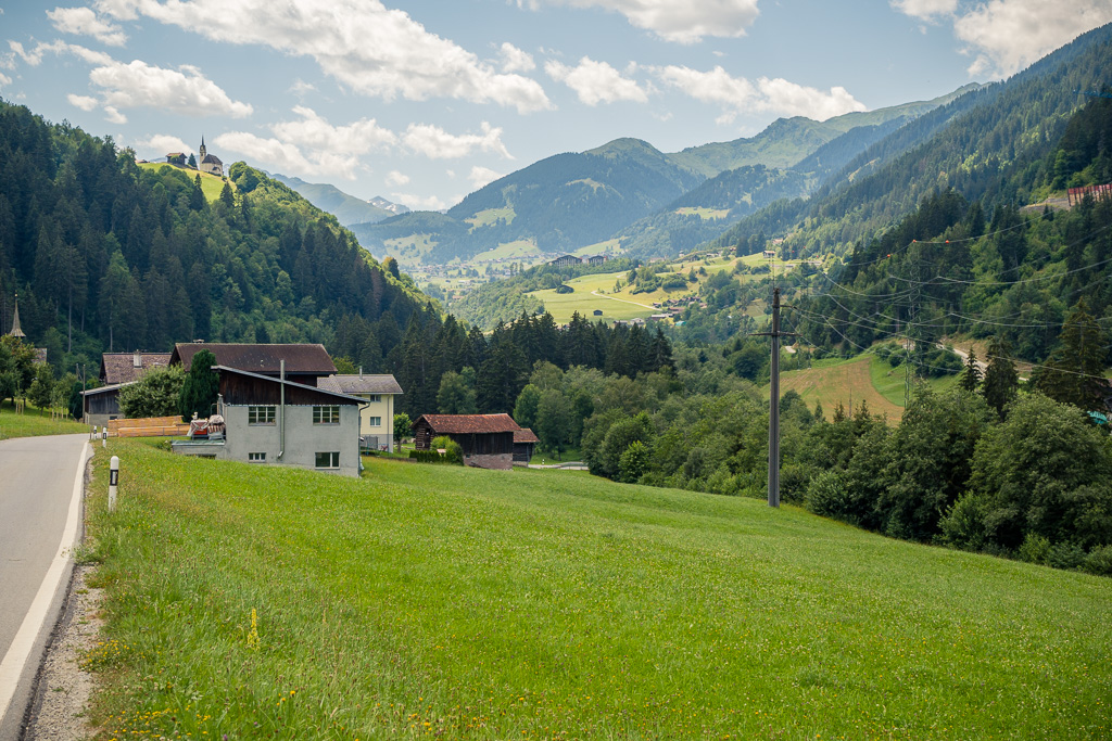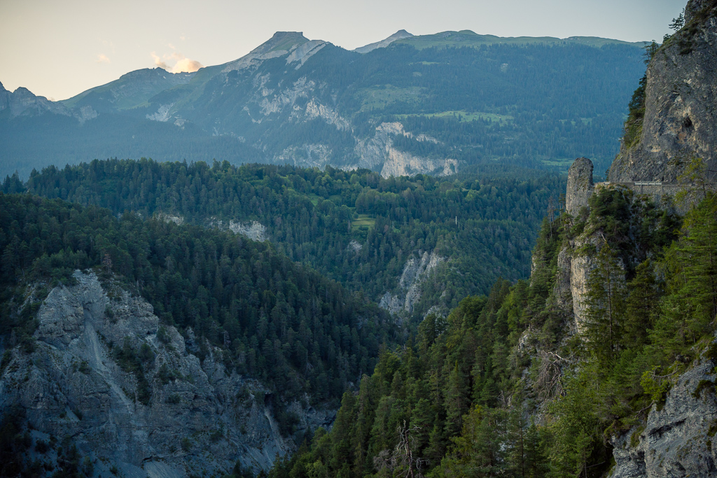 Nach kurzer Kopfrechnung war klar: selbst mit ambitioniertem Tempo würde ich ab jetzt noch mehrere Stunden lang in der beginnenden Abenddämmerung unterwegs sein, und zu grossen Offroad-Abenteuern war ich nach der bisherigen Anstrengung nicht mehr in der Lage (schon auf der zurückliegenden Passhöhe hatte ich die 100 km-Marke überschritten). Eine Rückkehr auf den anstrengenden Schotterwegen vom Hinweg war unter diesen Bedingungen ausgeschlossen. Stattdessen beschloss ich, mich auf der stetig leicht abfallenden Hauptstrasse bis nach Ilanz durchzuschlagen und dort die Situation neu zu beurteilen.