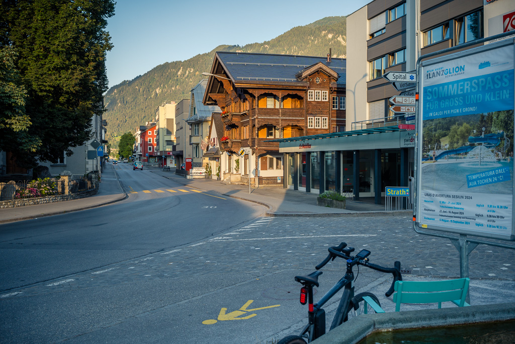 Ich hatte vom Zeitgewinn her grosse Hoffnungen in die Abfahrt gesetzt (die inzwischen schon grösstenteils im Schatten lag). Sie zog sich allerdings trotz zügiger Fahrt gefühlt erstaunlich lange dahin. Als ich endlich in Disentis ankam, waren man auf der Strasse schon unterwegs zum Abendessen. Ich musste hingegen mit nun zunehmender Panik feststellen, dass mir noch über 40 km allein nur bis nach Ilanz bevorstehen würden, von den restlichen rund 24 km zurück zum Auto nach Bonaduz ganz zu schweigen.