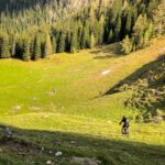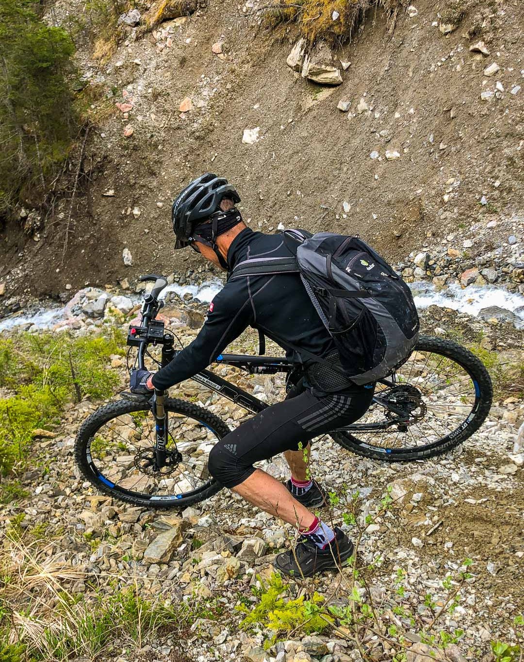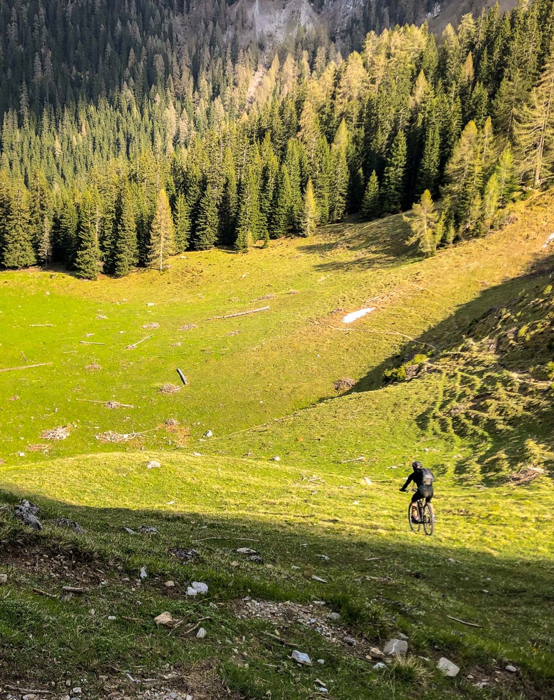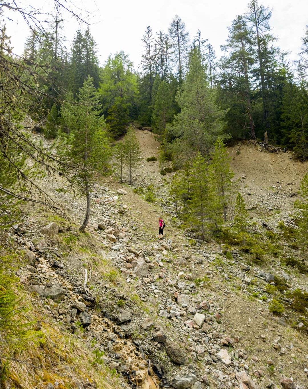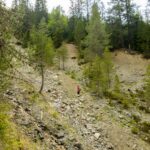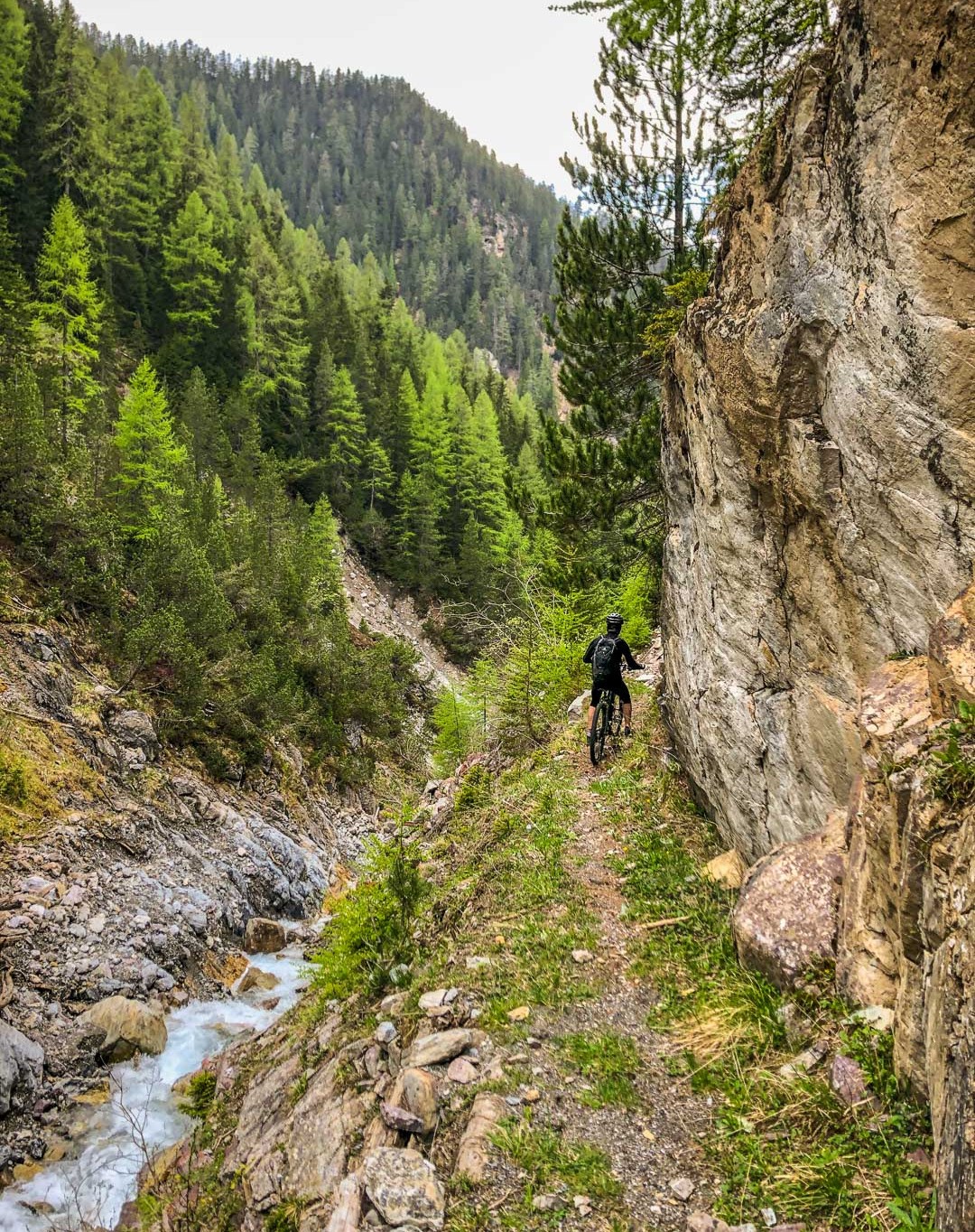 Aufstieg mit dem Mountainbike von Surava zur Alp Ozur und hinüber zur Alp Era. Von dort aufregende Bikeabfahrt ins Schaftobel bei Filisur. Der Weg war nach dem Winter noch ziemlich in Mitleidenschaft gezogen.