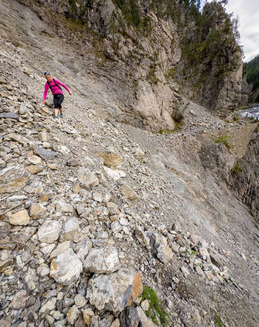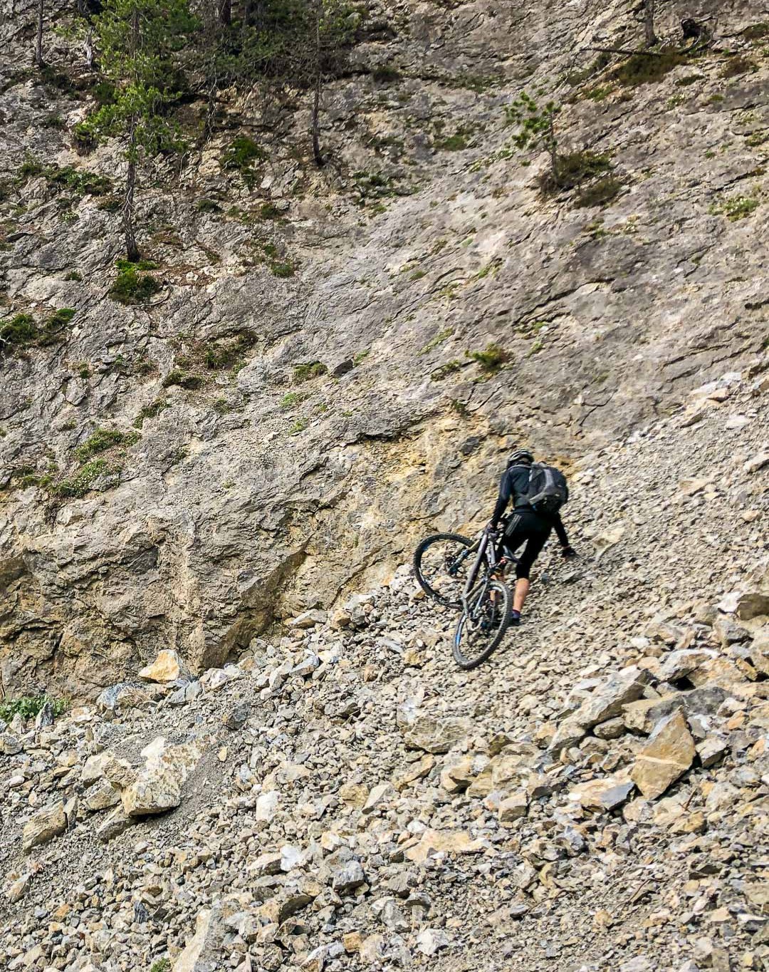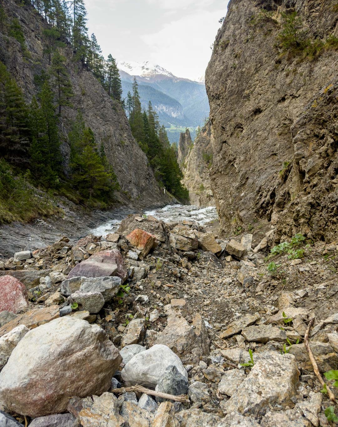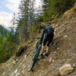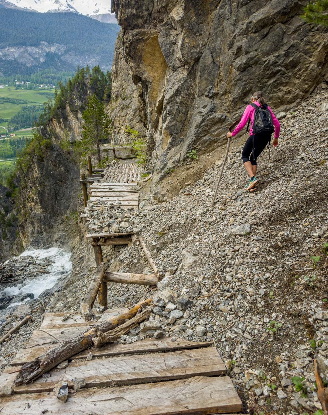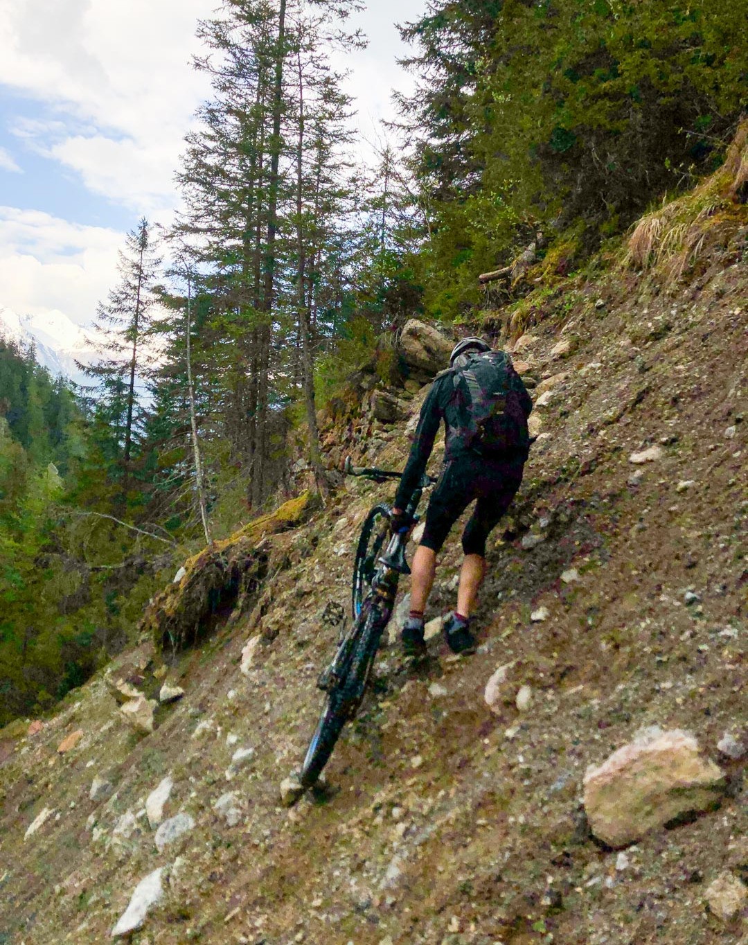 Aufstieg mit dem Mountainbike von Surava zur Alp Ozur und hinüber zur Alp Era. Von dort aufregende Bikeabfahrt ins Schaftobel bei Filisur. Der Weg war nach dem Winter noch ziemlich in Mitleidenschaft gezogen.