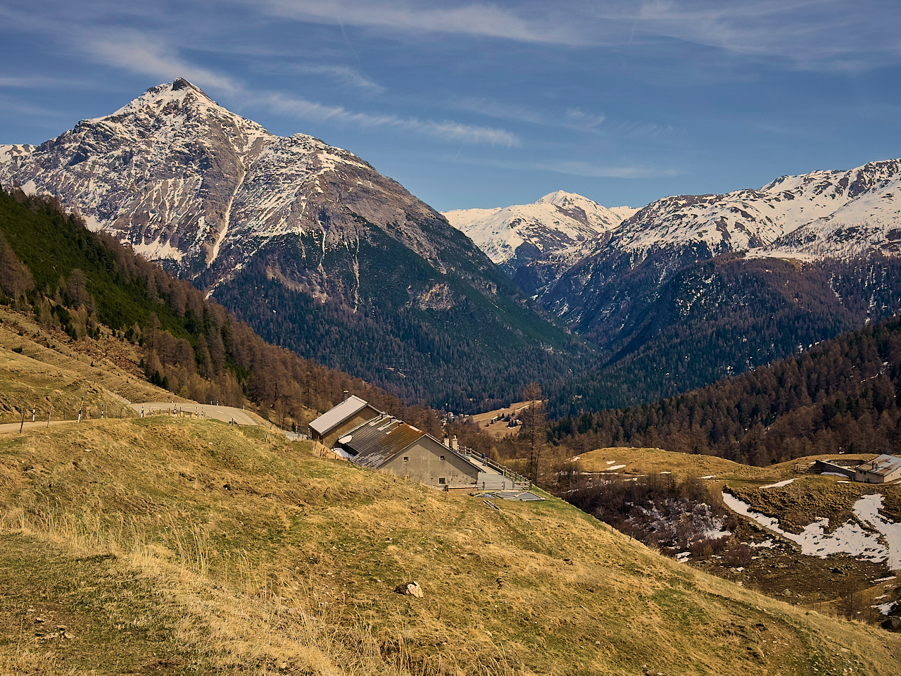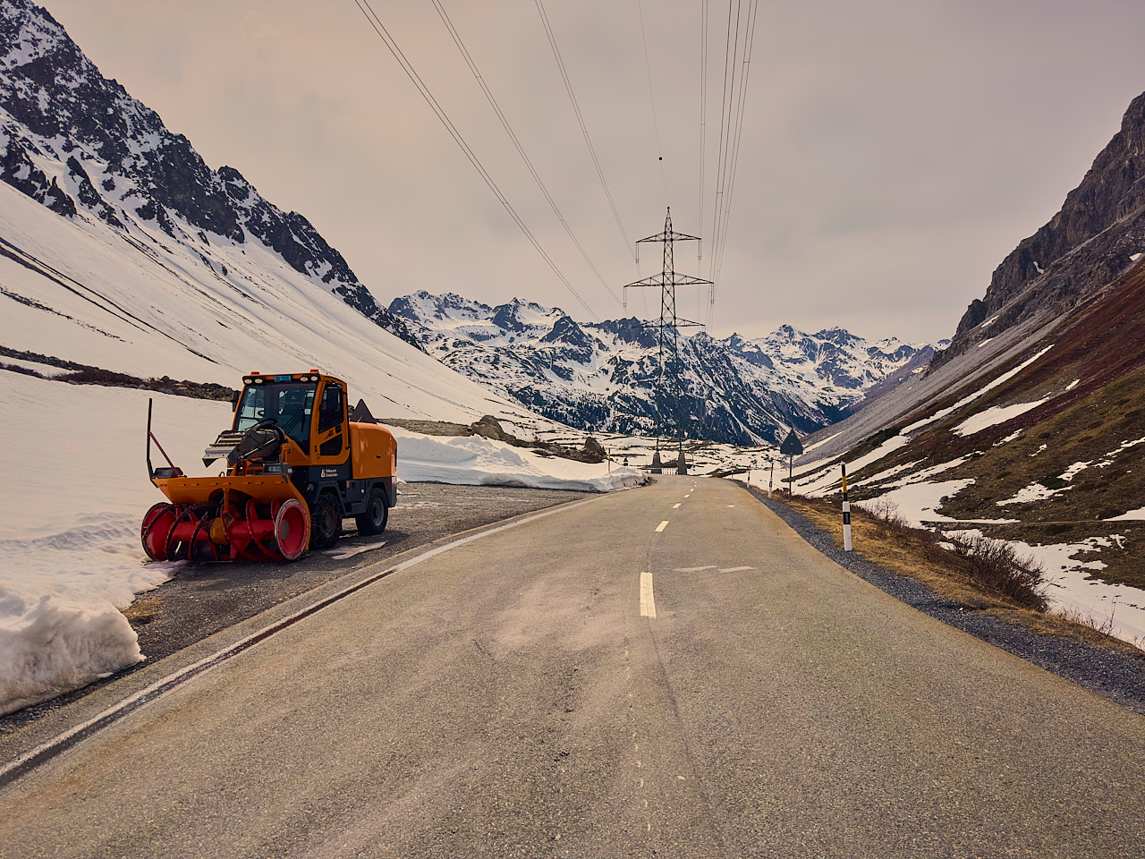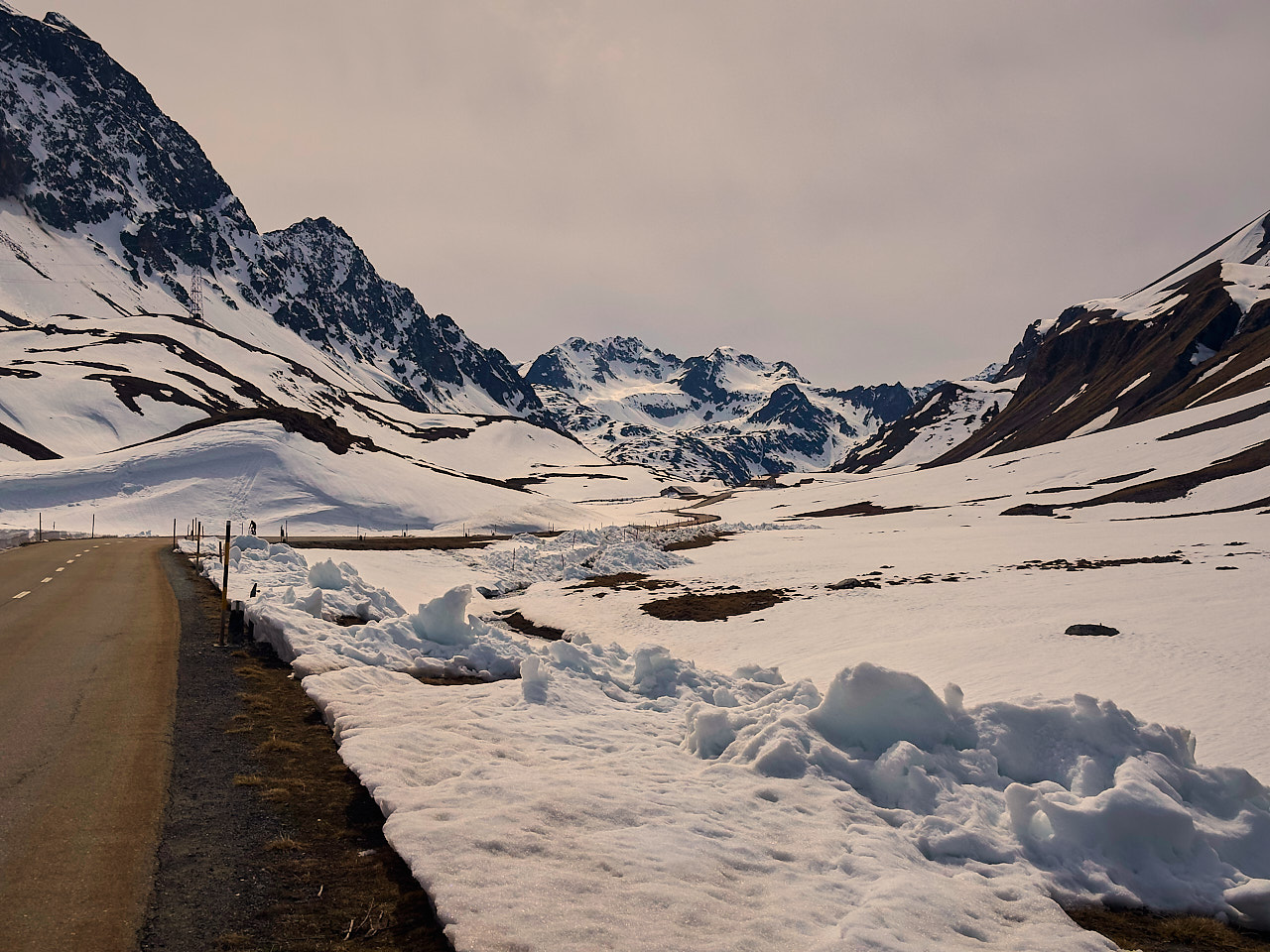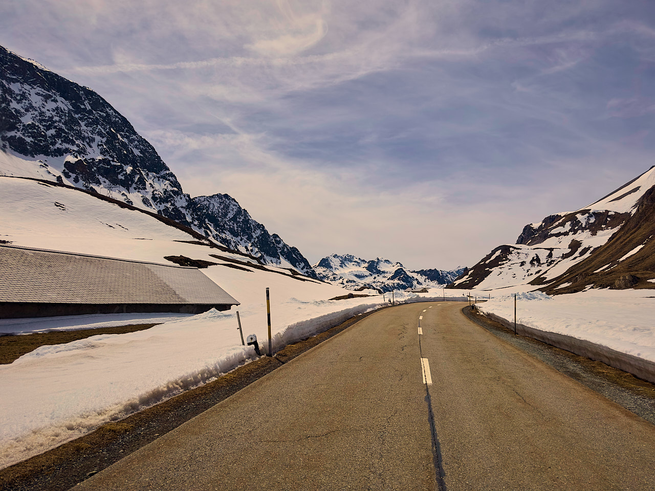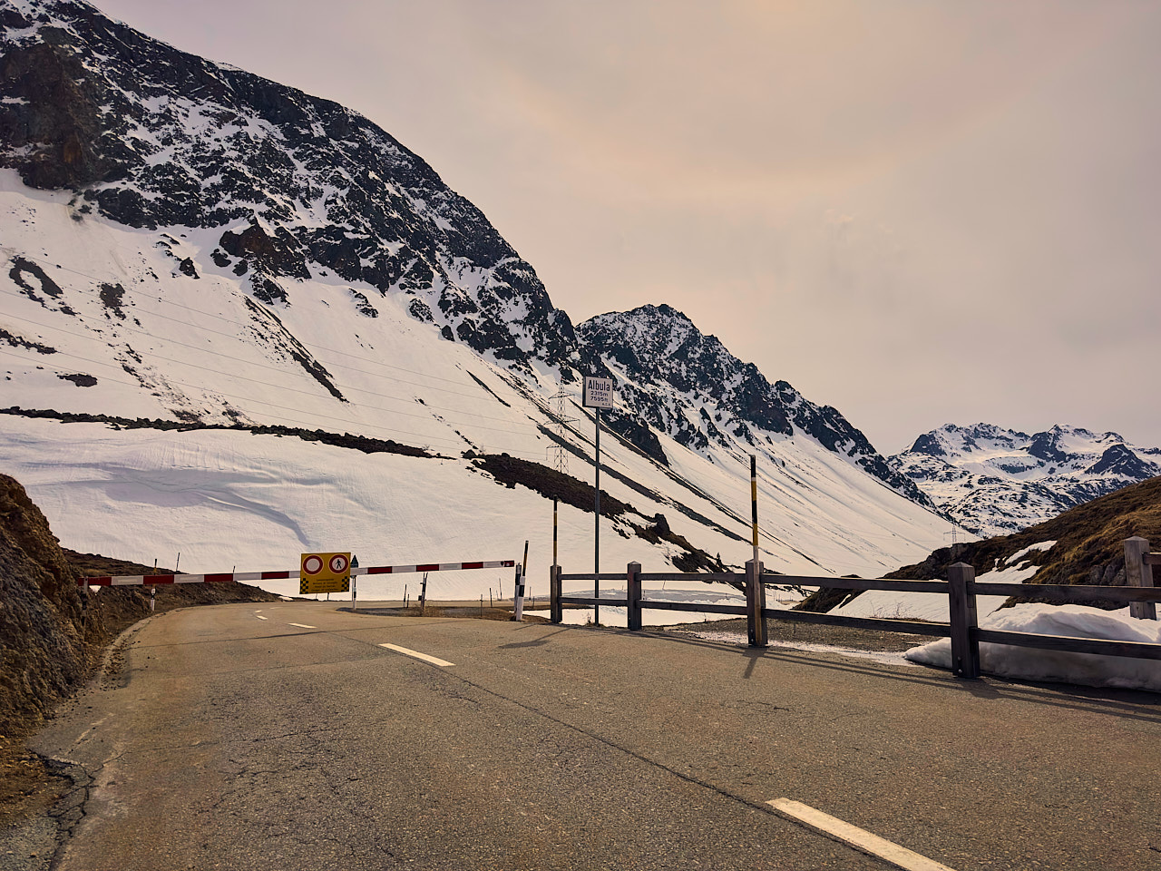 Dort sah die Strasse hinter der zweiten Schranke immer noch schneefrei aus. Ich fuhr weiter bis zum Hof bei Crap Alv. Von dort aus schlängelte sich die Strasse nun in zunehmend alpinem Gelände und unter steilen Schneehängen zur Passhöhe hoch. Hinter der dritten und letzten Absperrung war die Gefahr von Nassschneerutschen an diesem sonnigen Nachmittag wie schon in den Vorjahren ein reelles Thema. Die Strasse war ab hier aber weiterhin schon geräumt worden und ich rechnete damit, die Gefahrenzonen bis zur Passhöhe zügig durchfahren zu können. Vor einigen Jahren bedeckten noch mehrere Lawinenkegel die Strasse in diesem Bereich; heute war davon aber nichts (mehr) zu sehen.