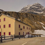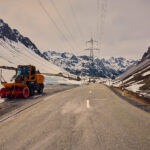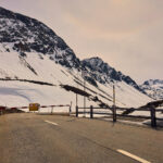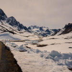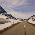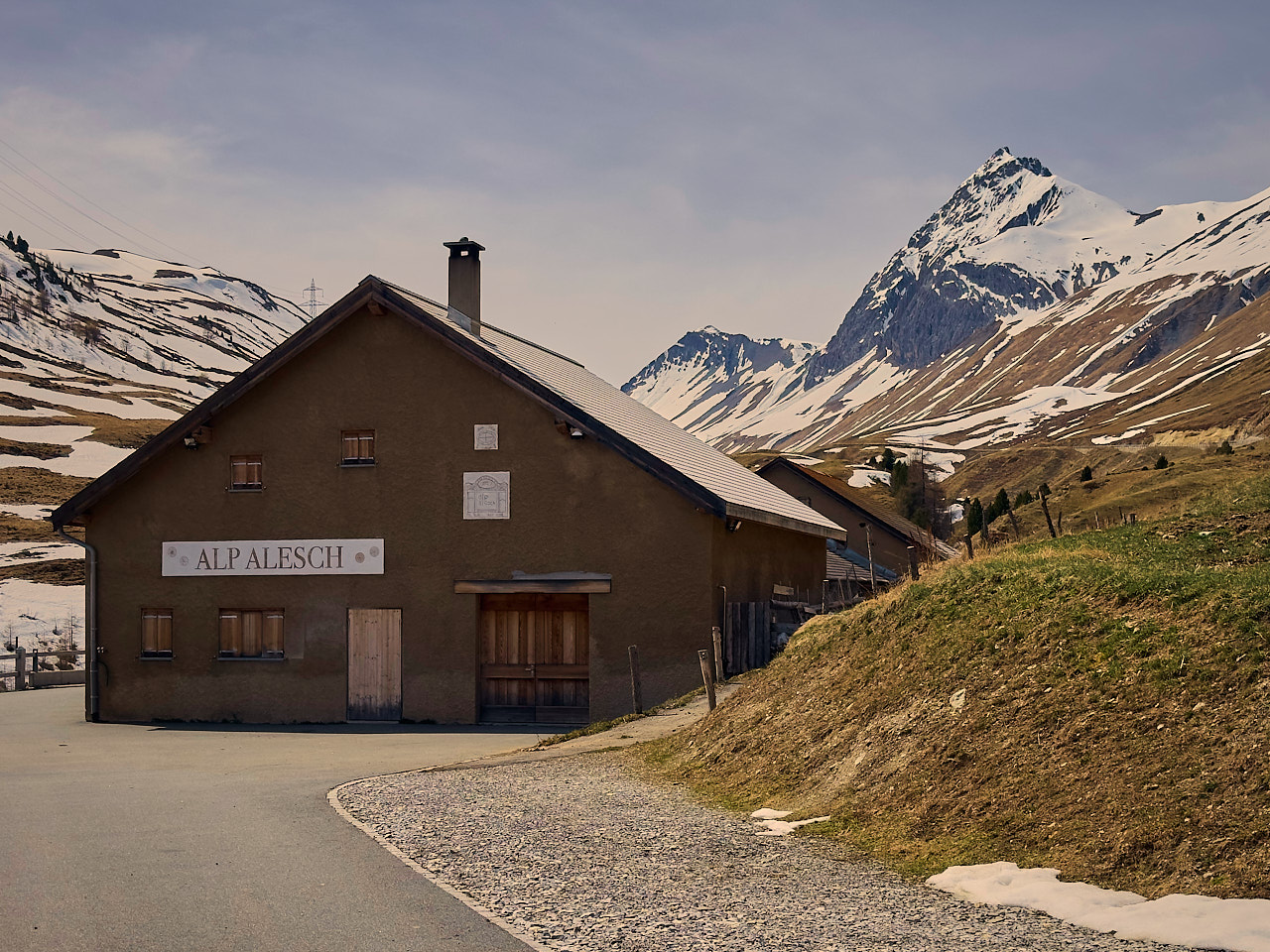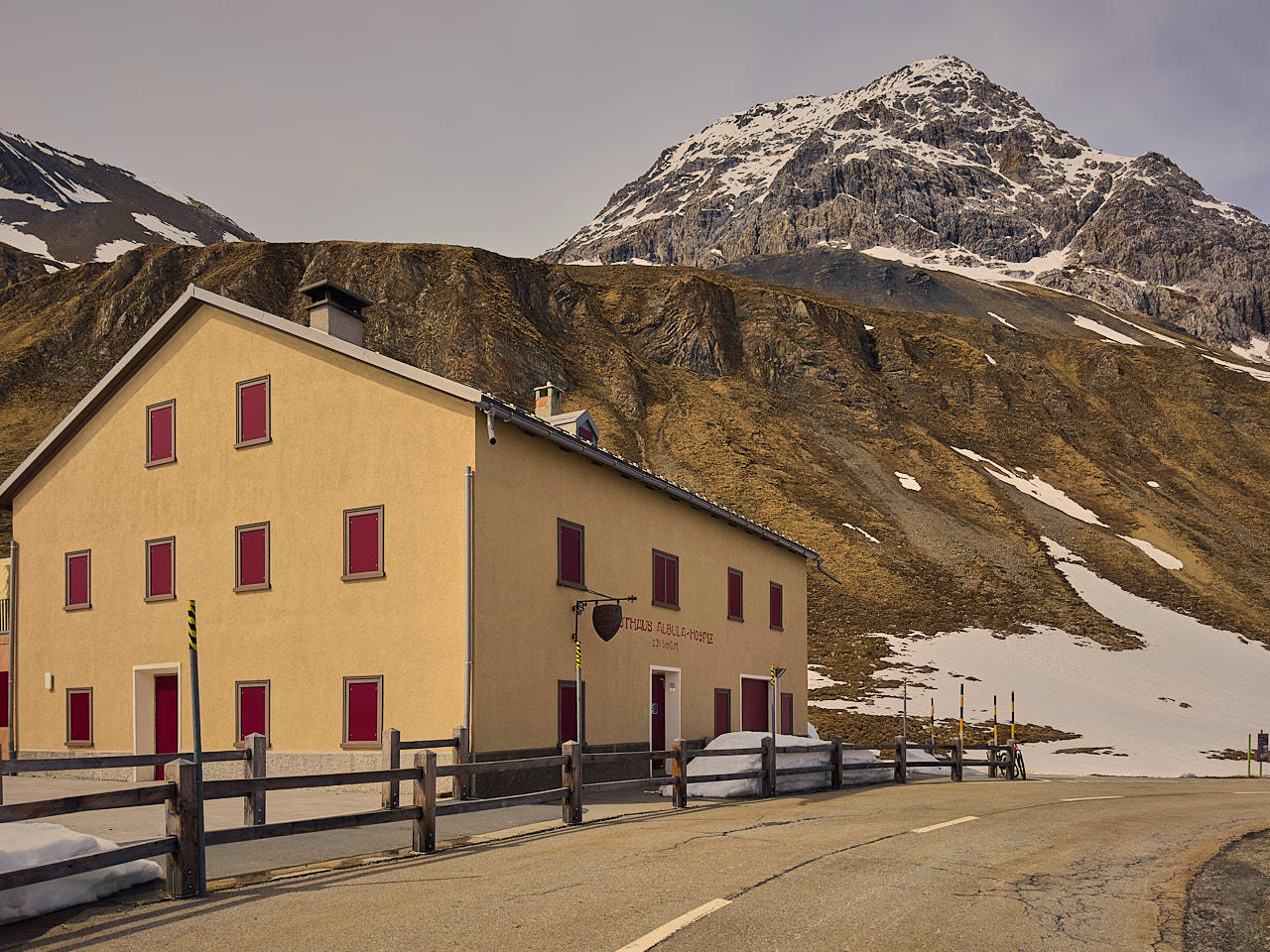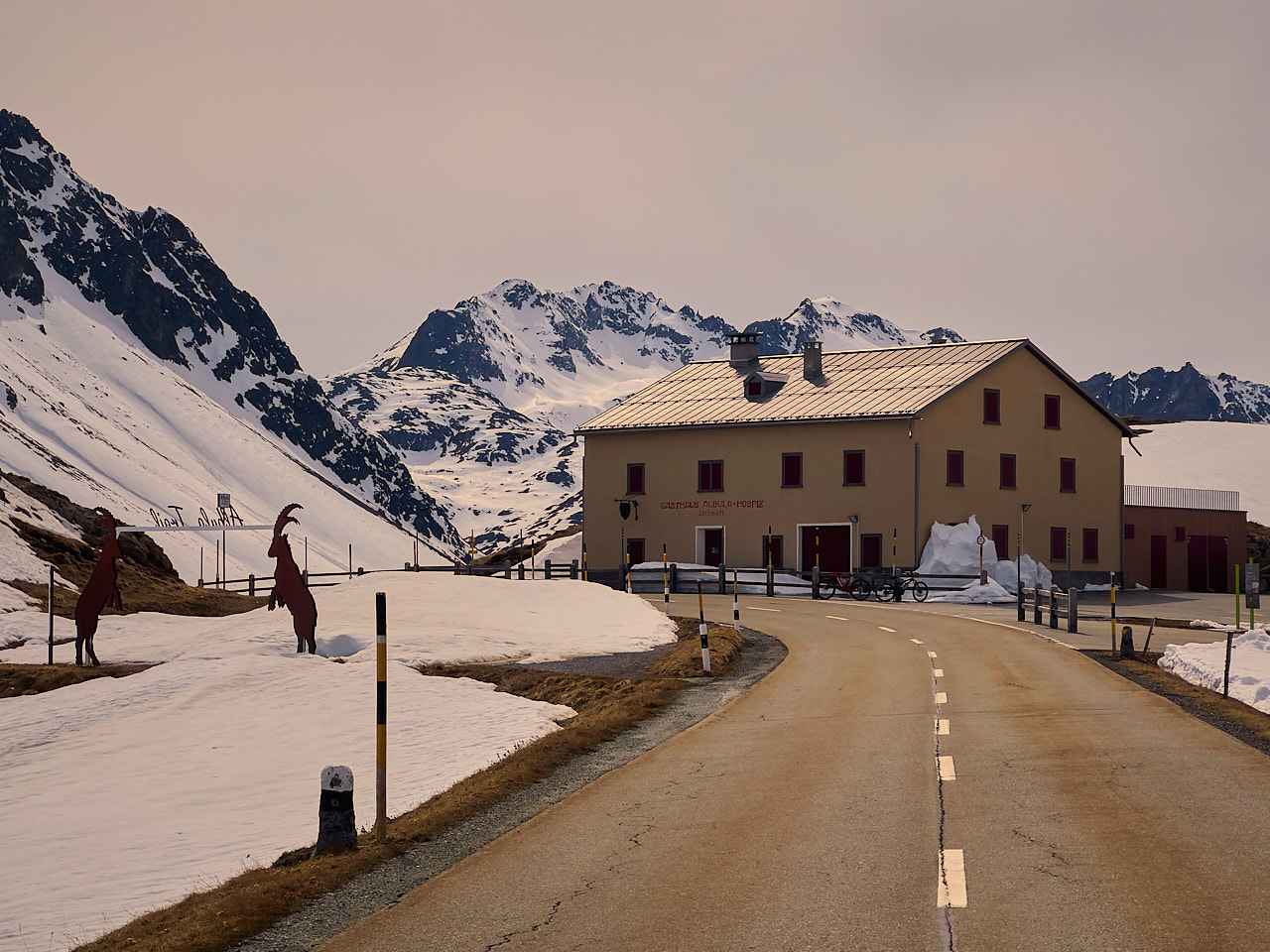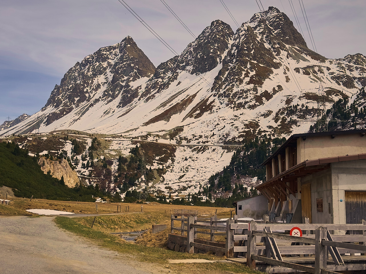 Dort sah die Strasse hinter der zweiten Schranke immer noch schneefrei aus. Ich fuhr weiter bis zum Hof bei Crap Alv. Von dort aus schlängelte sich die Strasse nun in zunehmend alpinem Gelände und unter steilen Schneehängen zur Passhöhe hoch. Hinter der dritten und letzten Absperrung war die Gefahr von Nassschneerutschen an diesem sonnigen Nachmittag wie schon in den Vorjahren ein reelles Thema. Die Strasse war ab hier aber weiterhin schon geräumt worden und ich rechnete damit, die Gefahrenzonen bis zur Passhöhe zügig durchfahren zu können. Vor einigen Jahren bedeckten noch mehrere Lawinenkegel die Strasse in diesem Bereich; heute war davon aber nichts (mehr) zu sehen.