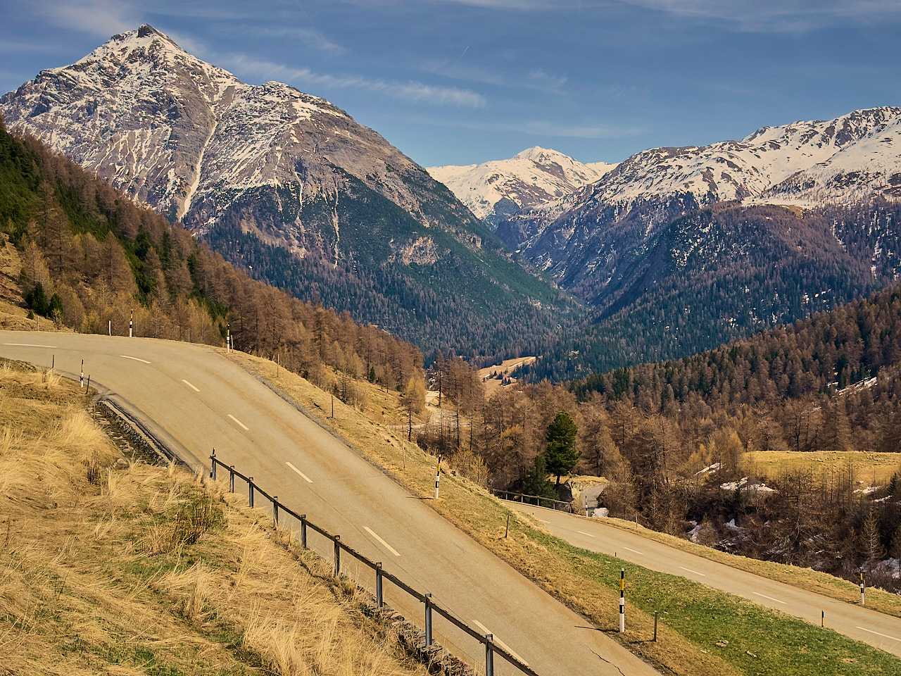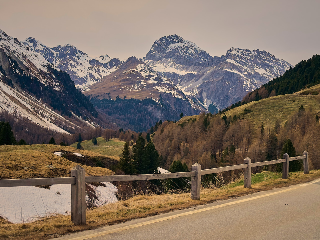 Ich kam auf der Passhöhe an und blickte auf die verlockende endlos lange Abfahrt nach La Punt im Engadin. Dies war zwar etwas unvernünftig, da ich irgendwie wieder zurückkommen musste, keine Lust auf Mitreisende im Zug hatte und deshalb klar war, dass die ganze Strecke von La Punt zum Pass zurück wieder hochgekurbelt werden müsste. Mit der langen Abfahrt vor Augen fühlte sich das alles im Moment aber nicht sehr anstrengend an, und schon war ich zügig bergab unterwegs nach La Punt.