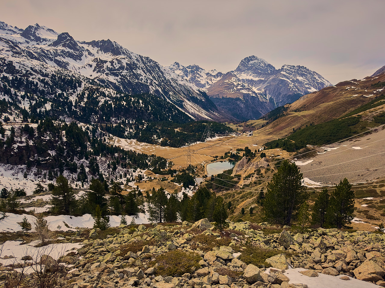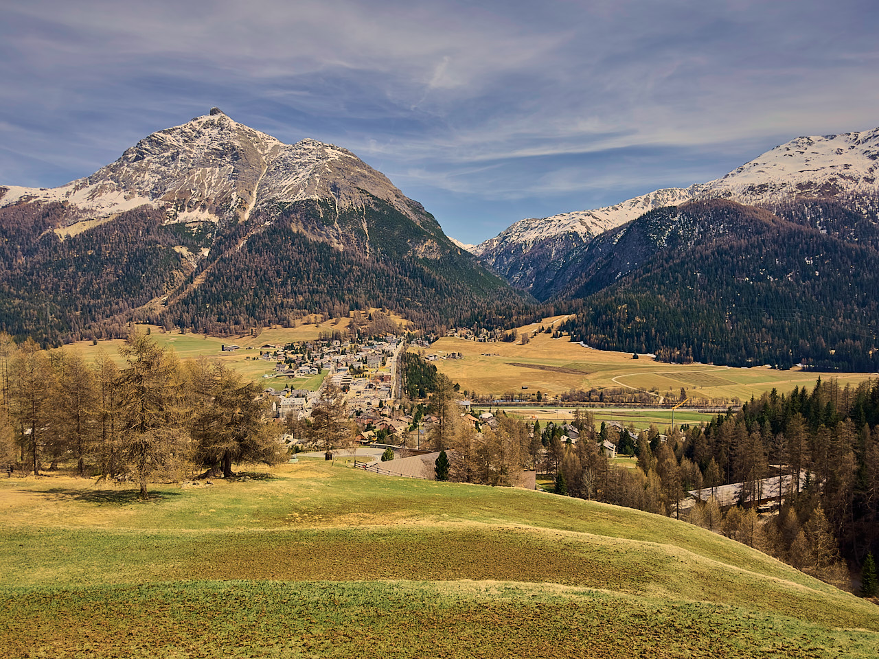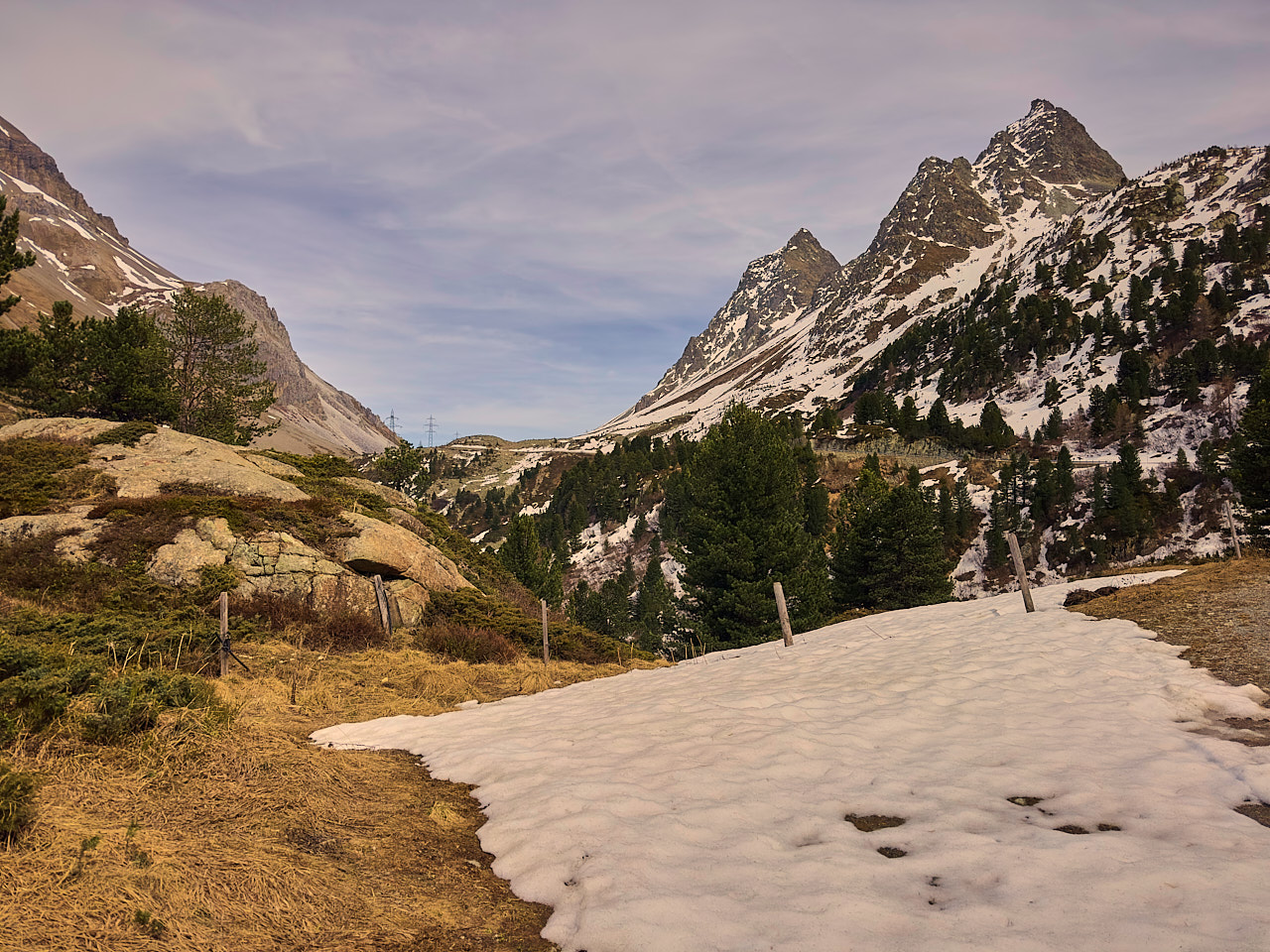 An der Alp Alesch vorbei ging es Kurve um Kurve tiefer hinunter. Viele Murmeltiere suchten unterwegs panisch das Weite, als ich vorbeibrauste. Nicht gerechnet hatte ich allerdings mit dem zunehmend heftigen Wind, der nun auf der Strecke aufkam. In La Punt machte ich einen kurzen Wasserhalt bei einem Brunnen am Dorfeingang, wendete das Bike und machte mich auf den nun nicht mehr sehr mühelosen Aufstieg zurück zum Albulapass.