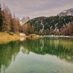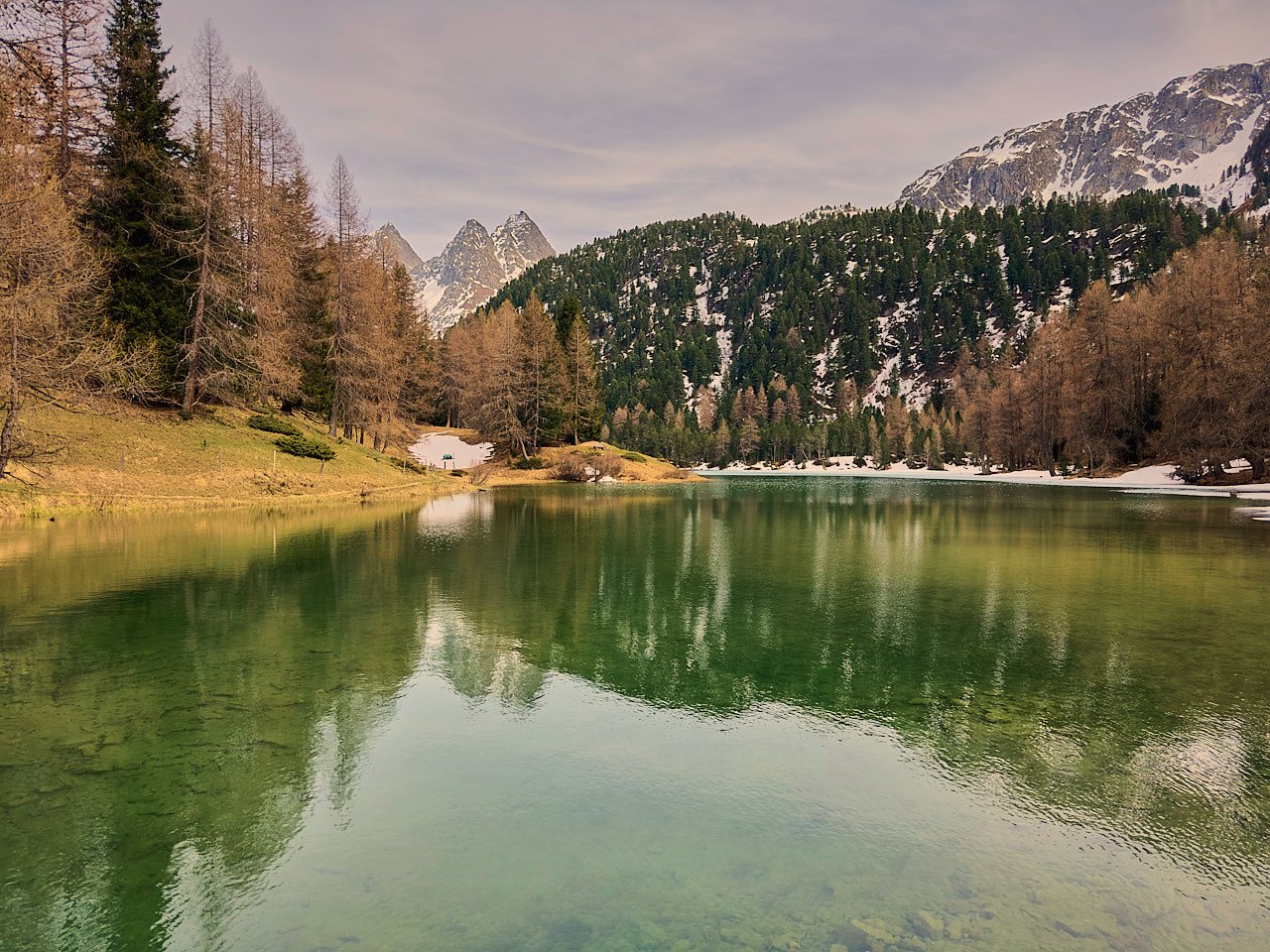 Ich rechnete eigentlich fest damit, nur bis Preda zu kommen und spätestens bei der üblichen Schneedecke hinter der ersten Schranke umkehren zu müssen. Das Tiefbauamt Graubünden hatte aber schon ganze Arbeit geleistet und die Strasse hinter der Absperrung bereits vorgeräumt. Also kurbelte ich weiter und erreichte wenige Kurven später den idyllischen, noch teilweise gefrorenen Lai da Palpuogna.